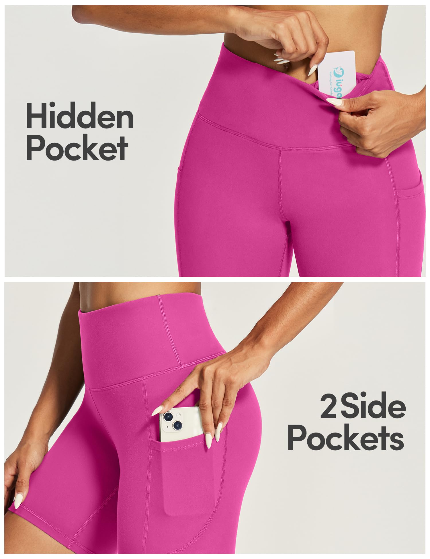 Being Hands-Free is Everything. IUGA Athletic Shorts feature 2 side pockets and 1 inner pocket in the waistband, allowing you to easily stash your phone or keys without weighing the shorts down. Now, no more worry about exercising with something in your hands. The IUGA women's yoga shorts will be your ideal choice for workouts.