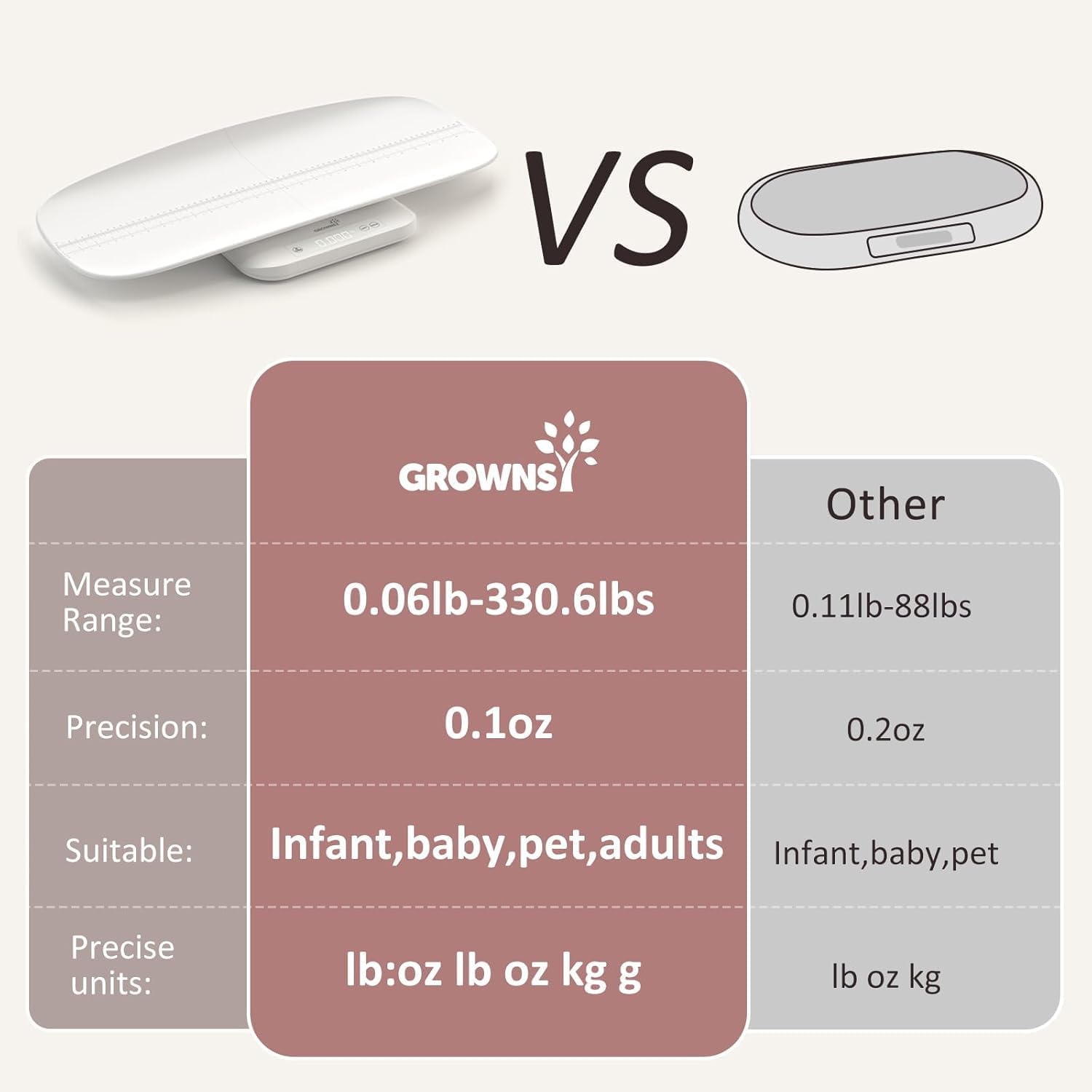 𝐄𝐚𝐬𝐲 𝐭𝐨 𝐔𝐬𝐞 𝐚𝐧𝐝 𝐒𝐭𝐨𝐫𝐞: With a touchscreen button, auto-off function after 2 minutes of no operation, and detachable design, this digital scale is easy to assemble, use, and store. Grownsy's baby scale is the perfect companion for monitoring your baby's growth and development with ease.