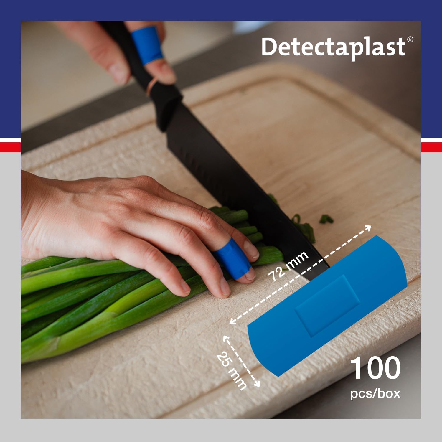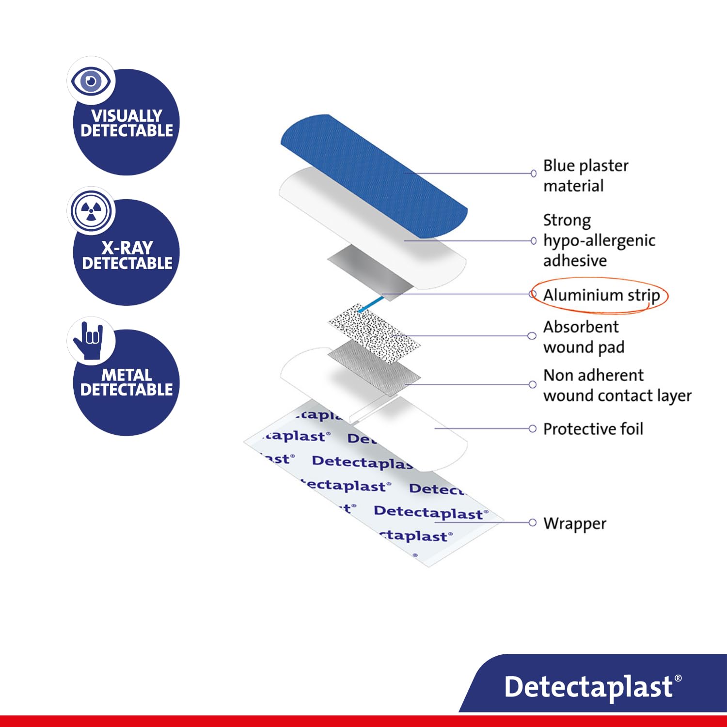 METAL DETECTABLE Thanks to its blue colour and aluminium strip, the bandaids are visually and electromagnetically detectable. They can be quickly taken out of the production process. The bandaids first aid are indispensable in catering equipment.