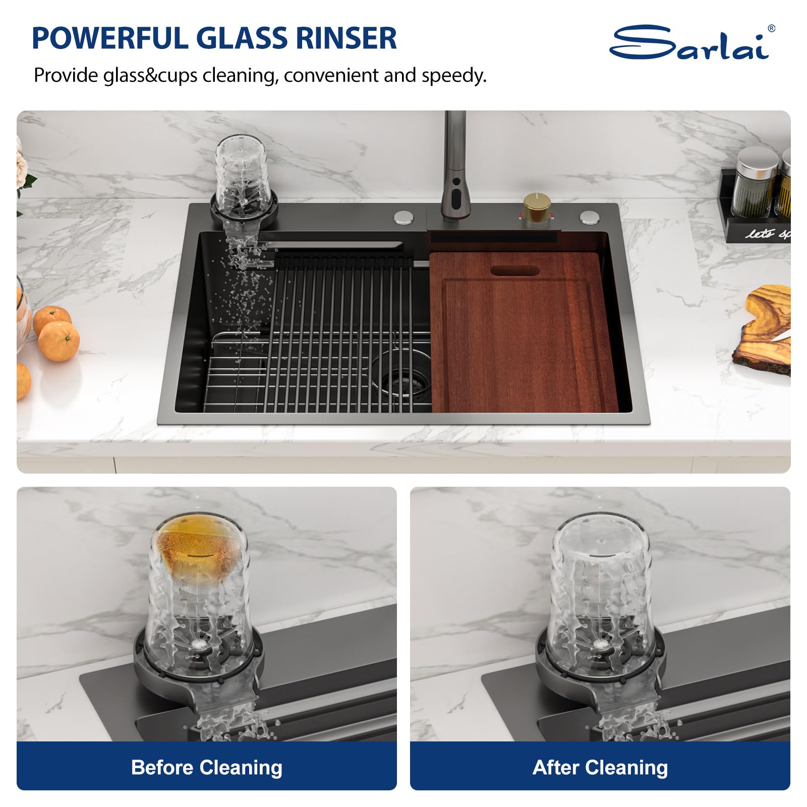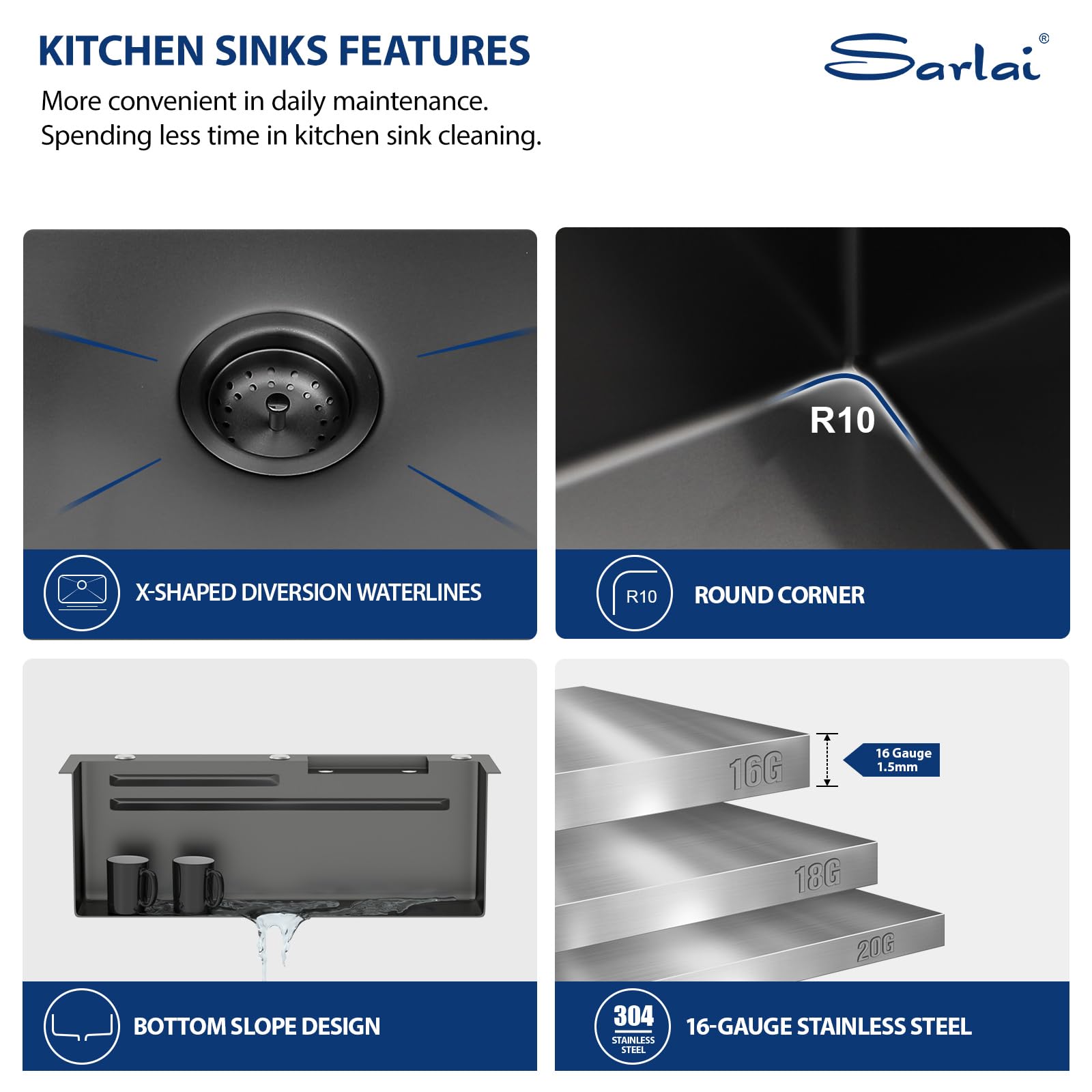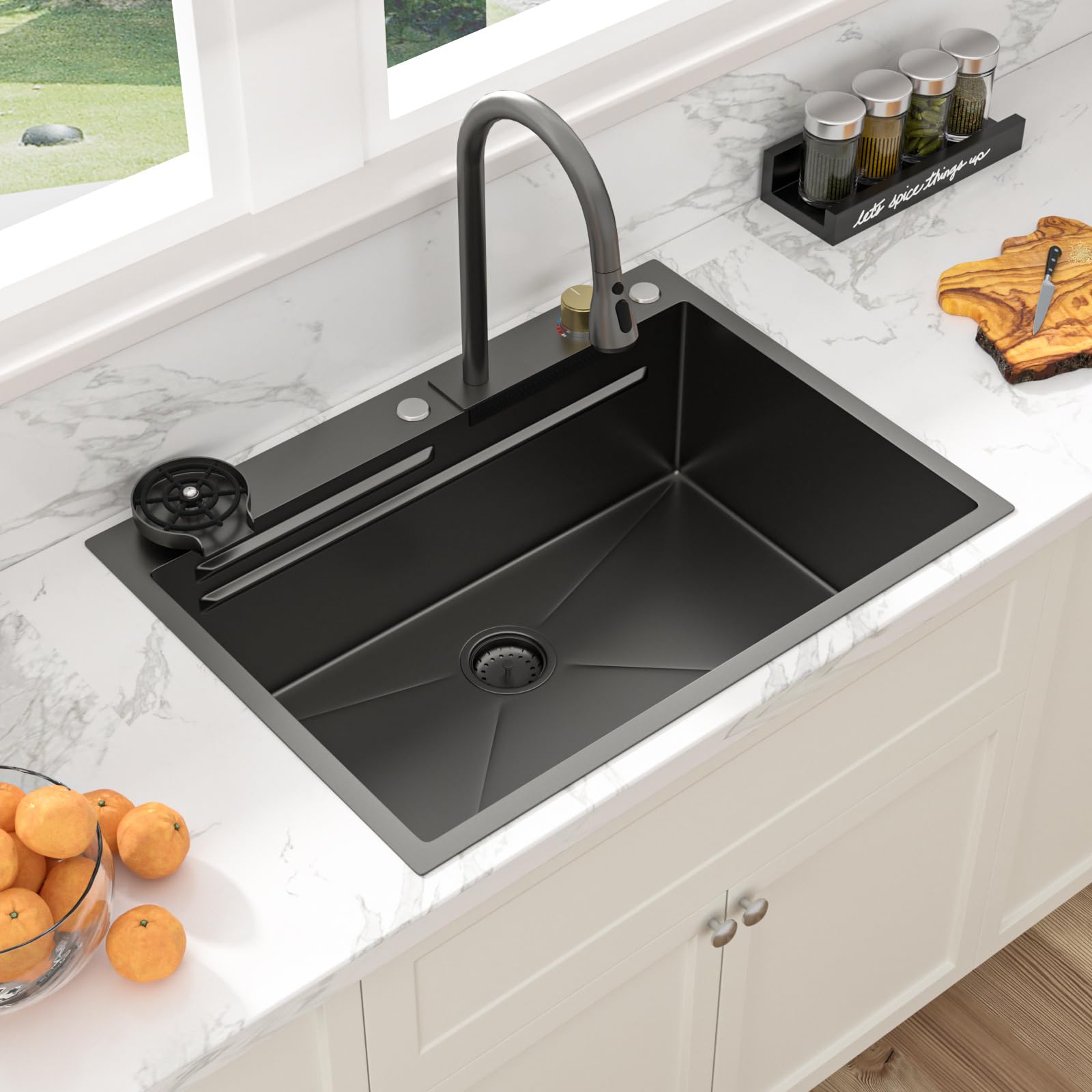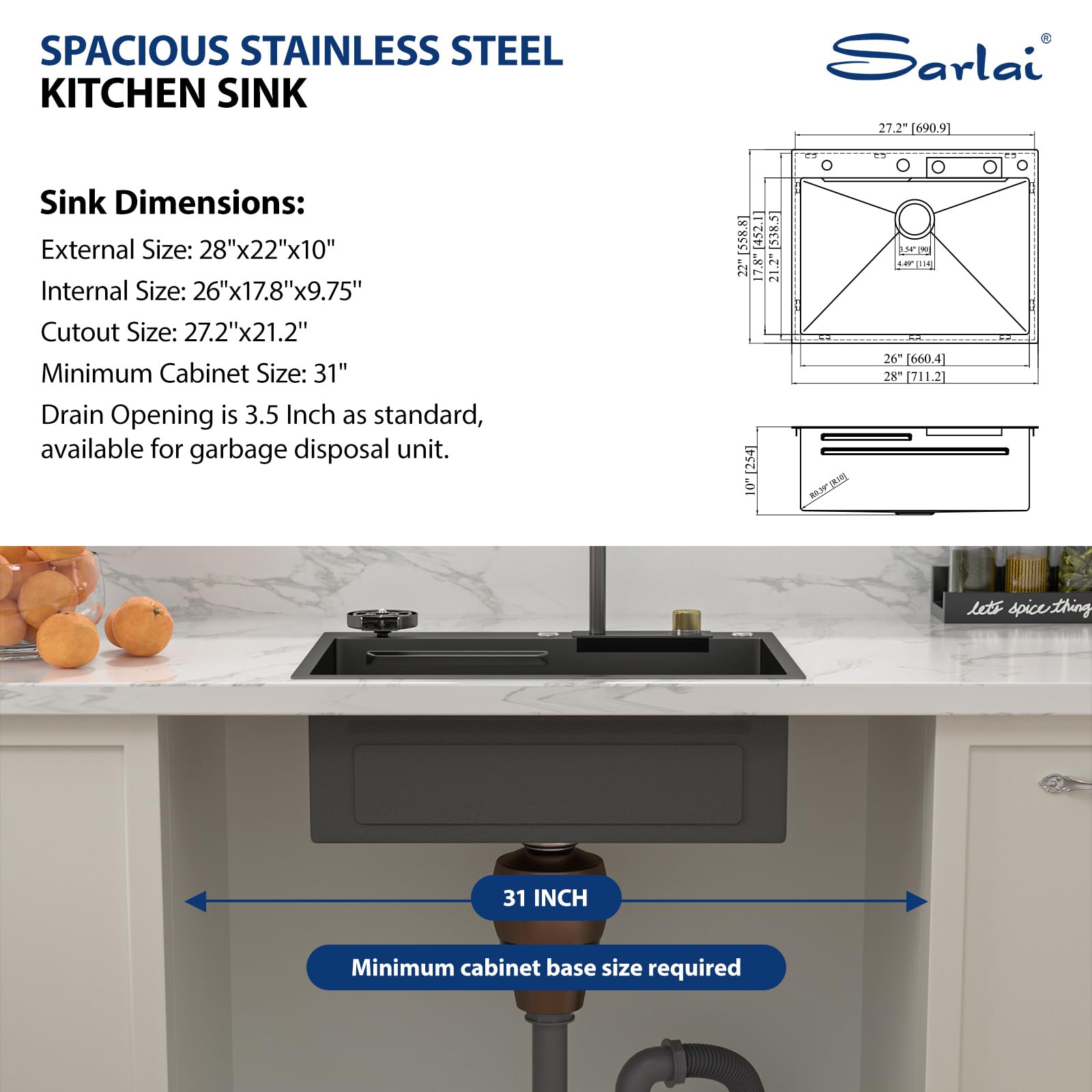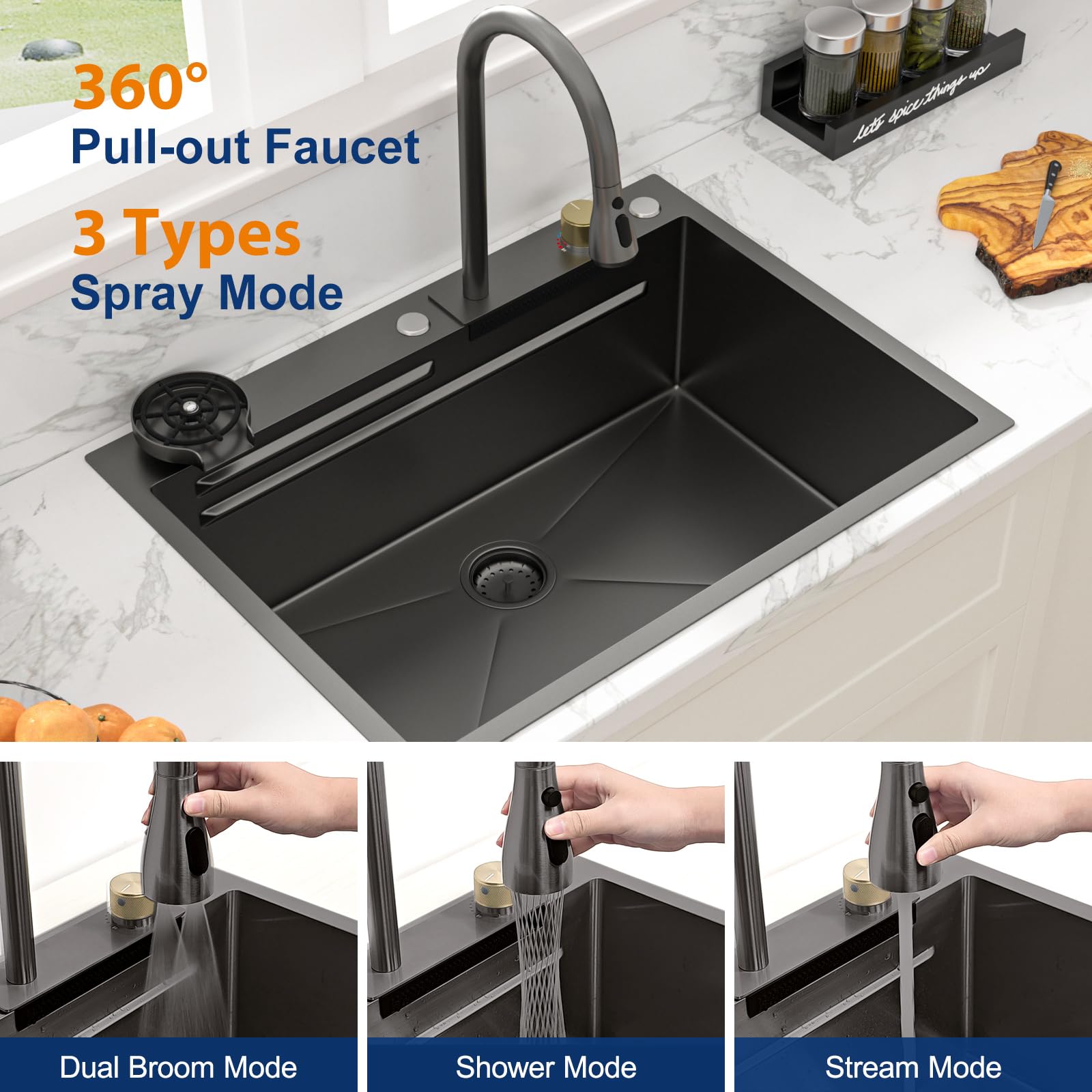 Premium Gunmetal Nano Construction: Crafted from genuine 16-gauge T304 stainless steel, the Sarlai 28 inch waterfall kitchen sink offers unmatched strength and durability.The nano coating commercial-grade brushed finish resists stains and scratches, ensuring long-lasting beauty and easy cleaning.