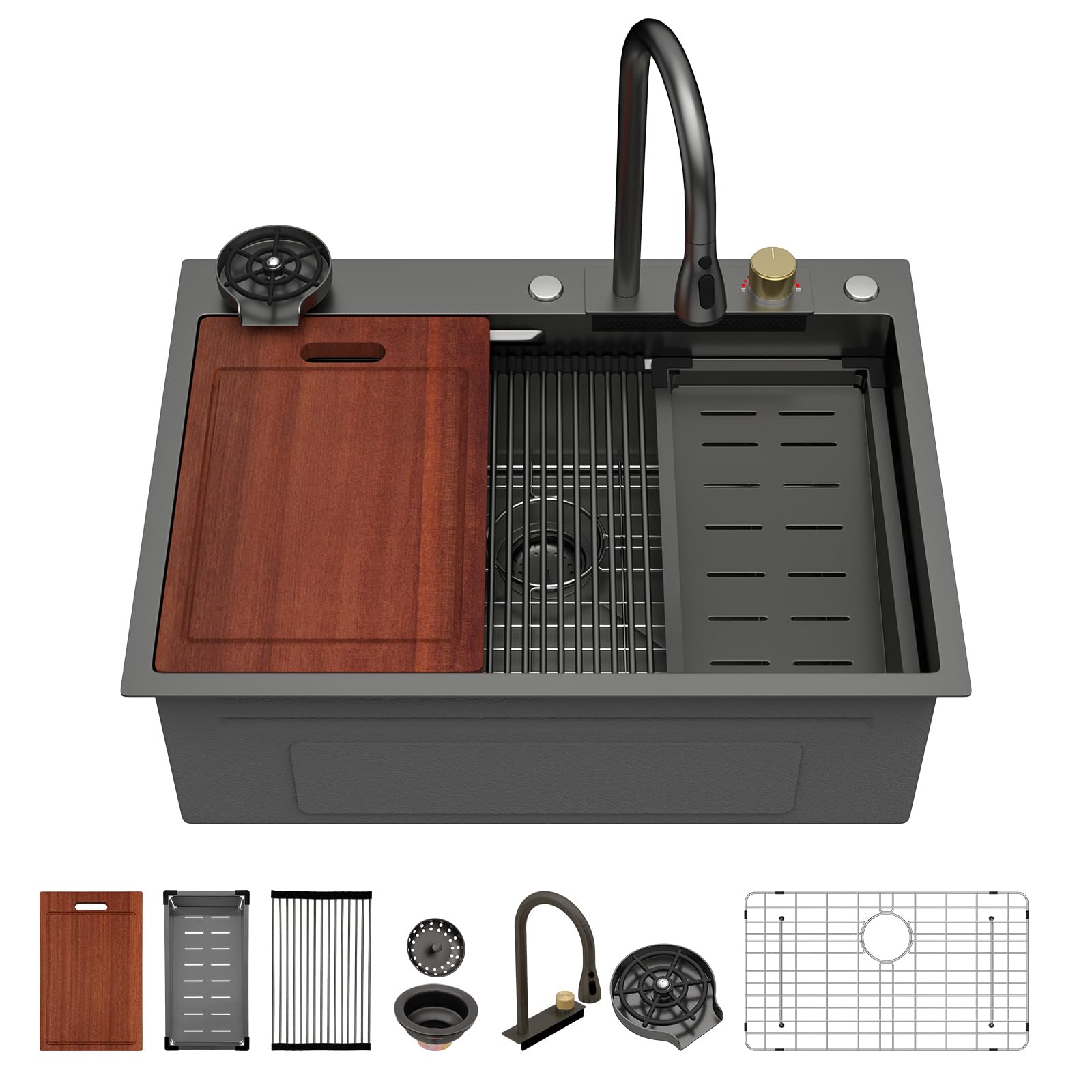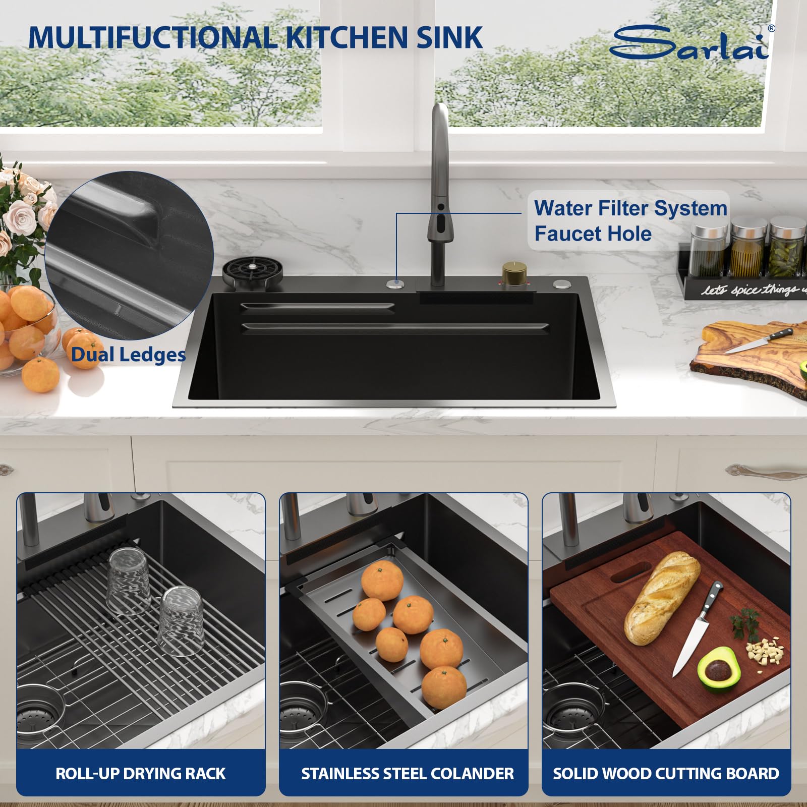 Multifunctional Waterfall Drop in Kitchen Sink : Sarlai waterfall drop kitchen sink constructs with waterfall spout, pull-out faucet, cup-rinser. up and down dual ledges overhanging lips on the front and back as two tracks for sliding the built-in accessories. The faucet with three modes(stream, shower, dual broom) enable it complete different using needs. Built in cup rinser can help clean cups faster.These special designs convert your kitchen into a smart workspace.