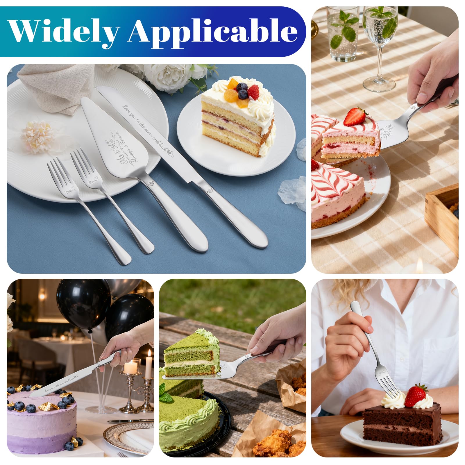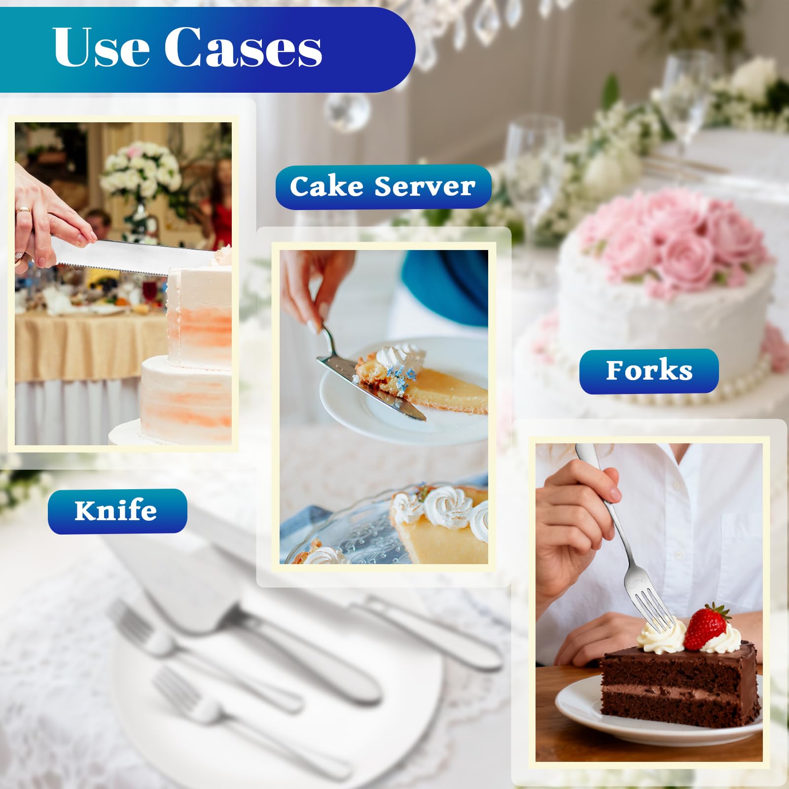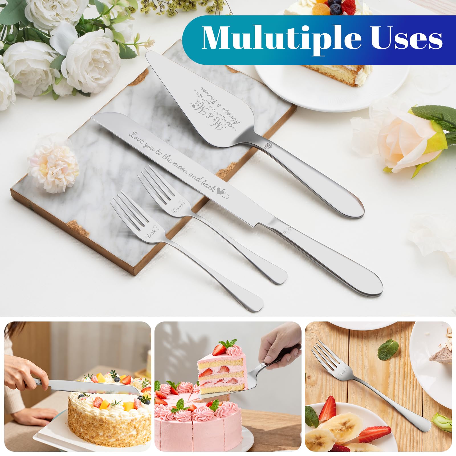 Widely Use: A silver cake knife, cake server and forks are packaged in a exquisite giftware box. Appropriate for serving cake, quiche, pizza, lasagna