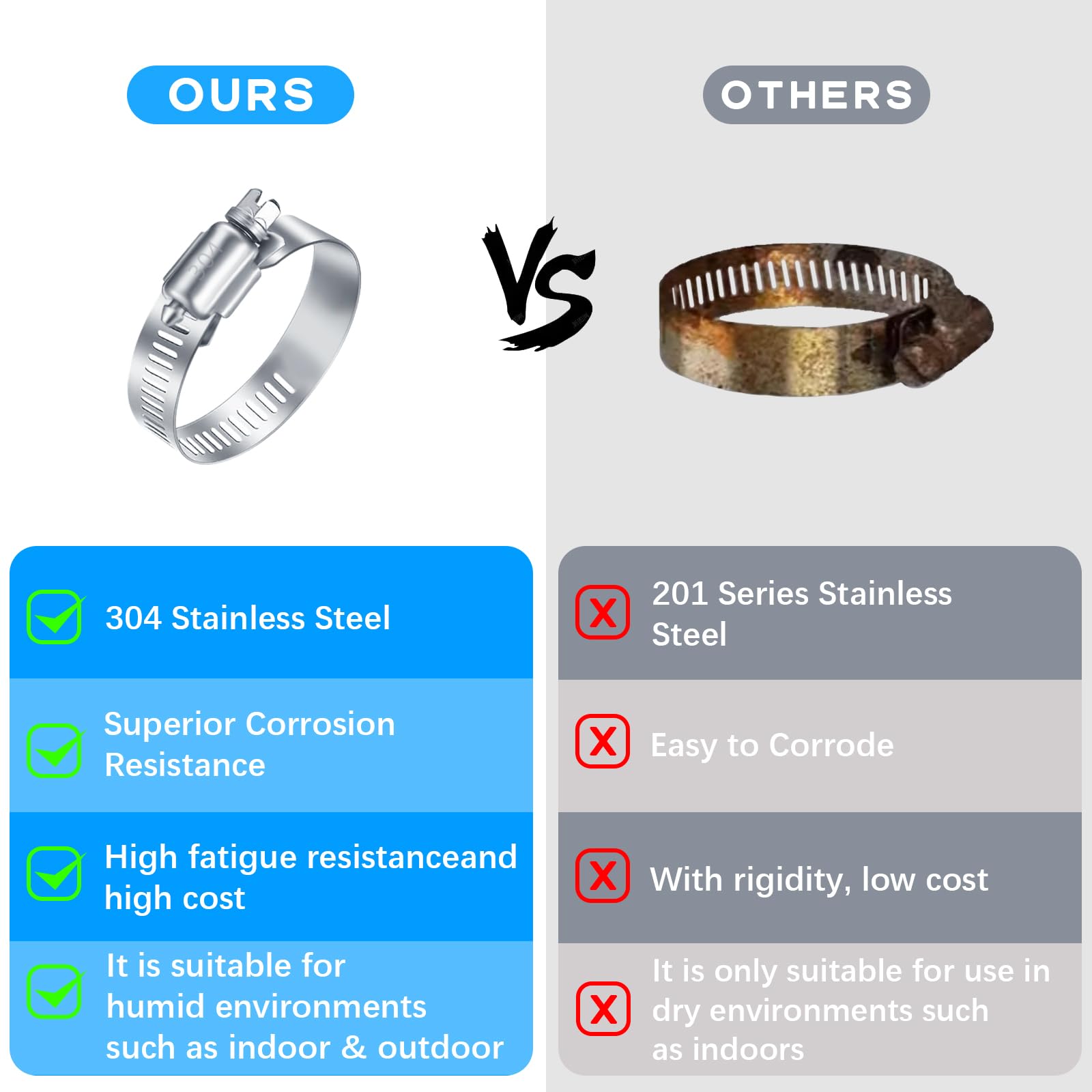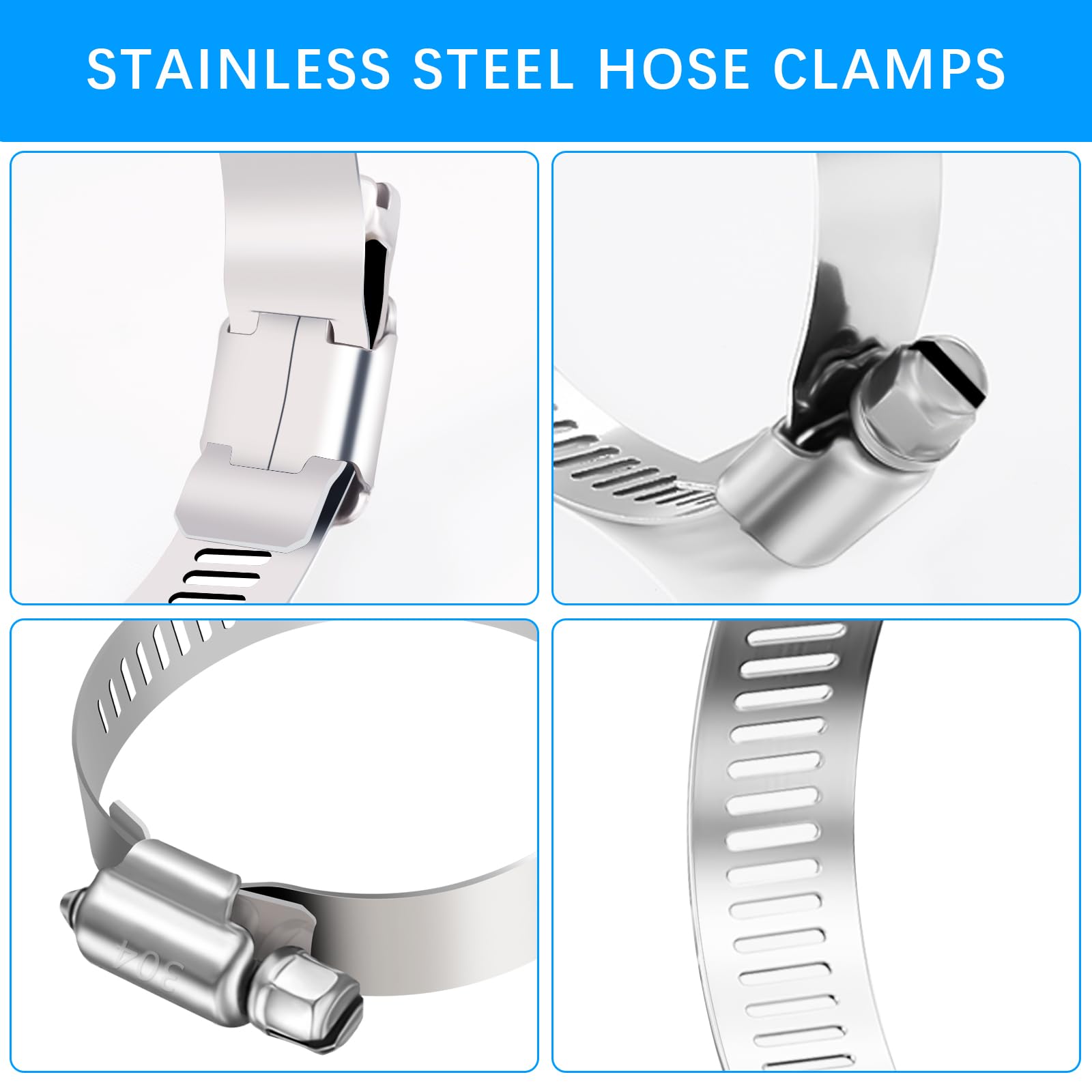 【PREMIUM MATERIALS】Our adjustable hose clips are made of outstanding stainless steel material,Built to last,The pipe clamp structure is sturdy and can resist corrosion to the maximum extent possible. It also has waterproofing, ensuring long-lasting performance. It is an ideal choice for fixing hoses in various applications