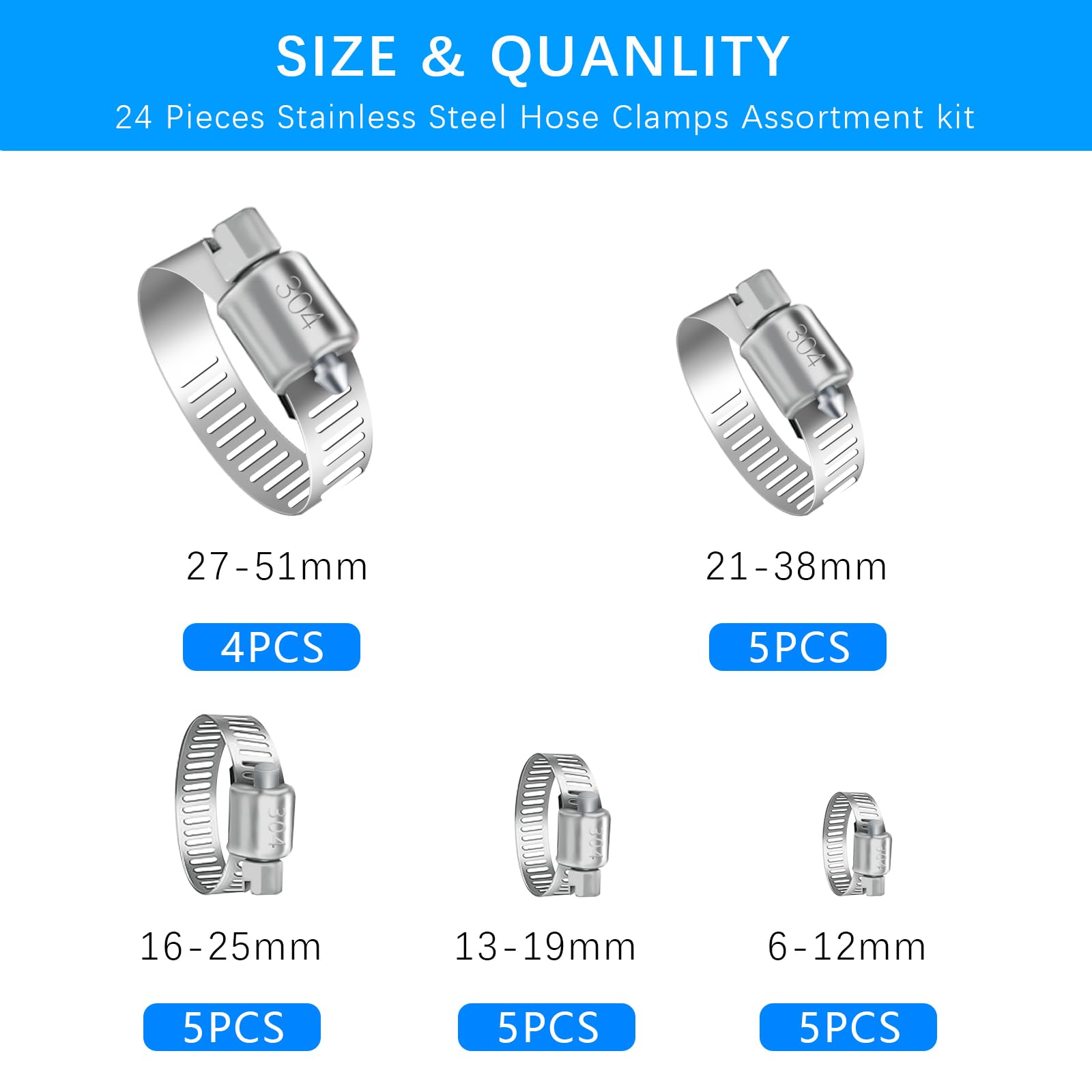 【VERSATILE SIZES】YUCDXFV provides stainless steel hose clamps with flexibility and extensibility, ranging in size from 6mm to 51mm, including 5 different sizes: 6-12mm, 13-19mm, 16-25mm, 21-38mm, and 27-51mm. Small hose clamps are widely used and can basically meet your daily needs