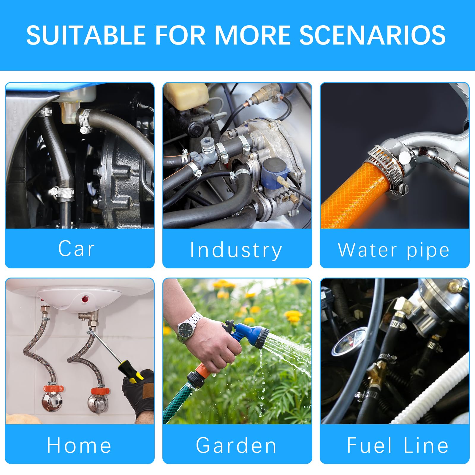 【WIDE APPLICATIONS】 High quality stainless steel hose clamps are durable and suitable for securing home applications, automotive, industrial, plumbing, cable, water and fuel lines. These hose clamps can meet your needs in different scenarios of use