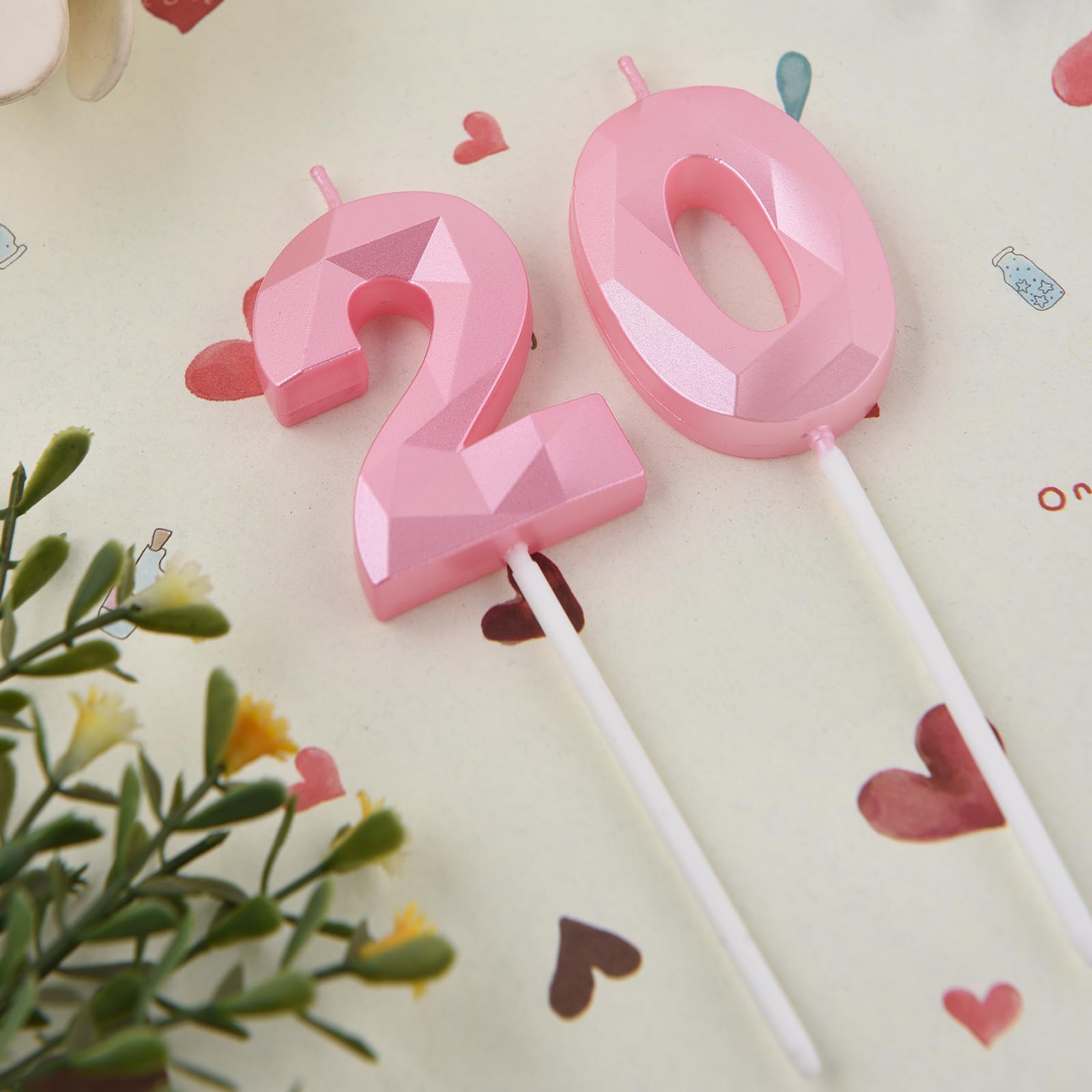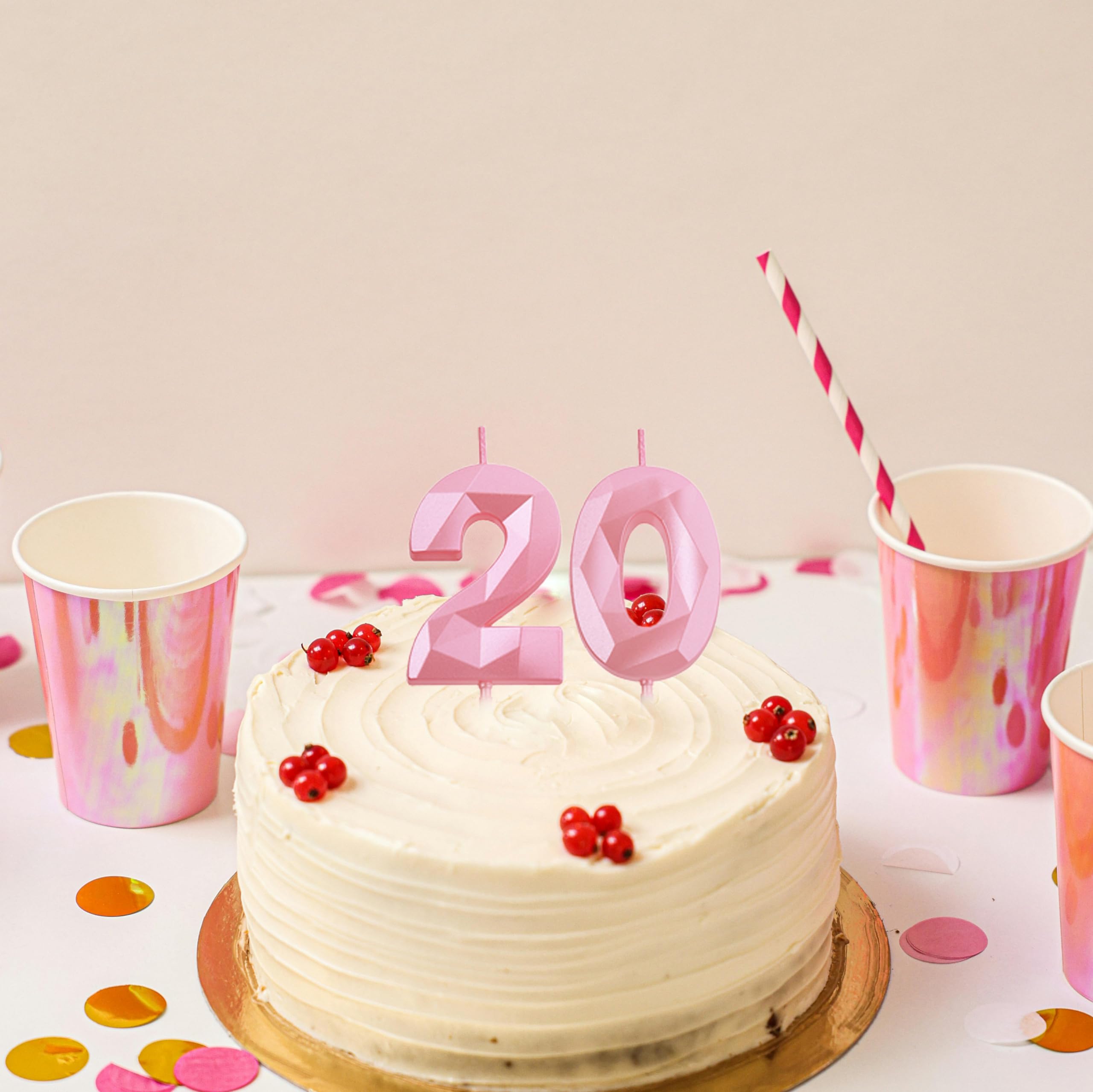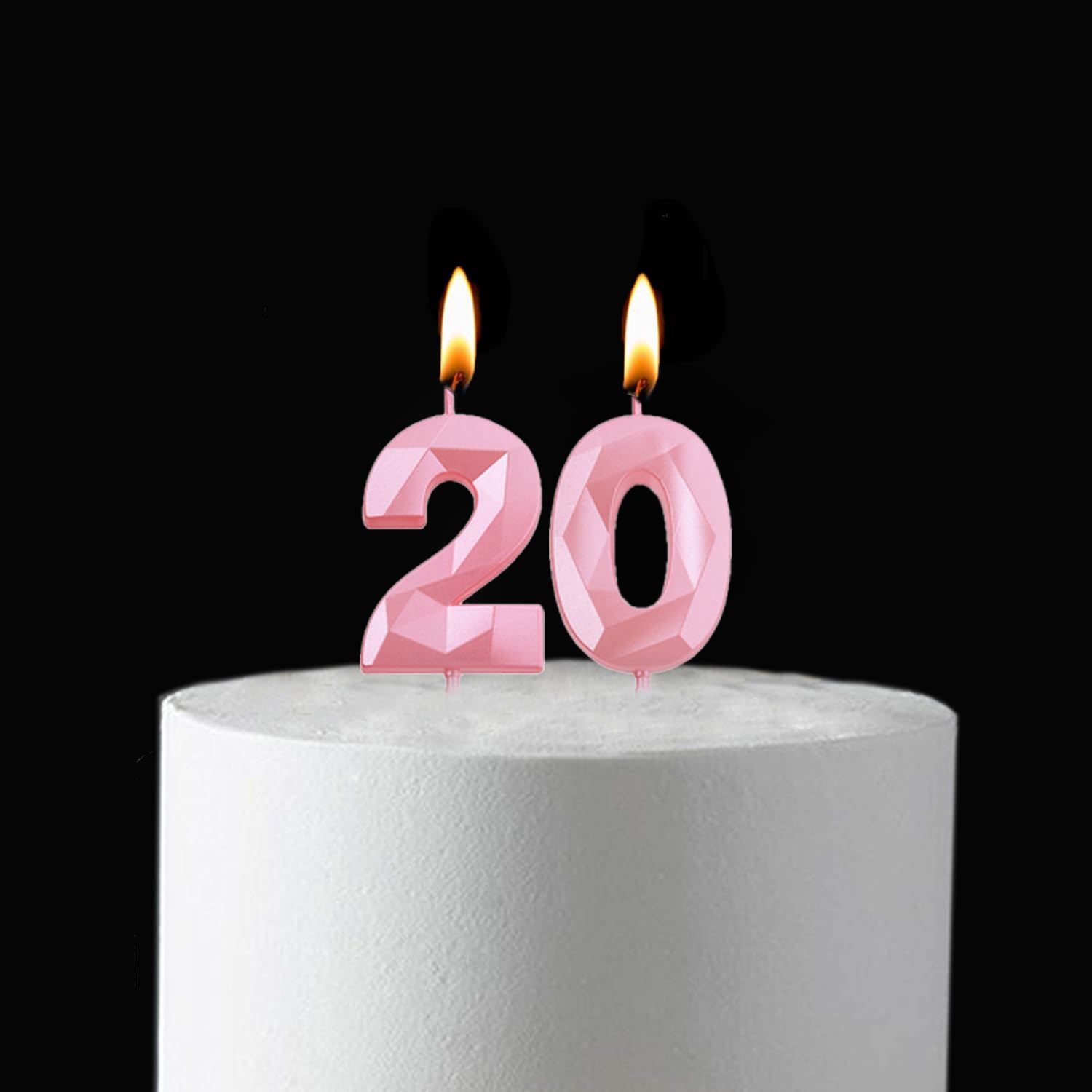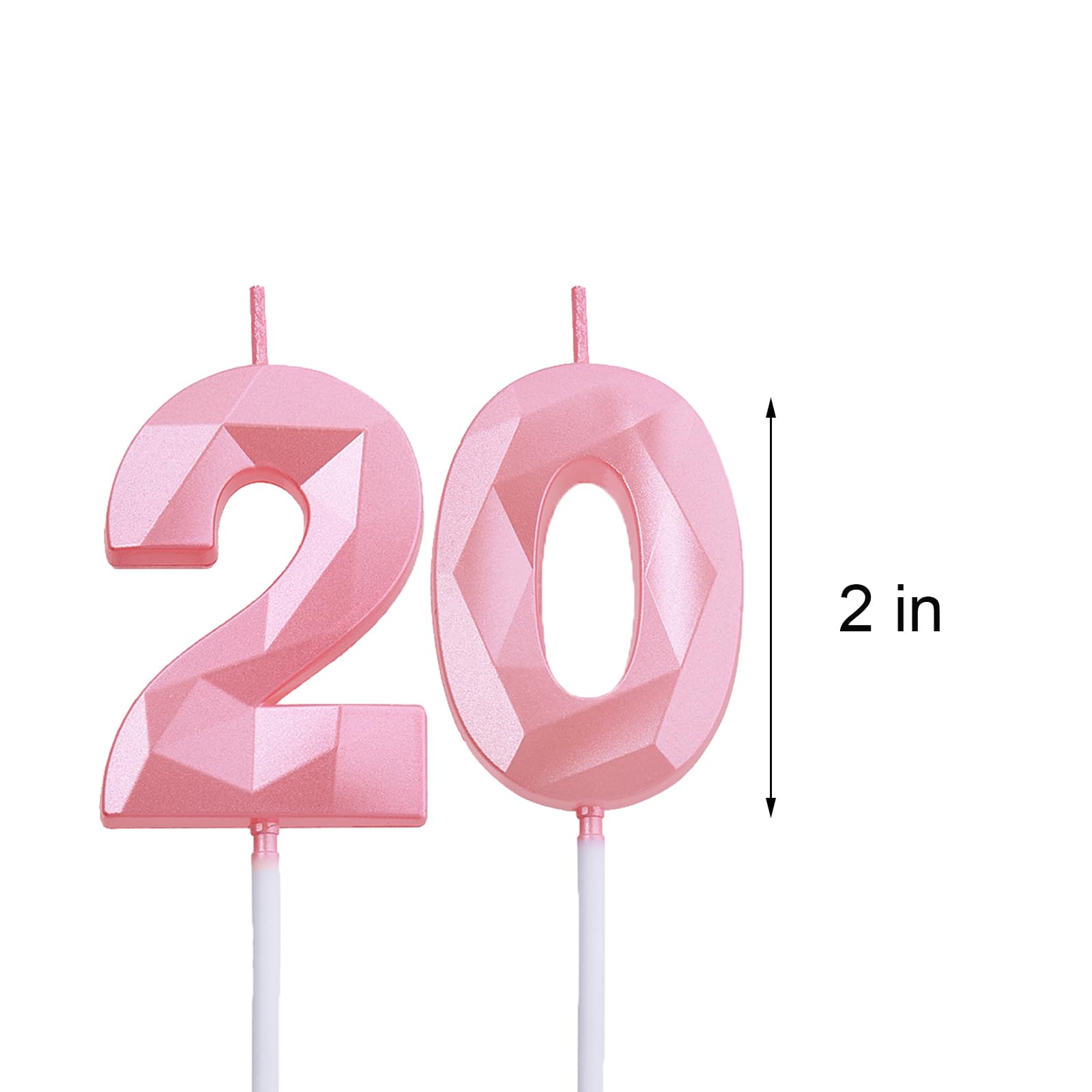 INSTRUCTIONS: Package Include: 2 pcs candles,Number 20 birthday candles Color : Glitter Pink Material : quality wax ,smokeless and non-toxic Size: Width:1.4 in. Number height: 1.97 in. Total height: 4.9 in Please Note : Warm Note:Please keep the candles in shade away from the fire