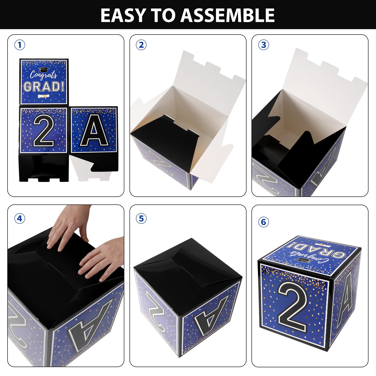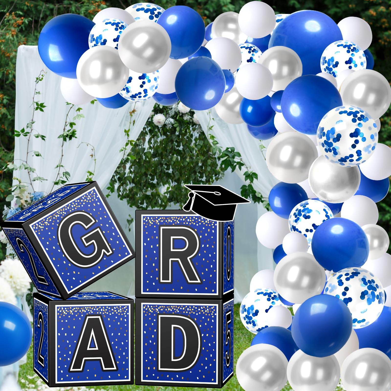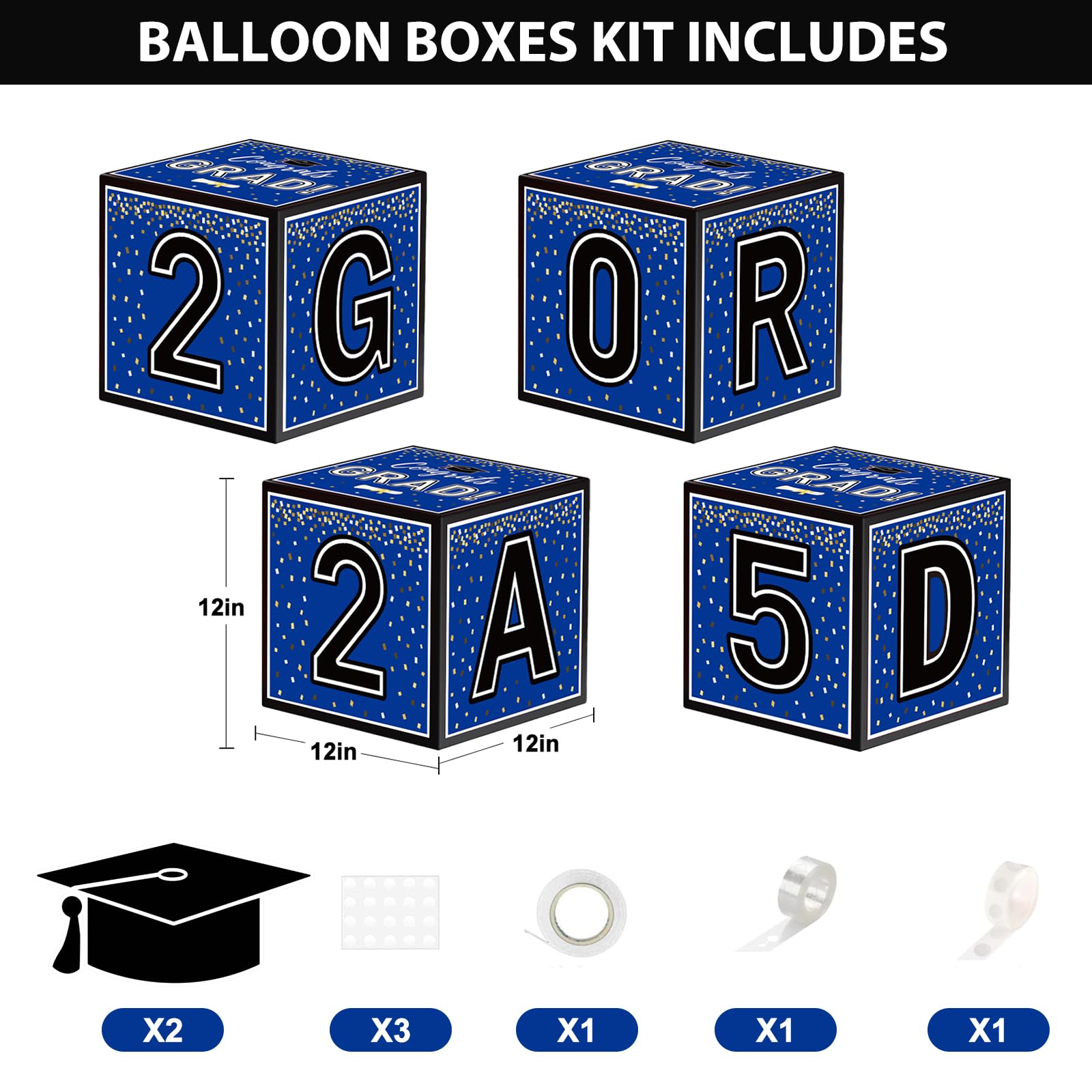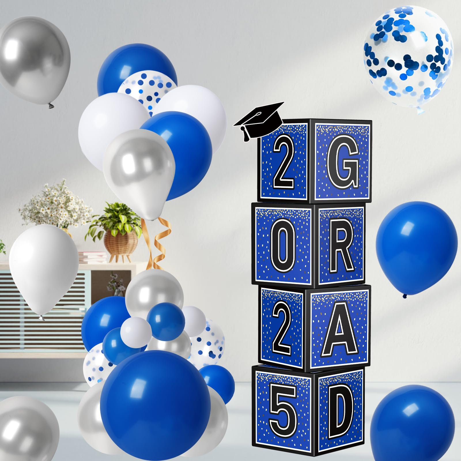 Graduation Party Decorations: Includes 4 Blue graduation boxes with '2025 GRAD' letterings, 144 latex graduation balloons, graduation hats, 3 sheets of glue dots, 1 roll ribbon, 1 roll glue dots, and 1 garland strip.