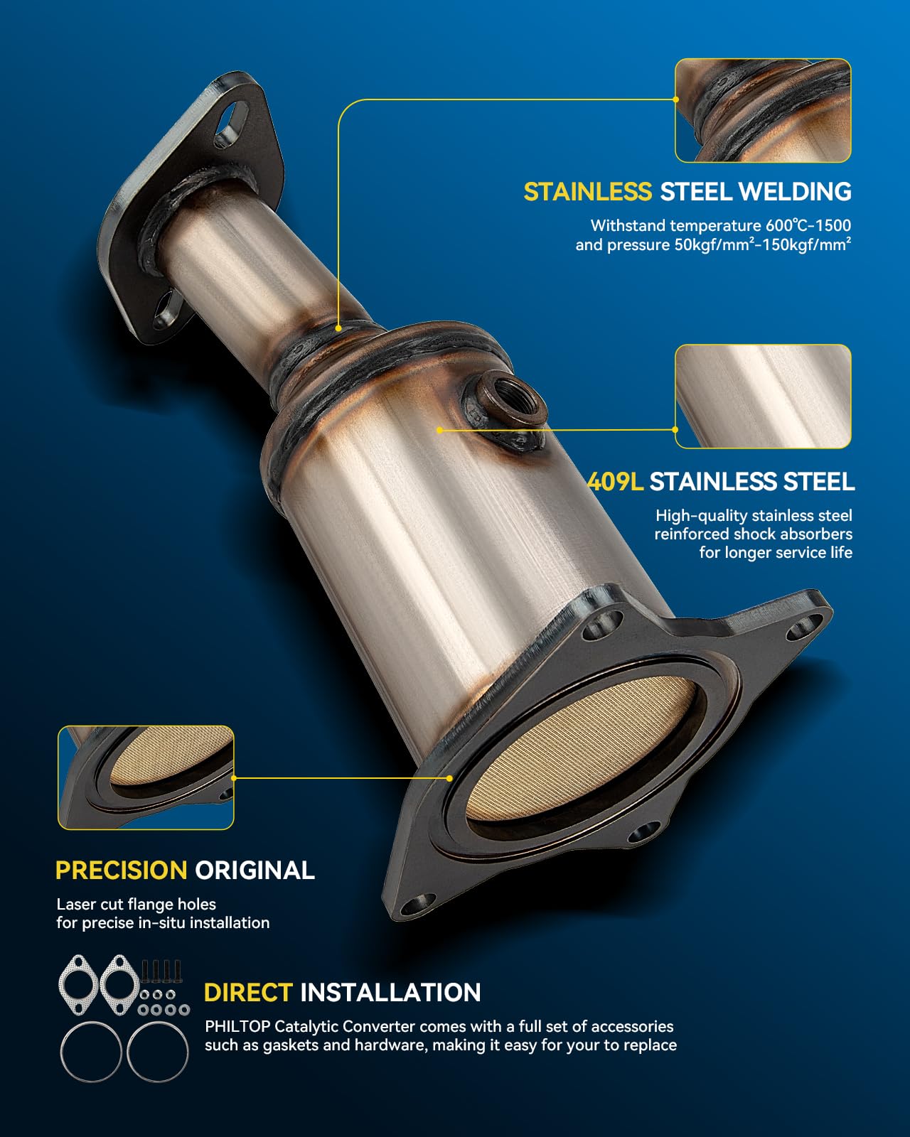 Direct Fit Design:Direct-Fit high flow catalytic converter is designed to meet or even exceed OE quality and performance standards. And all installation holes are firmly and exactly fixed with attached gaskets and hardware.