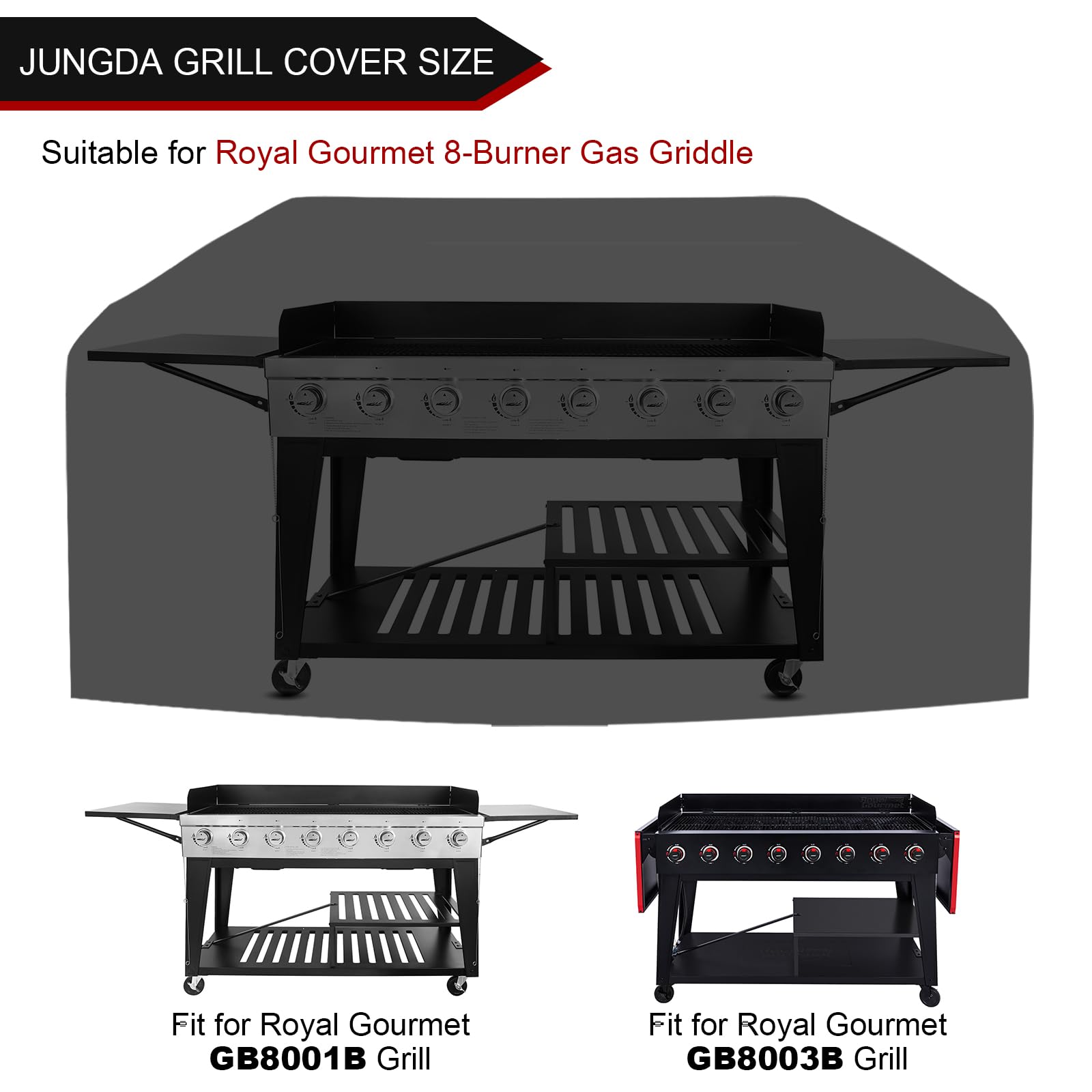 Size: 90"L x 27"W x 37"H; The grill cover is compatible with royal gourmet gb8001B gb8003B 8-burner gas grill and other griddles with similar size; Note:Please measure your furniture before purchasing