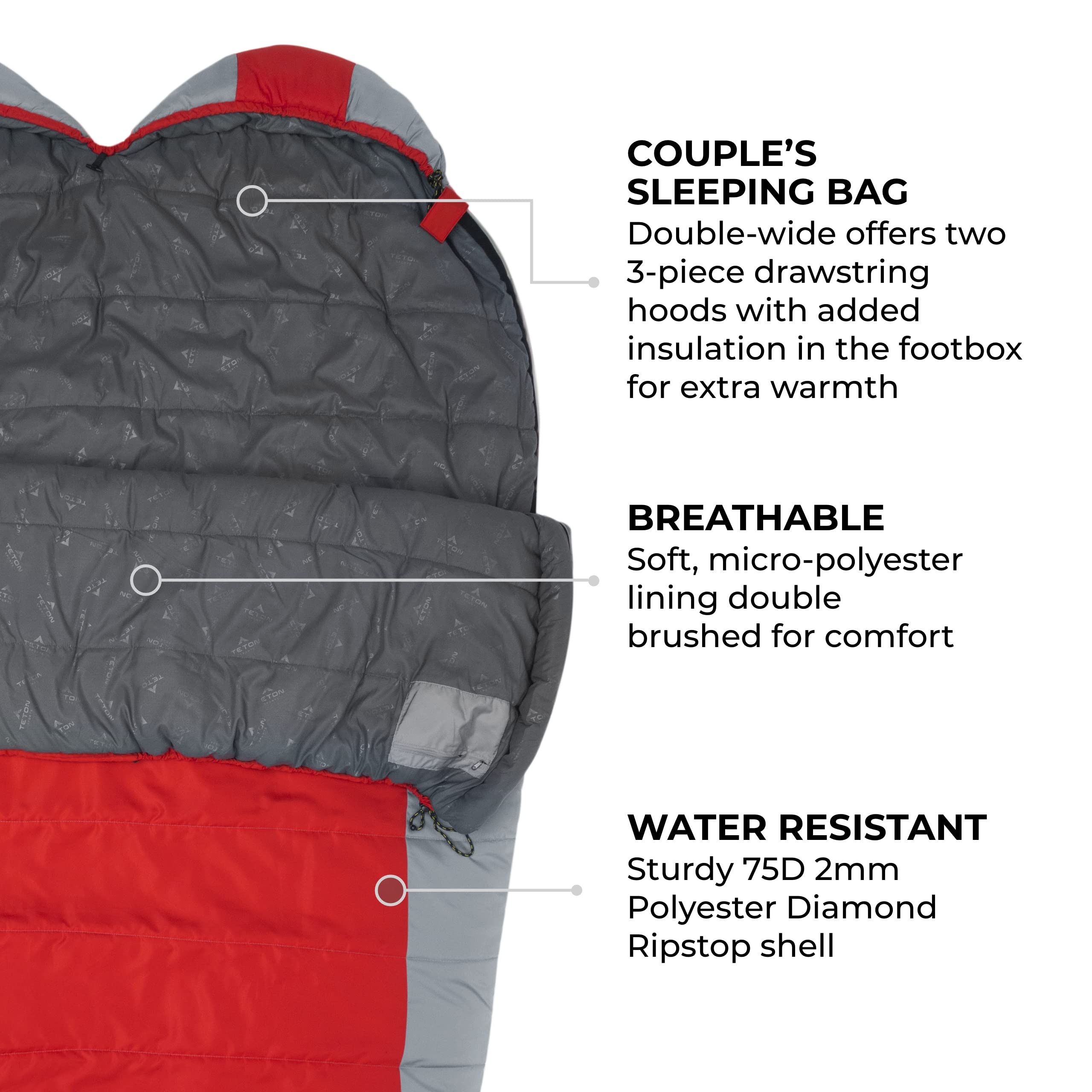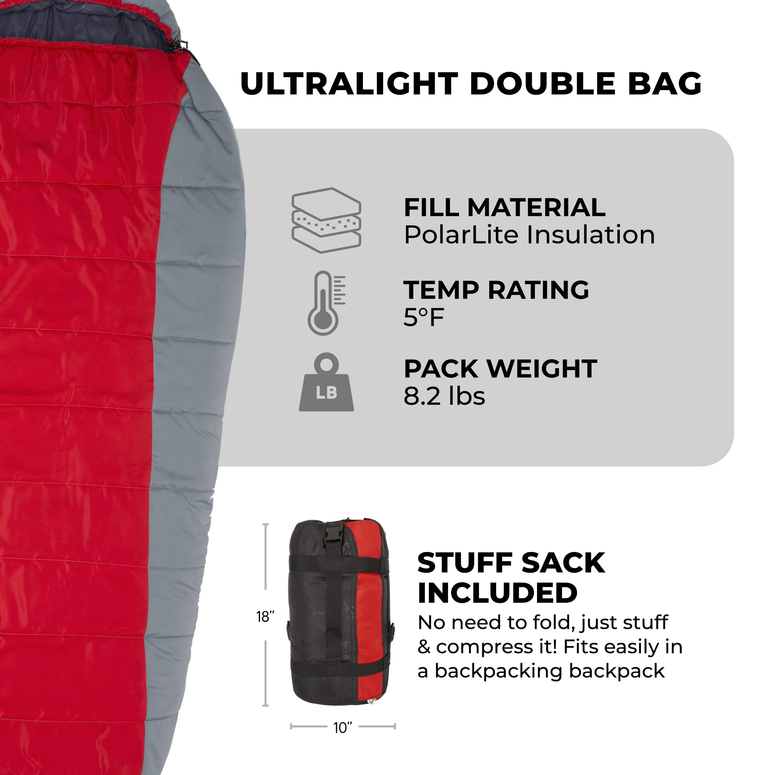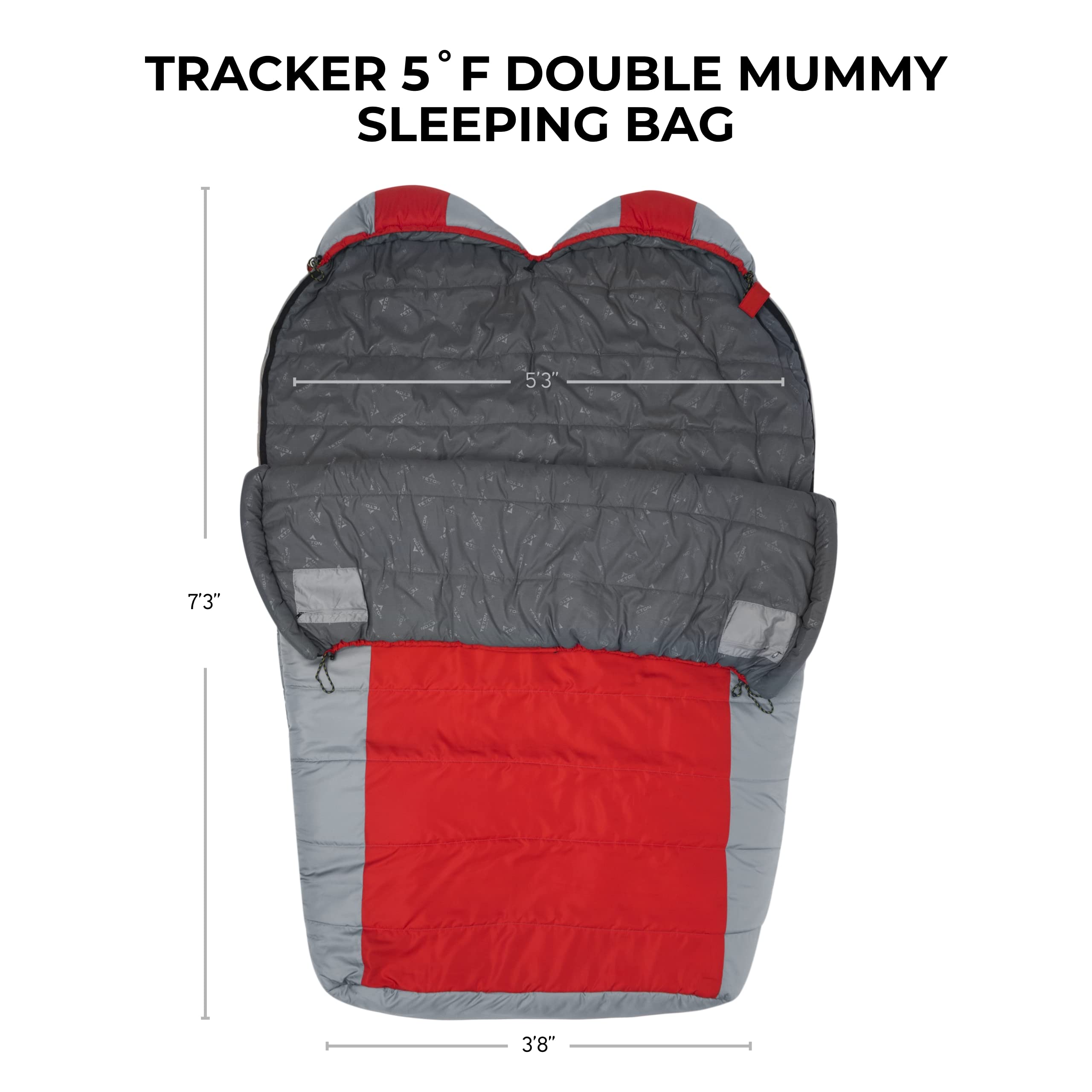 When you wait all week to go hiking into the unknown with that special someone by your side, you need a double bag that is comfortable, lightweight, and ready for the adventure. The TETON Sports Tracker +5°F/-15C Double-Wide Mummy Bag is lined with PolarLite insulation that keeps both of you warm even though the entire bag is thin and light. The 3-piece hoods pull in perfectly around the face. Bag includes body mapping to keep you warm in all the right places (especially your feet) and has a vaulted foot-boxes for comfort. Thermal enhancing, double-layer construction works with full-length zipper draft tubes to eliminate cold spots. Zippers inside and outside of bag are anti-snag to make closure easy. Includes its own compression sack for easy transport.
