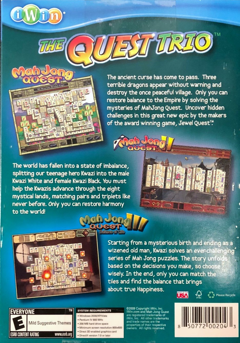 3 Addictive MahJong Quests in 1 Collection!Product InformationGet ready to set off on a trio of quests filled with exciting gameplay. The Quest Trio includes three games that combine traditional gaming challenges with fun quests that take you on intriguing journeys. Combines and epic tale of tile matching to interactive storyline and unique tiles and layouts.Product Titles IncludedMahJong QuestMahJong Quest IIMahJong Quest III Balance of LifeProduct OverviewMahJong Quest Kwazi's Quest - The ancient curse has come to pass. Three terrible dragons appear without warning and destroy the once peaceful village. Only you can restore balance to the Empire by solving the mysteries of MahJong Quest. Uncover hidden challenges in this great epic by the makers of the award winning game Jewel Quest.Features:Help Kwazi solve 60 puzzles to restore peace to the laneCinematic full-screen animationsUnique tiles with special powersOver 160 additional layouts in Classic and Puzzle modesMahJong Quest II Nature has struck back! The world has fallen into a state of imbalance splitting our teenage hero Kwazi into the male Kwazi White and female Kwazi Black. You must help the Kwazis advance through the eight mystical lands matching pairs and triplets like never before. Only you can restore harmony to the world!Features:Over 500 new puzzlesOnline tournament playA quest to establish unity and harmonyMahJong Quest III Balance of LifeStarting from a mysterious birth and ending as a wizened old man Kwazi solves an ever-challenging series of Mah Jong puzzles. The story unfolds based on the decisions you make so choose wisely. In the end only you can match the tiles and find the balance that brings about true Happiness.Features:Hundreds of all new puzzles to solve [72 plus free play and new variations modes]Compete in tournaments against people around the world6 amazi
