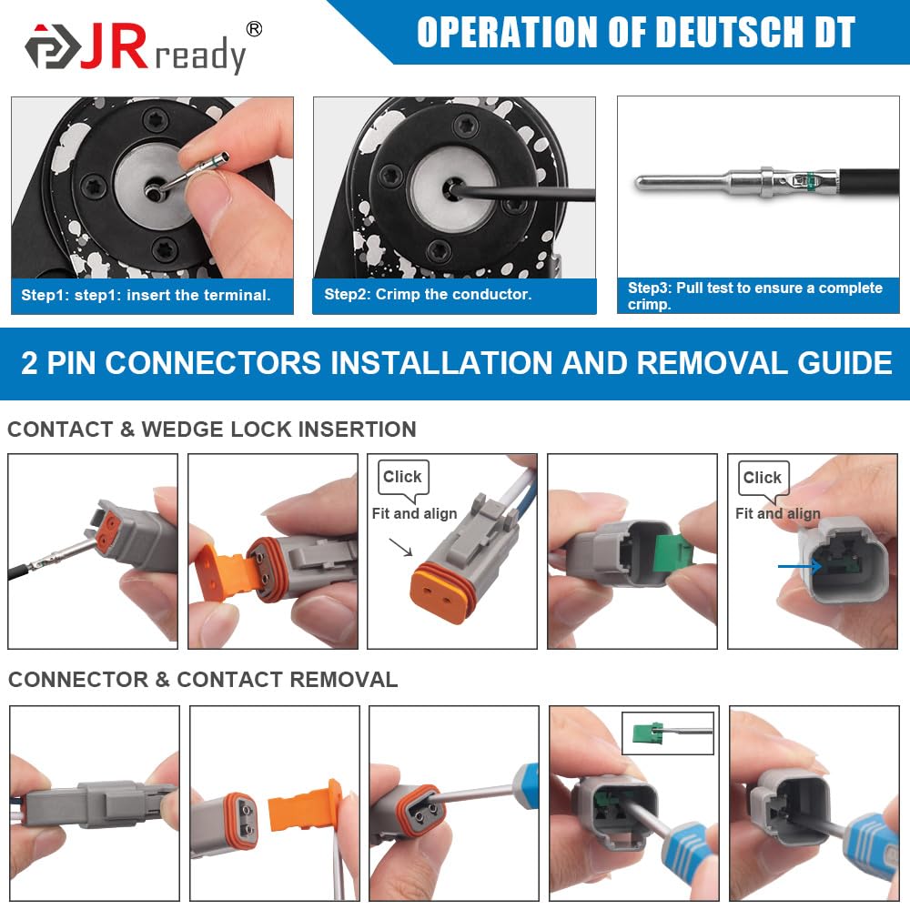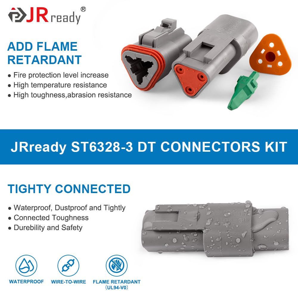 3 Pin DT Connector Versatility: JRready connectors offer reliability and performance widely used in truck, bus, off-highway, construction, agriculture, mining, emergency vehicles, forestry, recreational marine, motorcycle on the engine or transmission, under the hood, on engine controls, solenoid interfaces or in the cab.