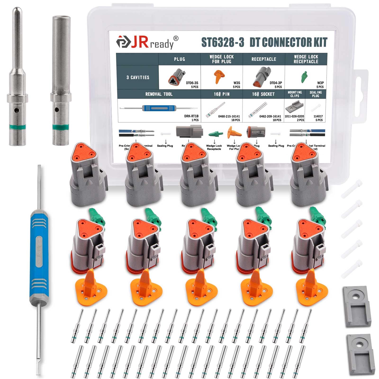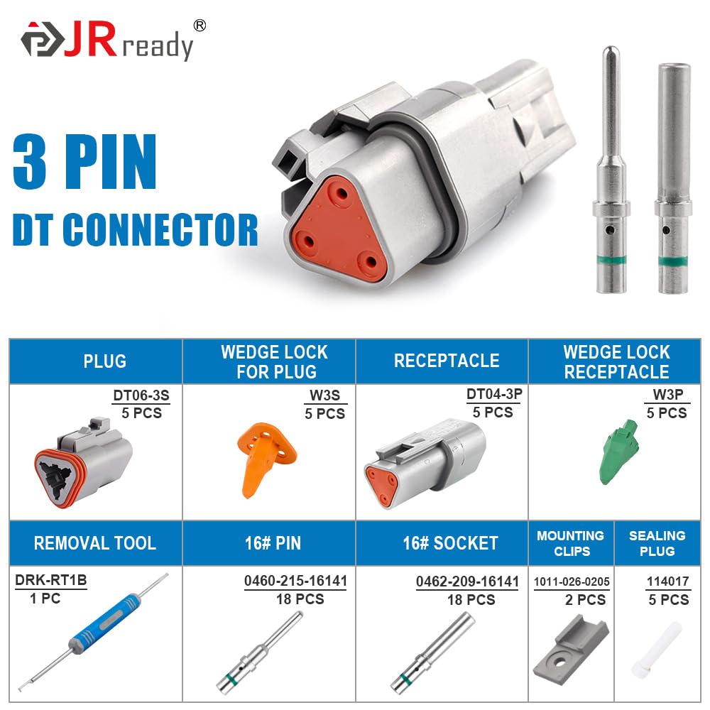 Deutsch DT Waterproof Connector 3 Pin Package Included: 18 pairs male and female solid contacts, 1 pc Deutsch connectors removal tool, 2 pcs mounting clips, 5 sets 3 pin DT connectors(5 pcs DT04-3P, 5 pcs DT06-3S, 5 pcs W3S orange wedgelock, 5 pcs W3P green wedgelock), 5 pcs seal plugs.