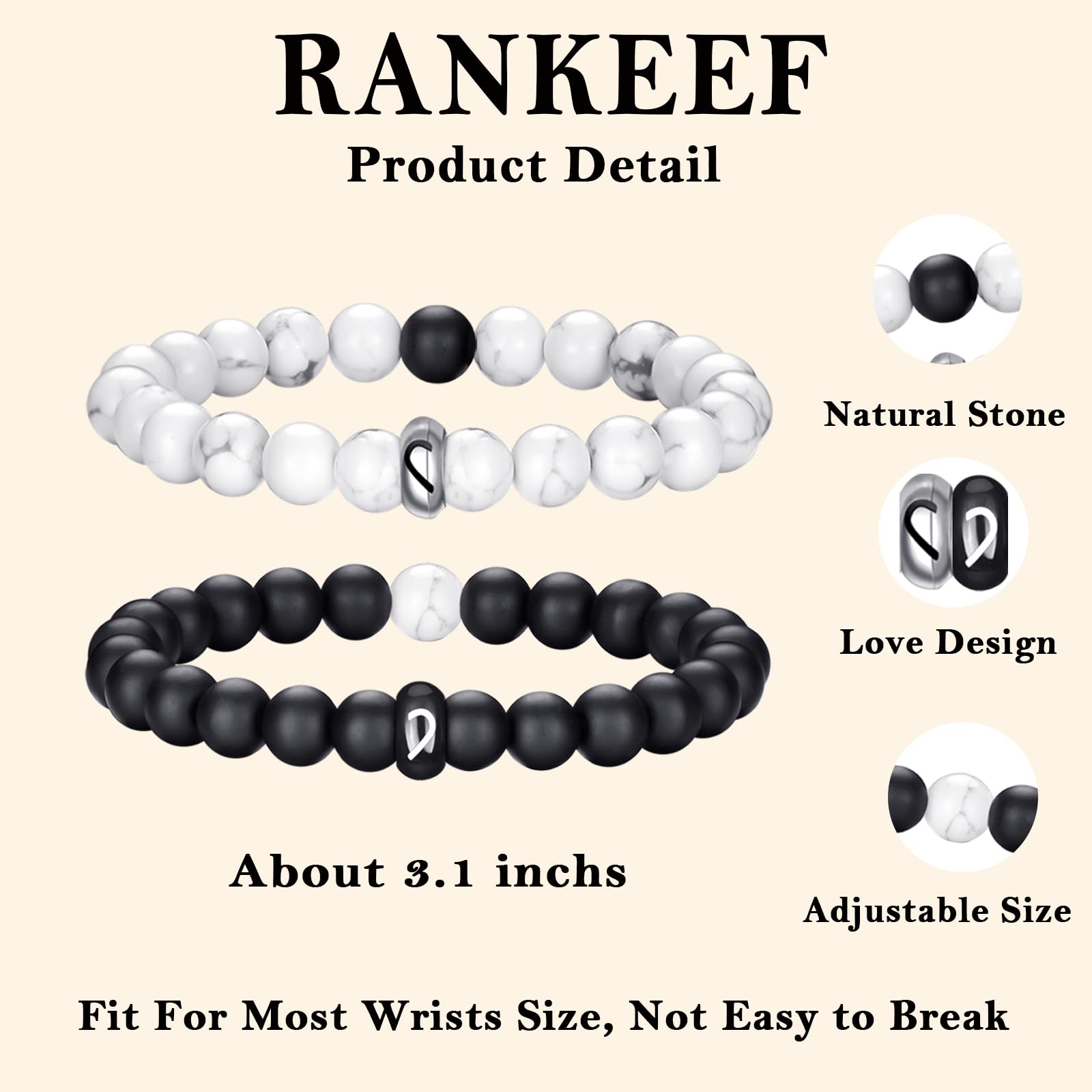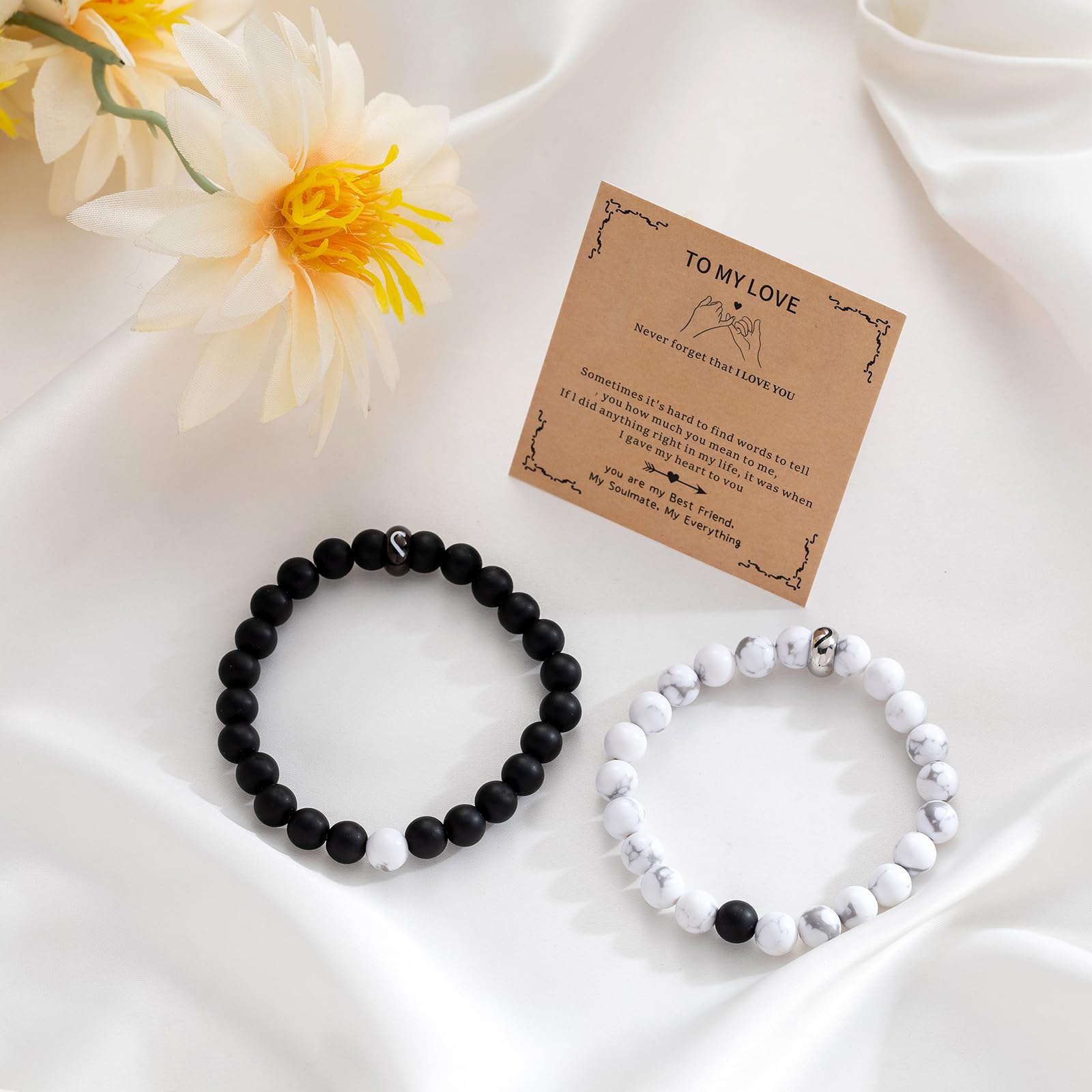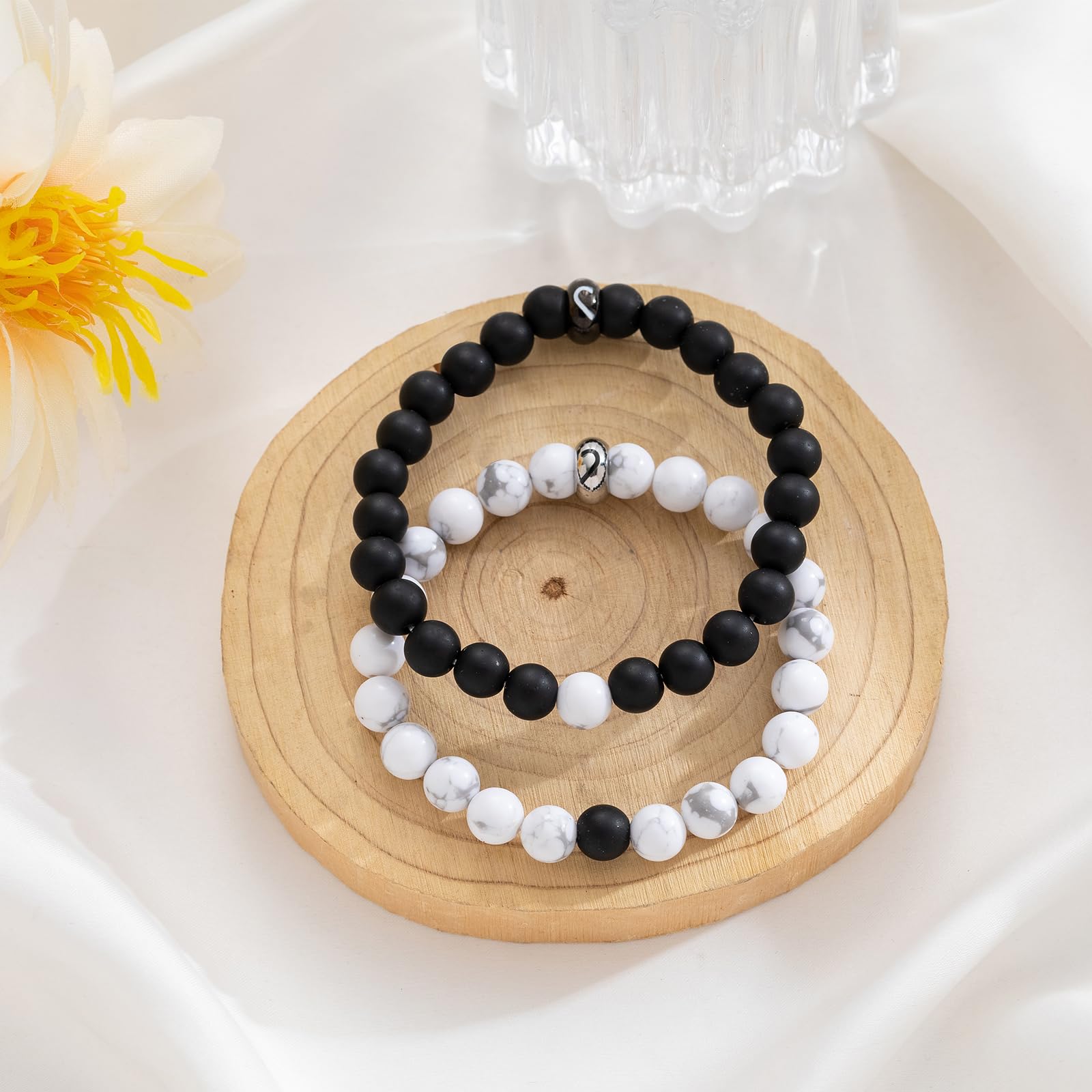 Quality Material: This bracelet couple love comes in two colors: black and white, the black one is made of black matte onyx stone and the white one is made of white limonite stone, the strong elastic cord makes the relationship bracelets for couples sturdy and durable, easy to put on and take off, suitable for any daily occasions