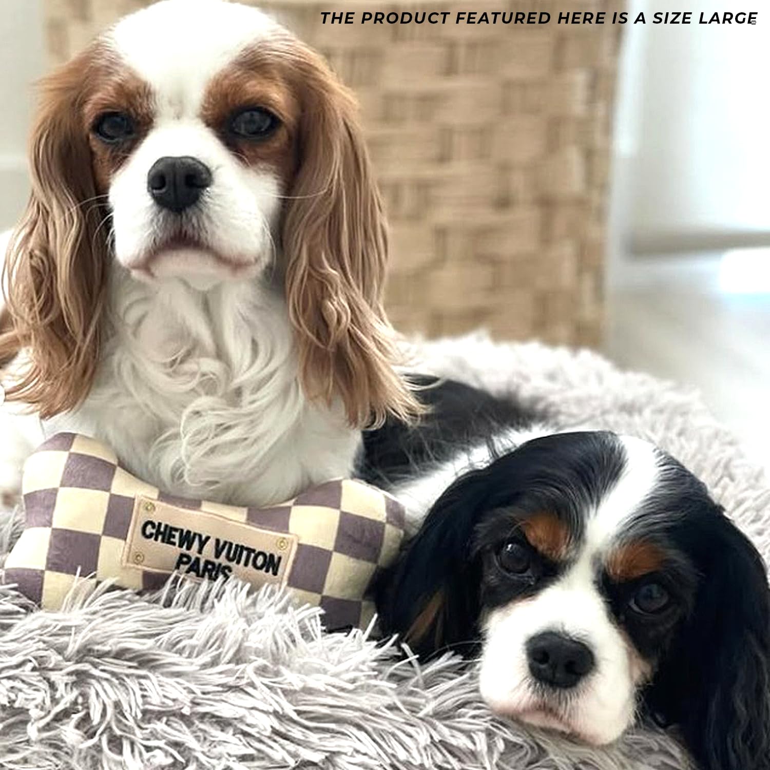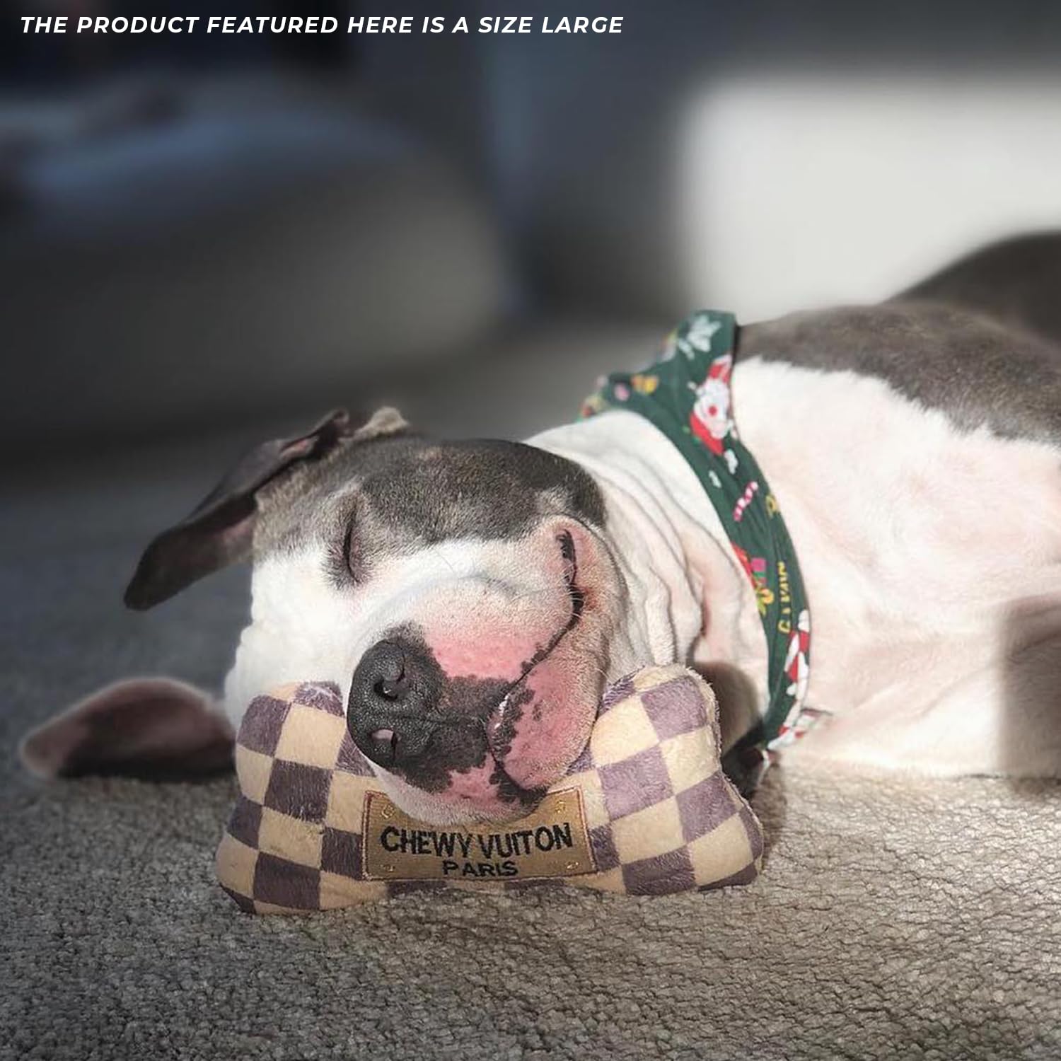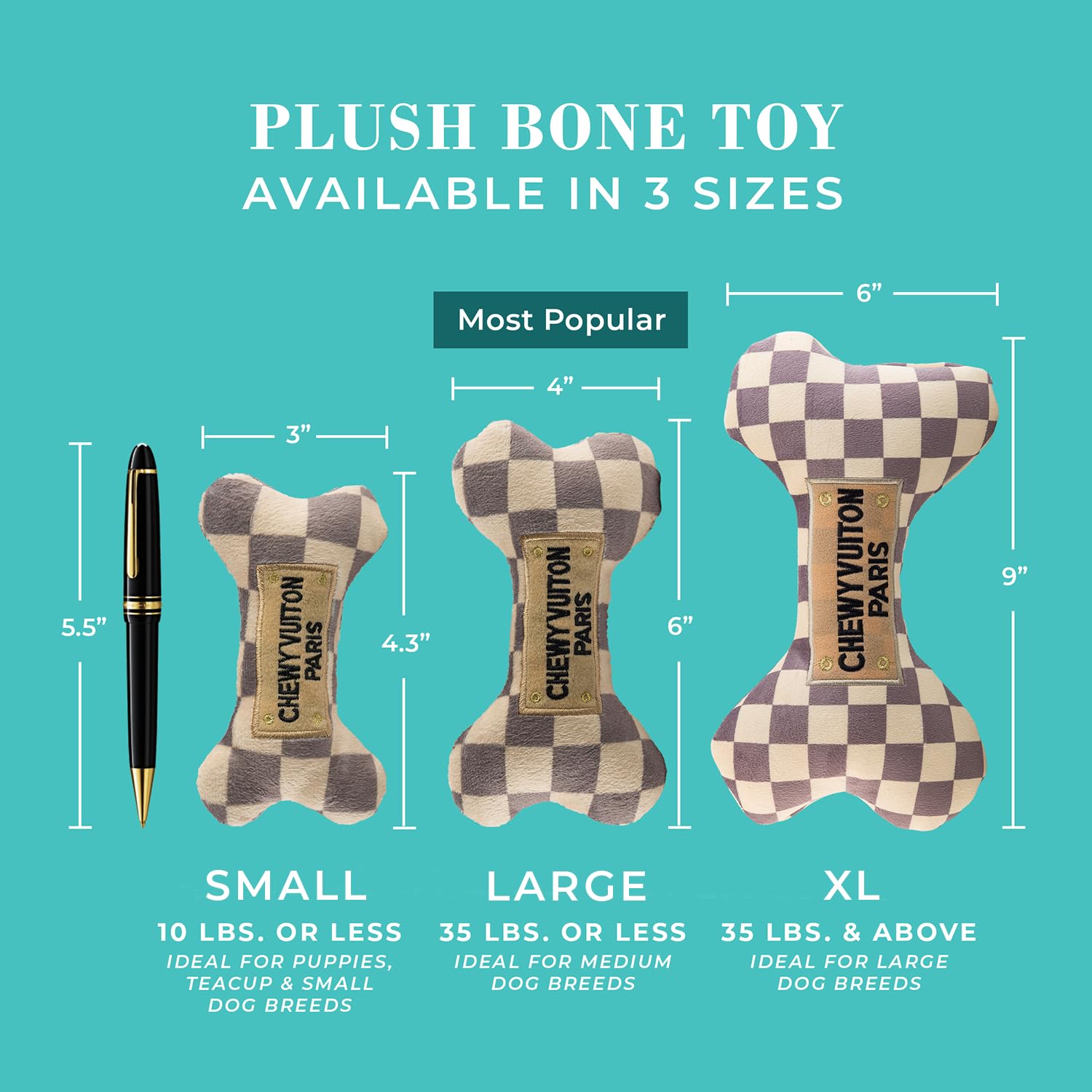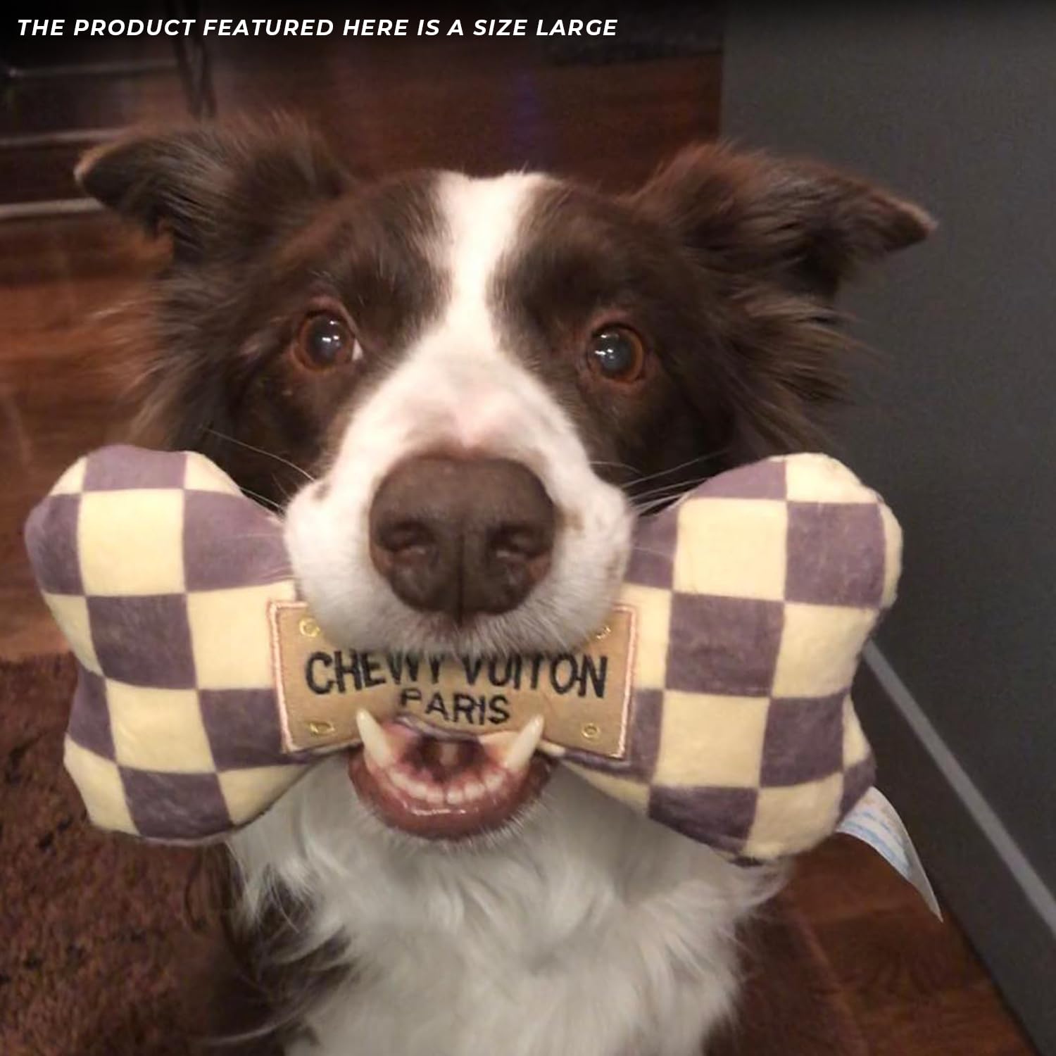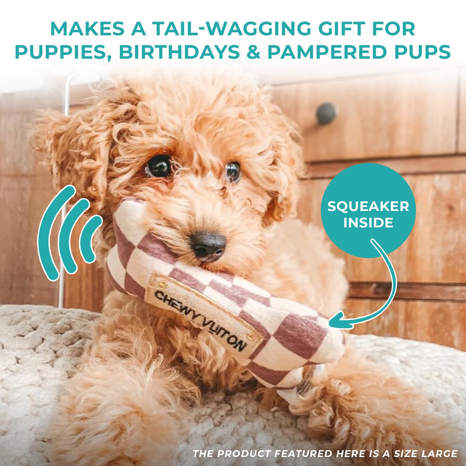 Funny Parody Plush Dog Toy: Let your furry fashionista fetch some fashion-forward fun with this Tan Checker Chewy Vuiton Bone dog plush toy, featuring an iconic checkered pattern on the soft plush exterior and a built-in squeaker hidden inside; it’s a playful, cute squeaky dog toy that combines style and fun, measuring 6"x4”x1”