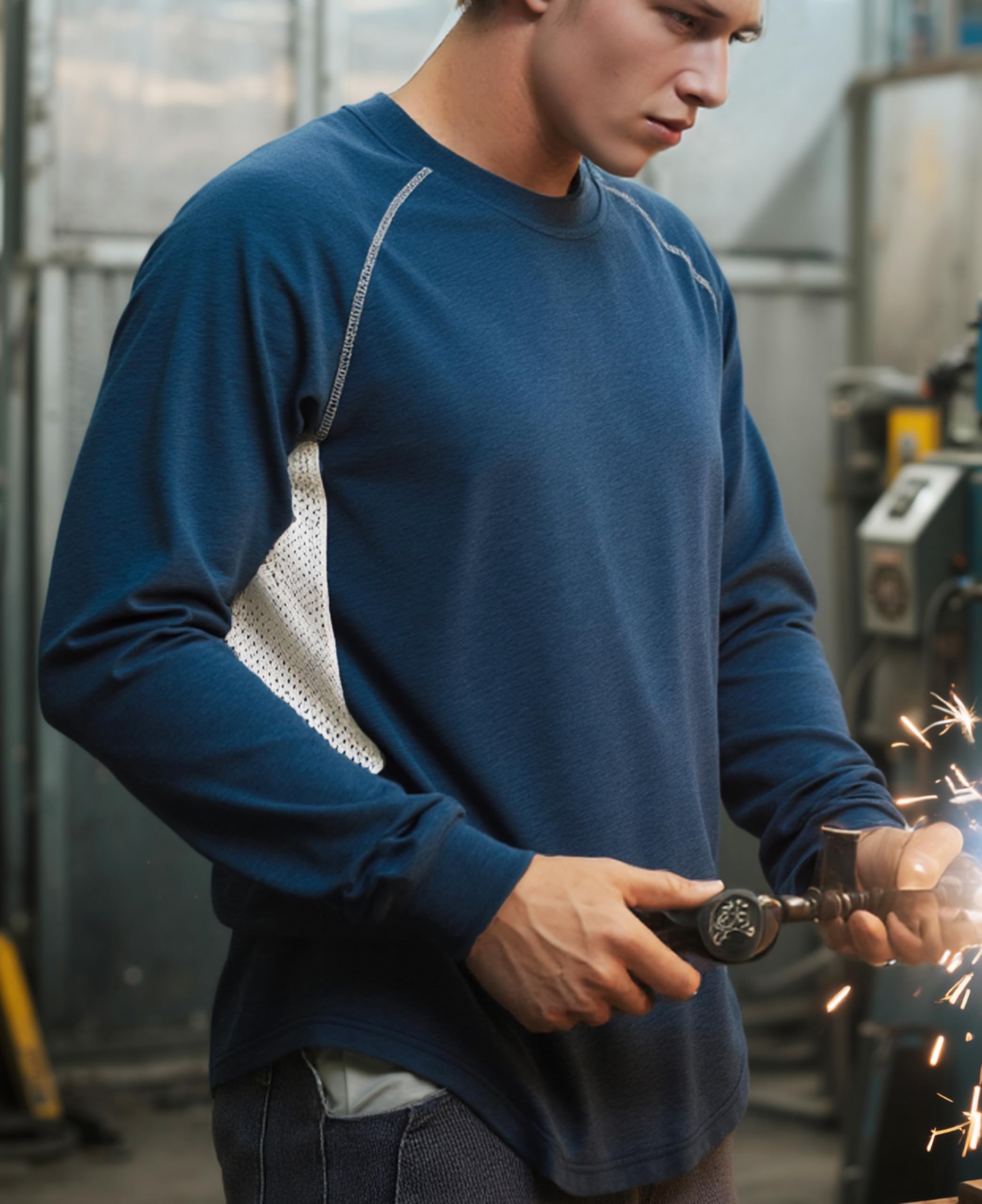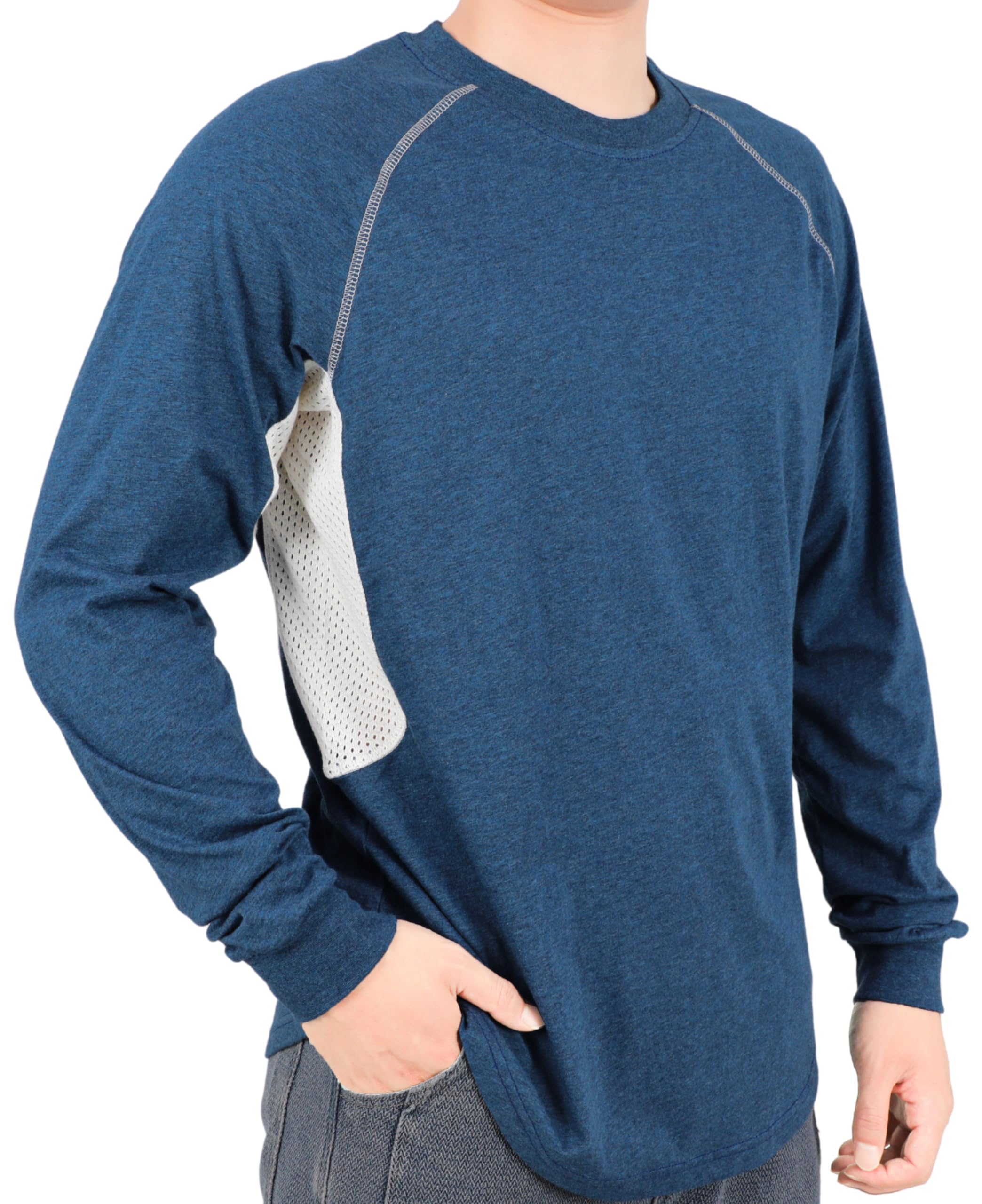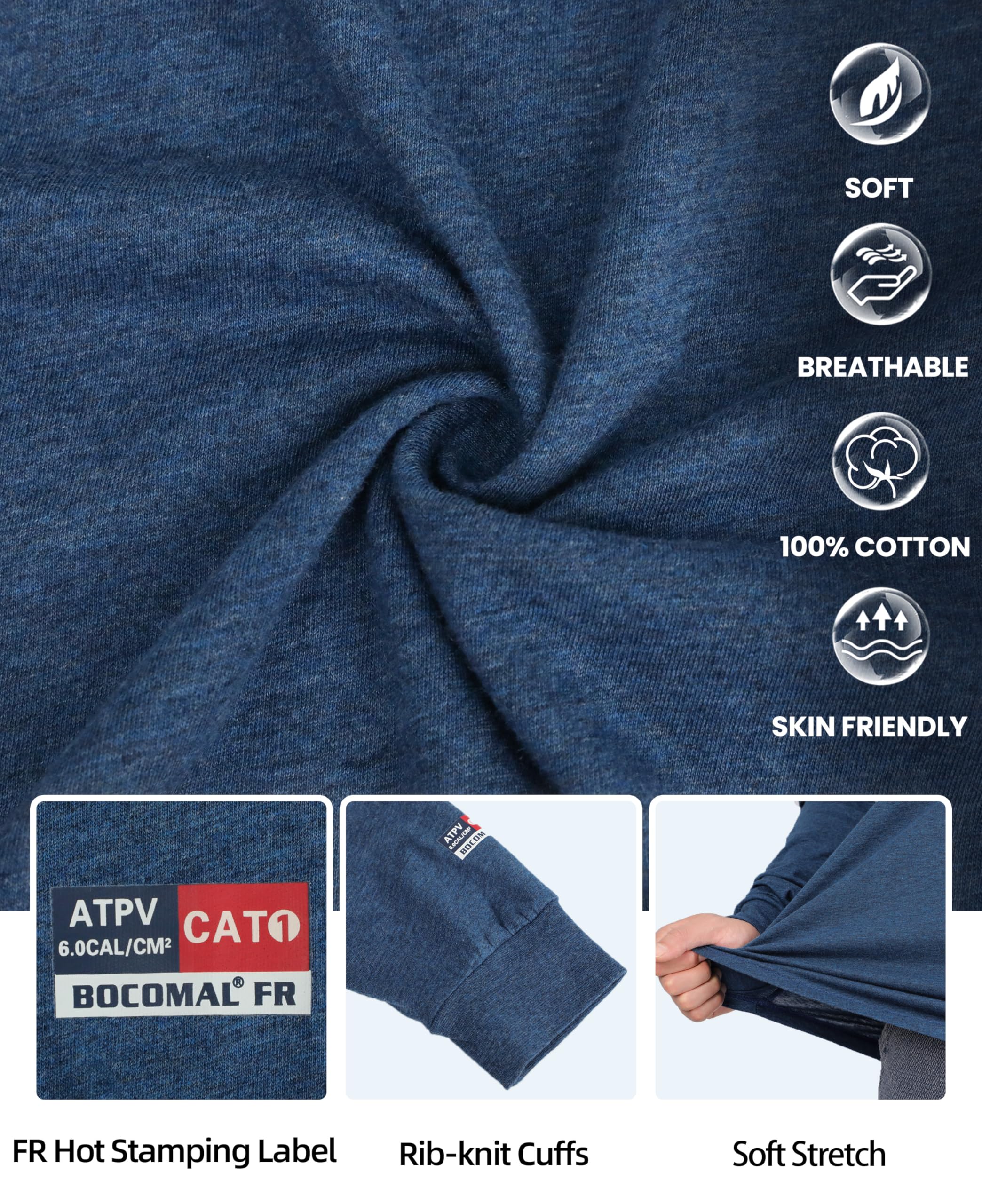BREATHABLE MATERIAL FOR COMFORT:4oz 100% cotton fire retardant stretch knit EX lightweight smooth fit.Mesh fabric: 6oz natural inherent FR modacrylic cotton,breathable vented underarm design for summer hot days.