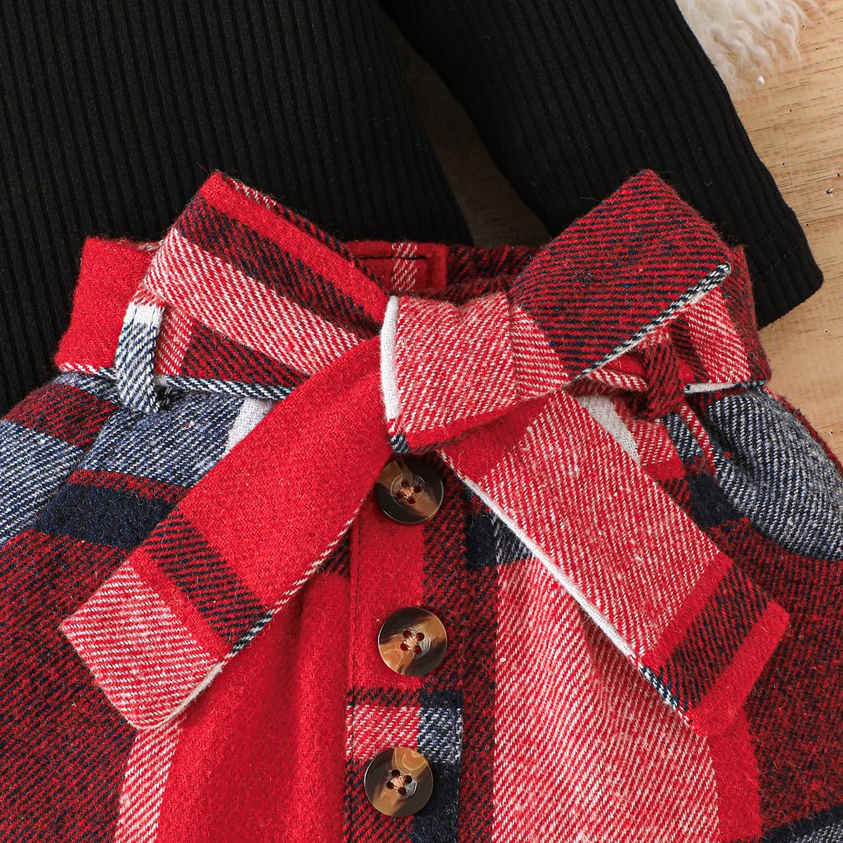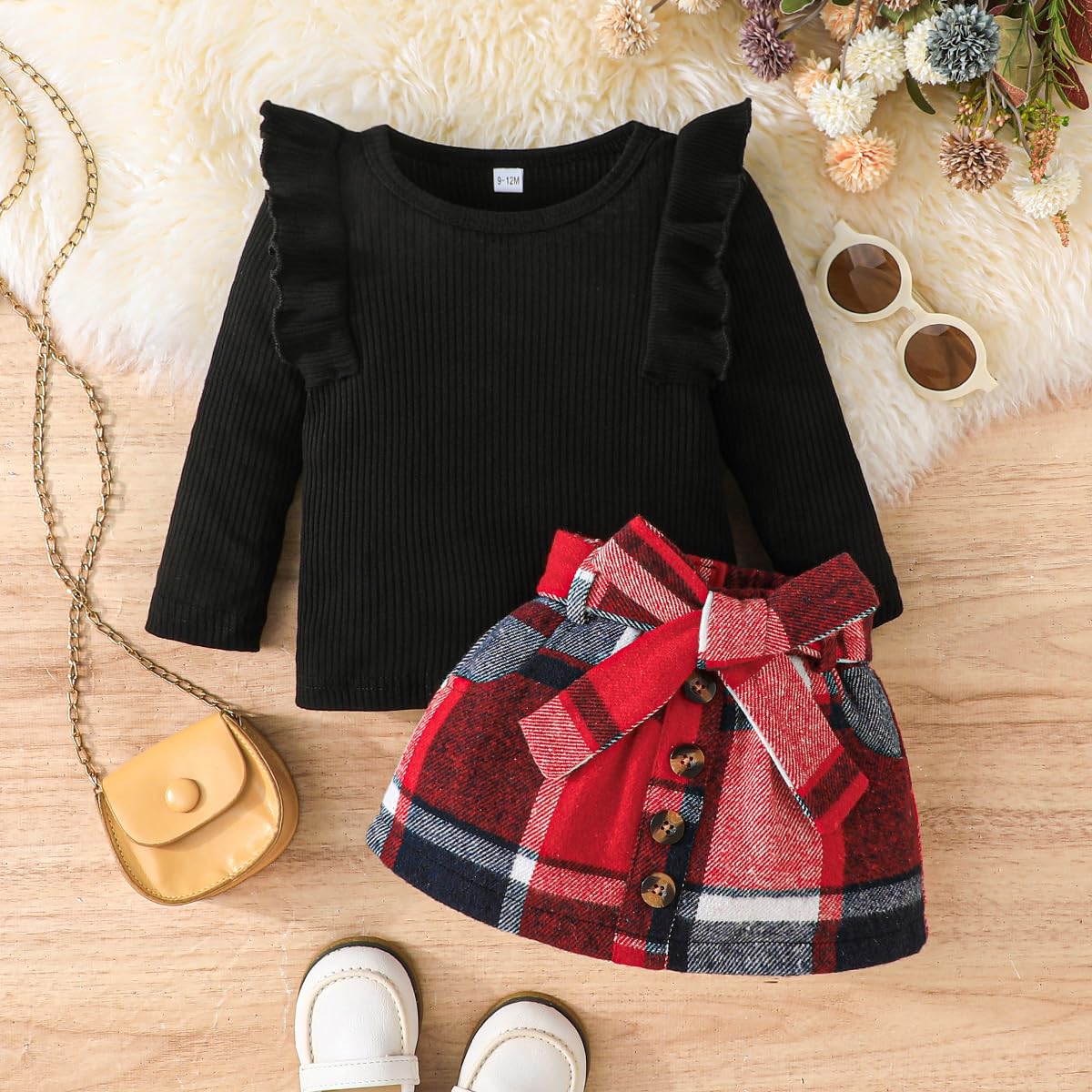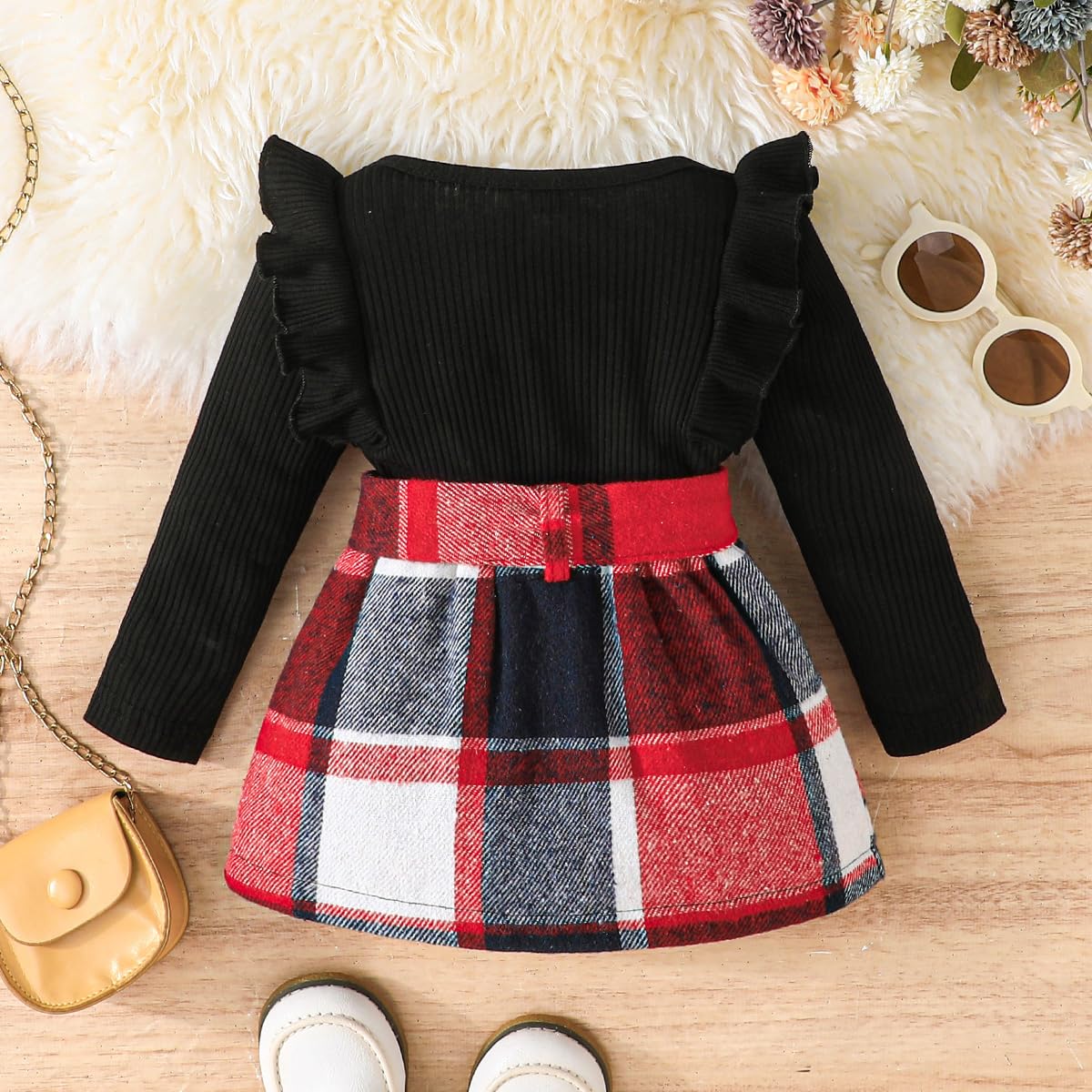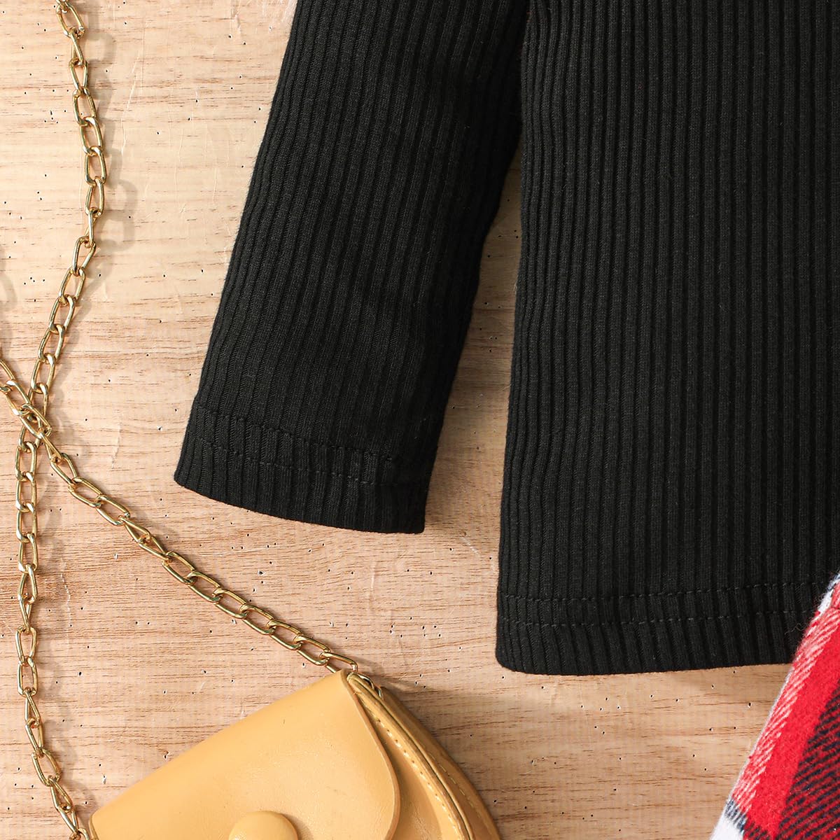 Feature: Baby girl fall outfits, long sleeve knitted sweatshirt top , crewneck, comfy ribbed shirt and tweed red plaid skirt set, adjustable belt skirt, lovely and stylish, Suitable for your little princess in autumn winter and Christmas wear.