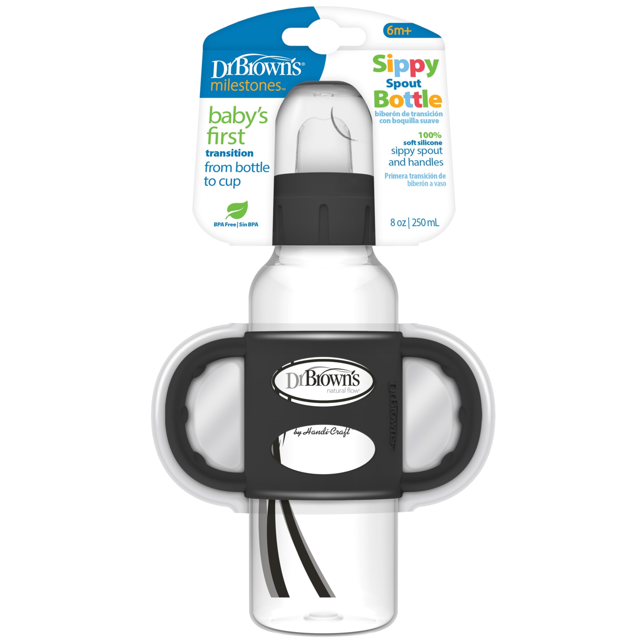 Dr. Brown's Milestones Narrow Sippy Spout Bottle is the easy way to help baby develop new drinking skills! Introducing a sippy spout has never been simpler. The soft silicone sippy spout is used in place of the nipple on the Dr. Brown's Narrow Bottle that's already familiar to baby. Easy grip 100% silicone handles are removable and fit most narrow bottles and sippy cups, while the snap-on cap keeps the spout clean when on-the-go. The soft sippy spout fits any Dr. Brown's Options+ Narrow Bottle after the internal vent is removed. All parts are dishwasher (top rack only) and sterilizer safe. BPA-free. 6m+.
