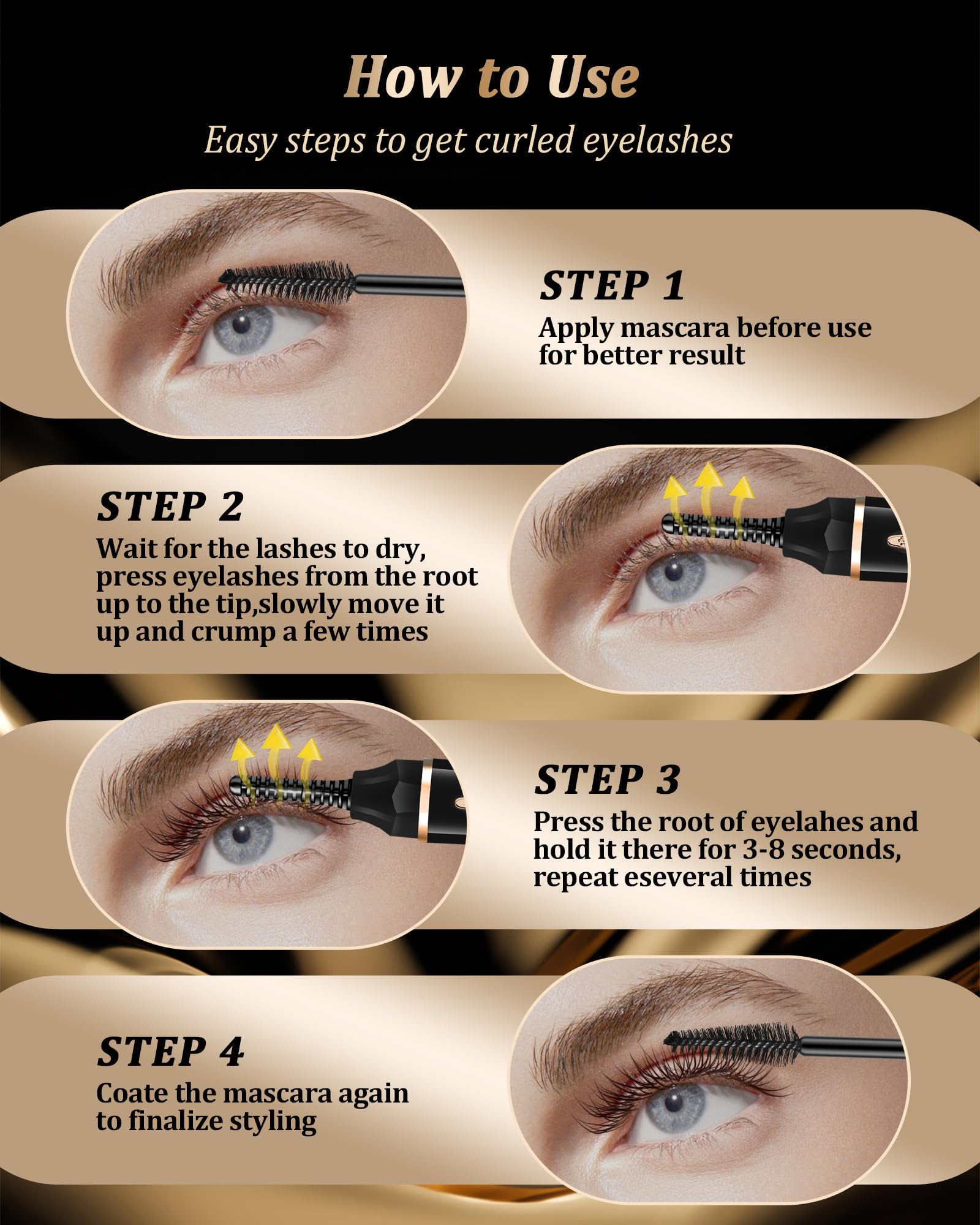 【Usage Tips】Make sure the Eyelash Curler is fully charged for 1-2 h before using it for the first time. It is recommended that you practice and familiarize yourself with the operation of the curler before trying it for the first time. For more effective curling of eyelashes, please take care to apply mascara before using the curler for better heating and styling of eyelashes. After curling your lashes, apply mascara to enhance the curling effect for a natural curl and longer-lasting results.