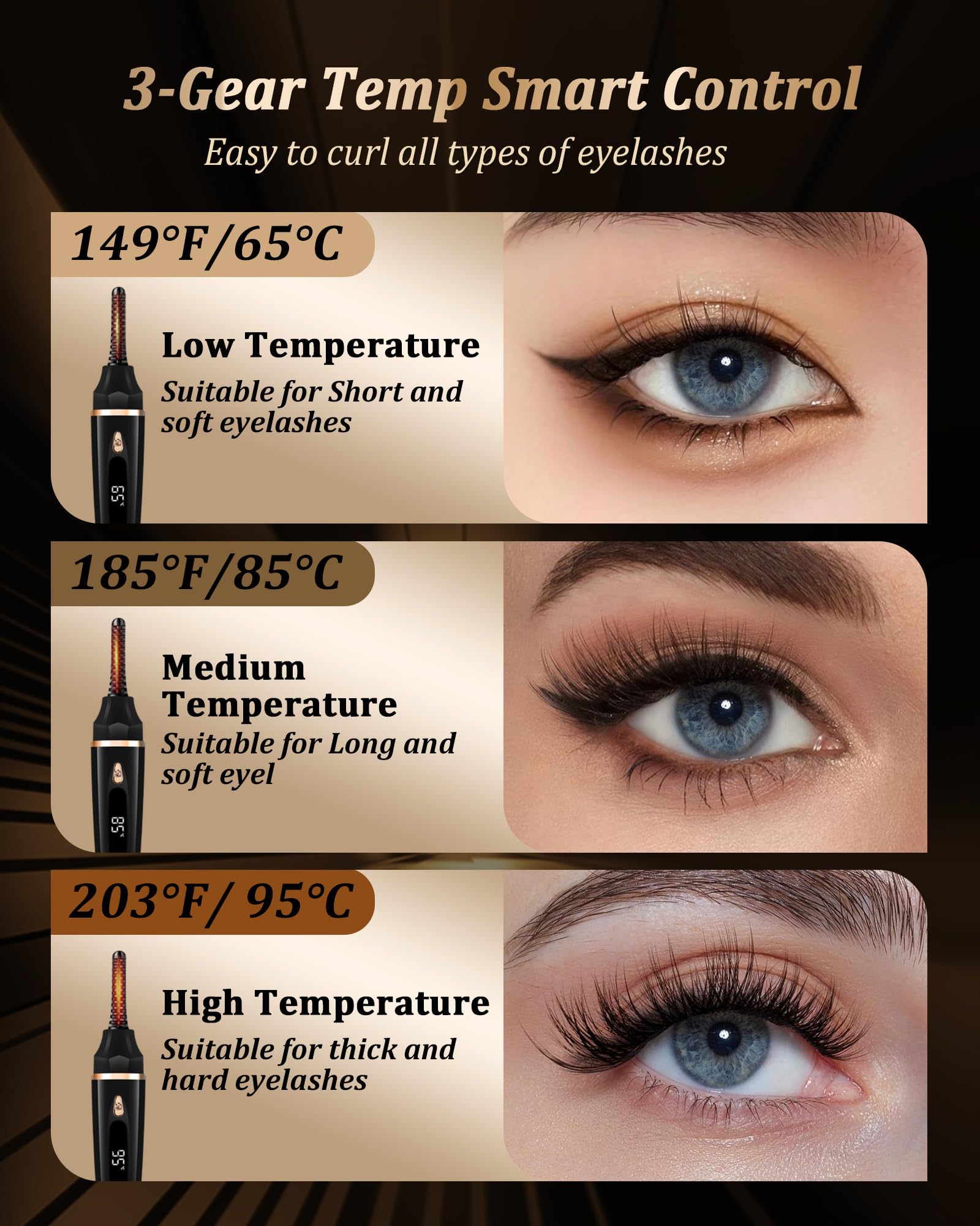 【3-Position Temperature Adjustment & LED Display】 BeautyCurls advanced heated eyelash curlers offer 3 temperature options with an led display, 65℃(149℉), 85℃(185℉), 95℃(203℉), there is always a temperature that suits you. It's easy to operate, with the touch of a button to quickly switch the temperature, suitable for a variety of curved and thick lashes, whether you want natural everyday light makeup or party makeup, this lash curler can meet your needs perfectly!