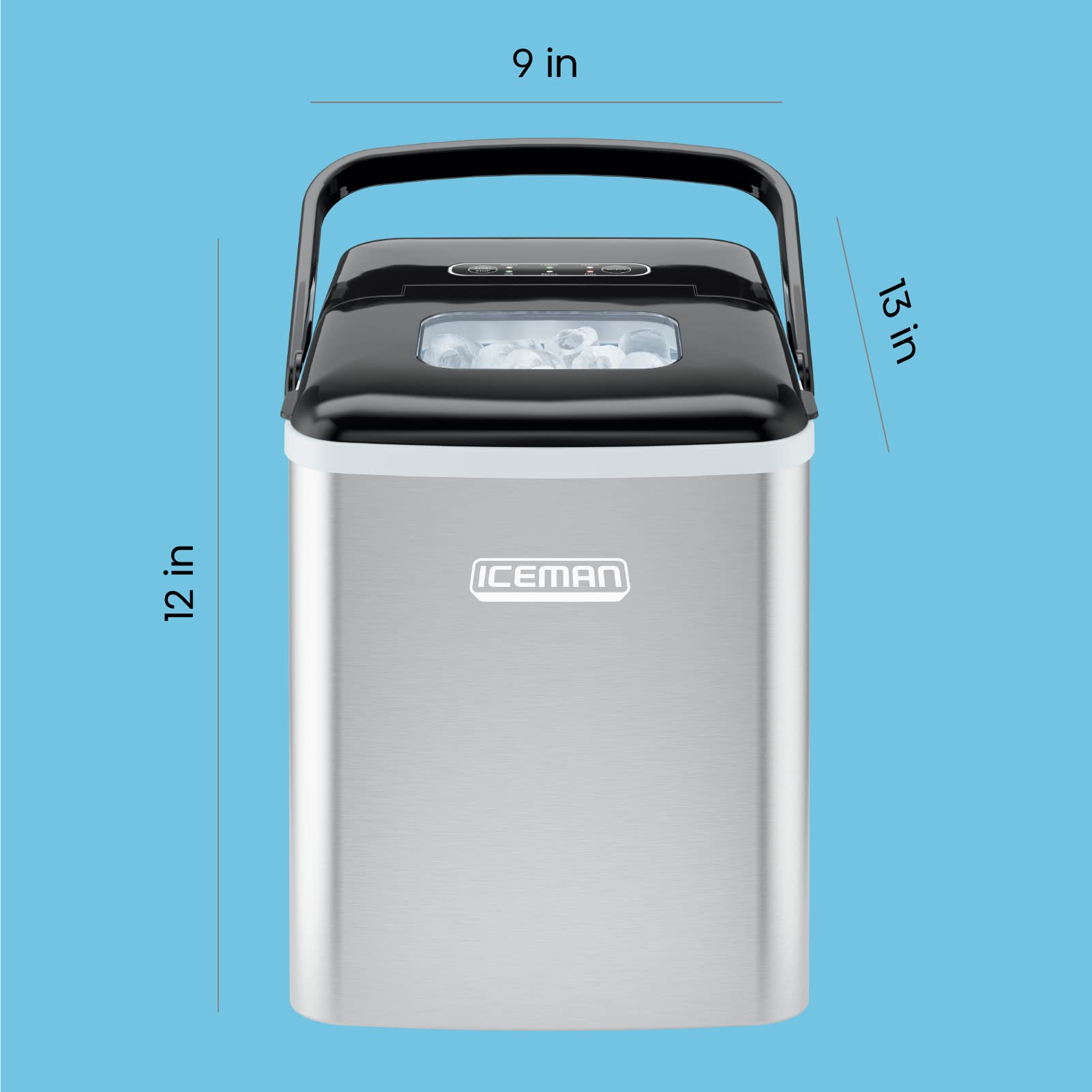 The Iceman Dual-Size Ice Machine is your ice making countertop companion. With two ice sizes to choose from, you can have ice when and where you want. Display lights indicate when ice-making is complete, when the water to make ice is low, or when the cleaning cycle has been completed. The included ice basket holds 1.3 lb. of ice, and the top viewing window helps you see how much ice is left. The 5 ft. power cord and cooler-style drain plug simplify setup and take down. Plastic serving scoop and removable ice basket included. Purchase includes a 1-year assurance from Chefman by Iceman For information on how to use your product, scroll down for a PDF User Guide. 120 Volts/1.7 Amps. RJ56-D1 •Ice Basket Stores 1.3 lb. of Ice •Makes Large or Small Round Ice •Detachable Carry Handle •Indicator Lights •Top Viewing Window •Bottom Drain Outlet •Long 5 ft Power Cord •Plastic Scoop Included.