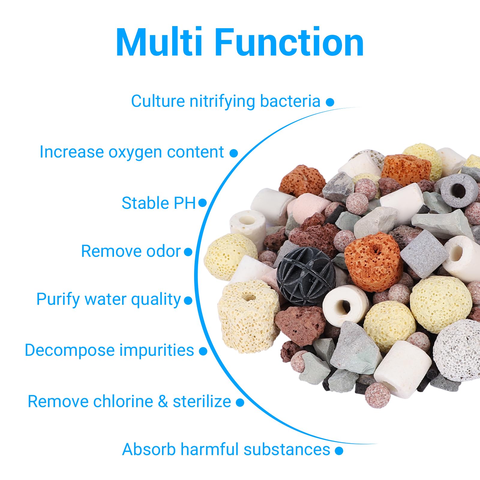 Multi Function: Our aquarium filter media not only cultures nitrifying bacteria, increases oxygen content, stabilizes pH, and removes odors, but it also works well in removing chlorine and sterilizing the water, purifying water quality, adsorbing harmful substances, and decomposing impurities. They help maintain a healthy and thriving aquarium.
