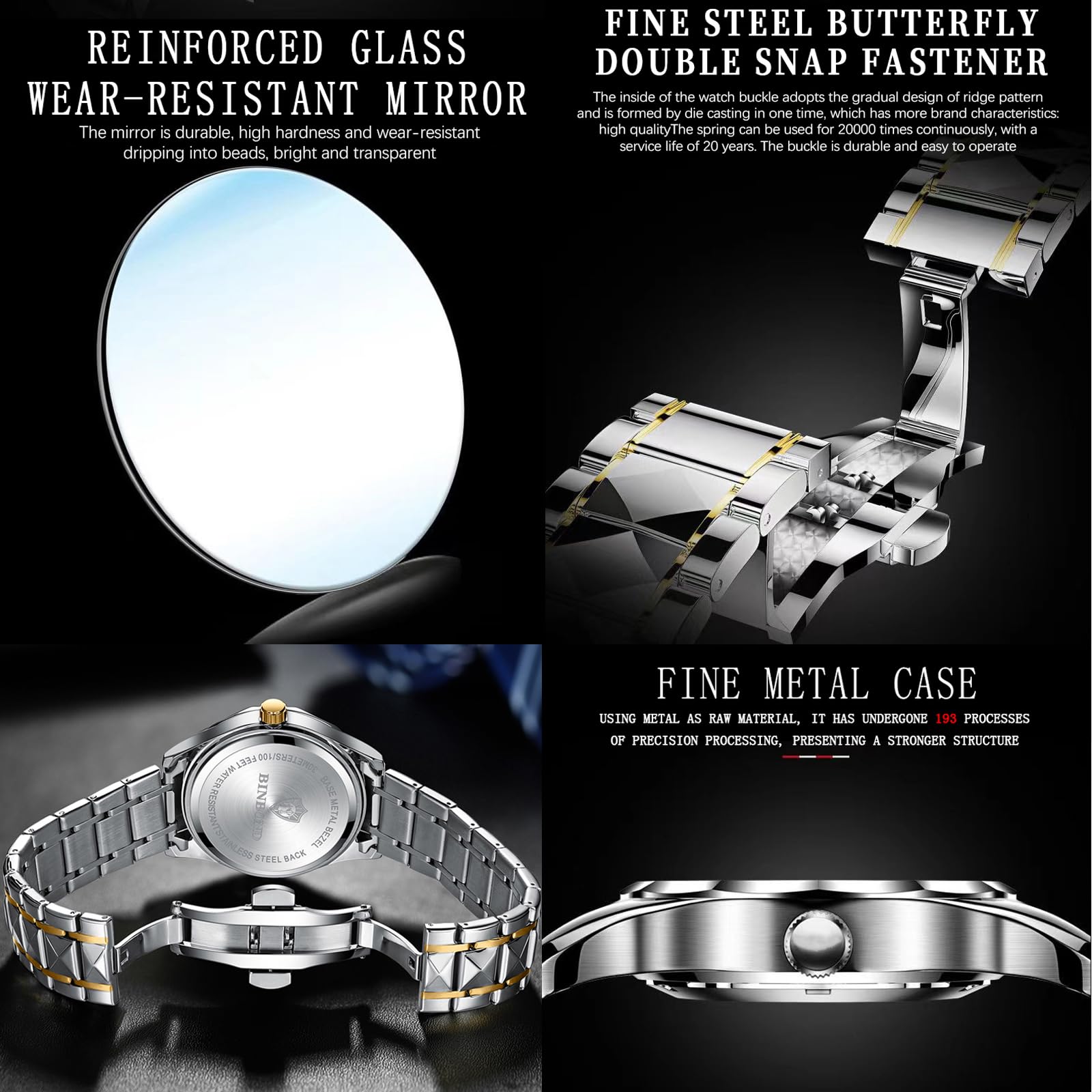 Stainless steel / Calendar /Waterproof FUNCTION : Calendar is easy to read./ The watch band is easy to adjust / shockproof,dress watch,/ water resistant up to 3 ATM - 30 meters - 100 feet, handwash,swimming,daily use waterproof,not suitable for underwater activities.Pls DO NOT press any buttons in the water,in case of damaging waterproof ring,pls keep it away from steam and hot water