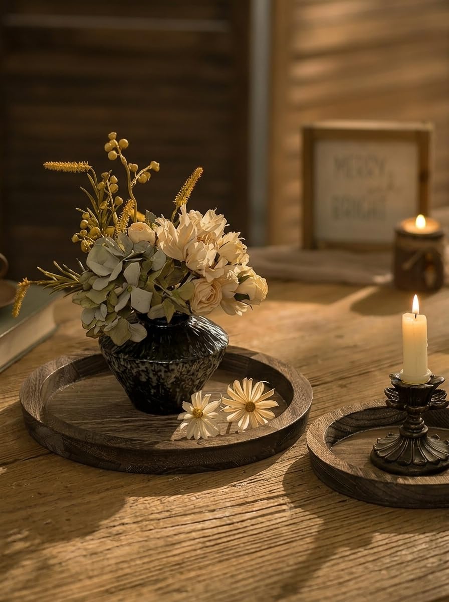Material and Size: This vintage candle plate made of high quality paulownia wood, with beautiful organic wood grains, lightweight and durable. The size of round tray is 11.02"L x 11.02"W x 0.98"H, perfect size to put on home table hold your favorite candles or other small items keep your countertop organized.