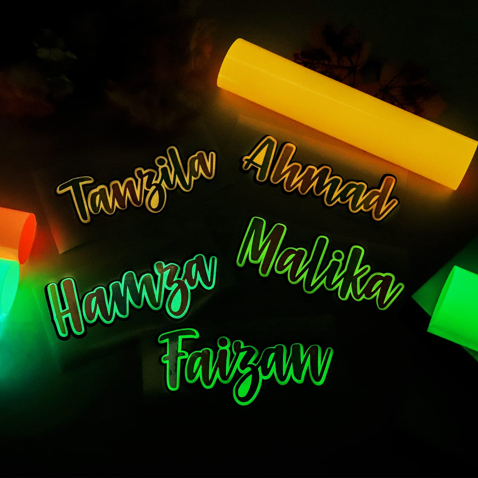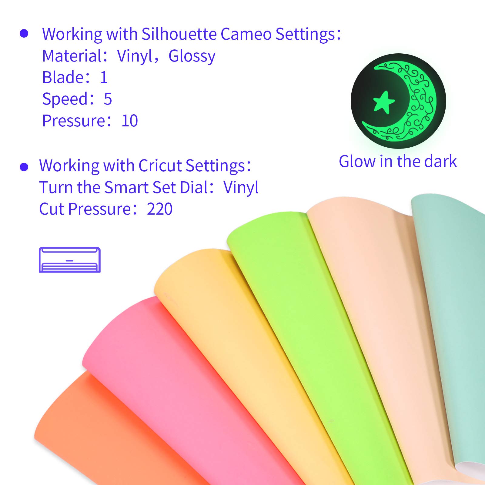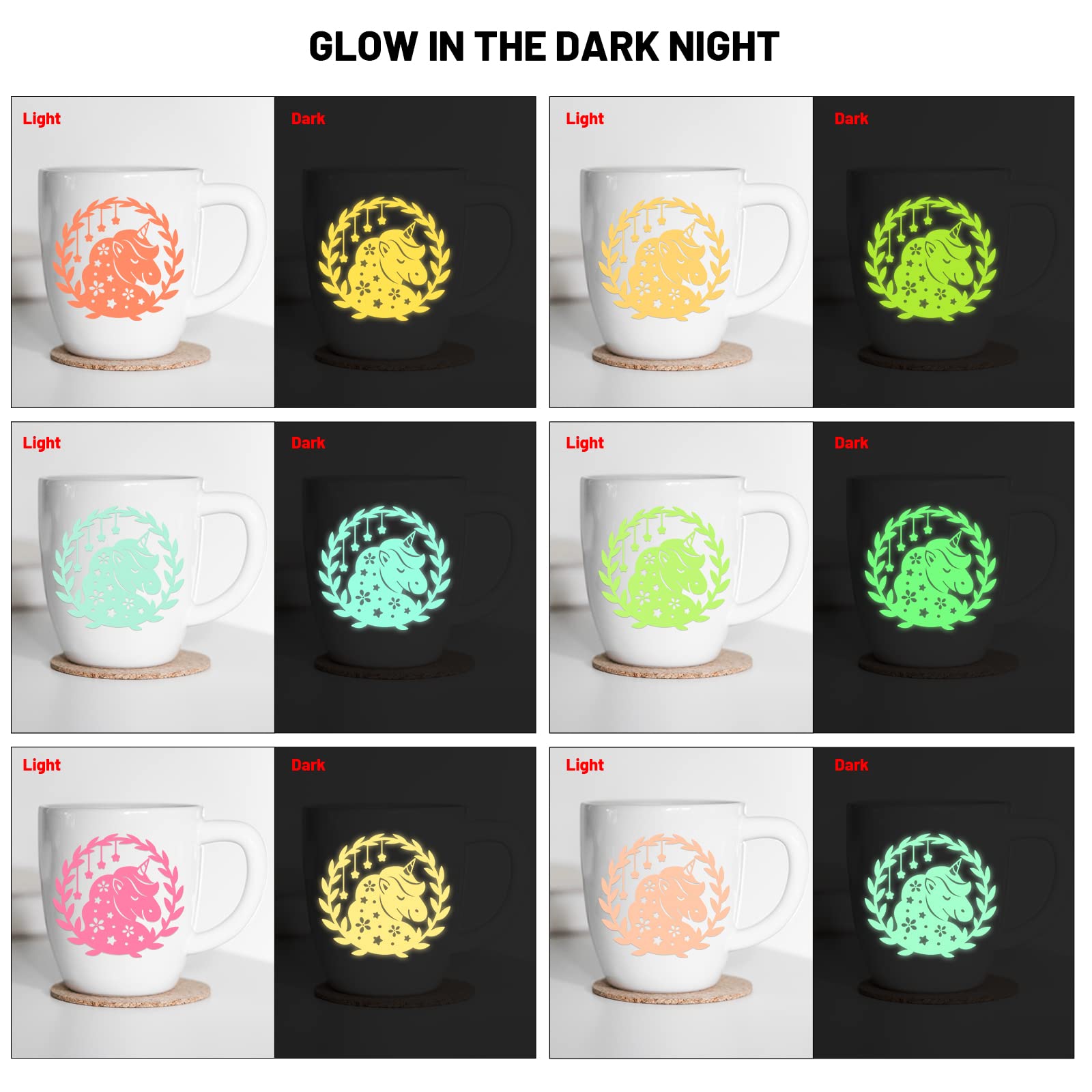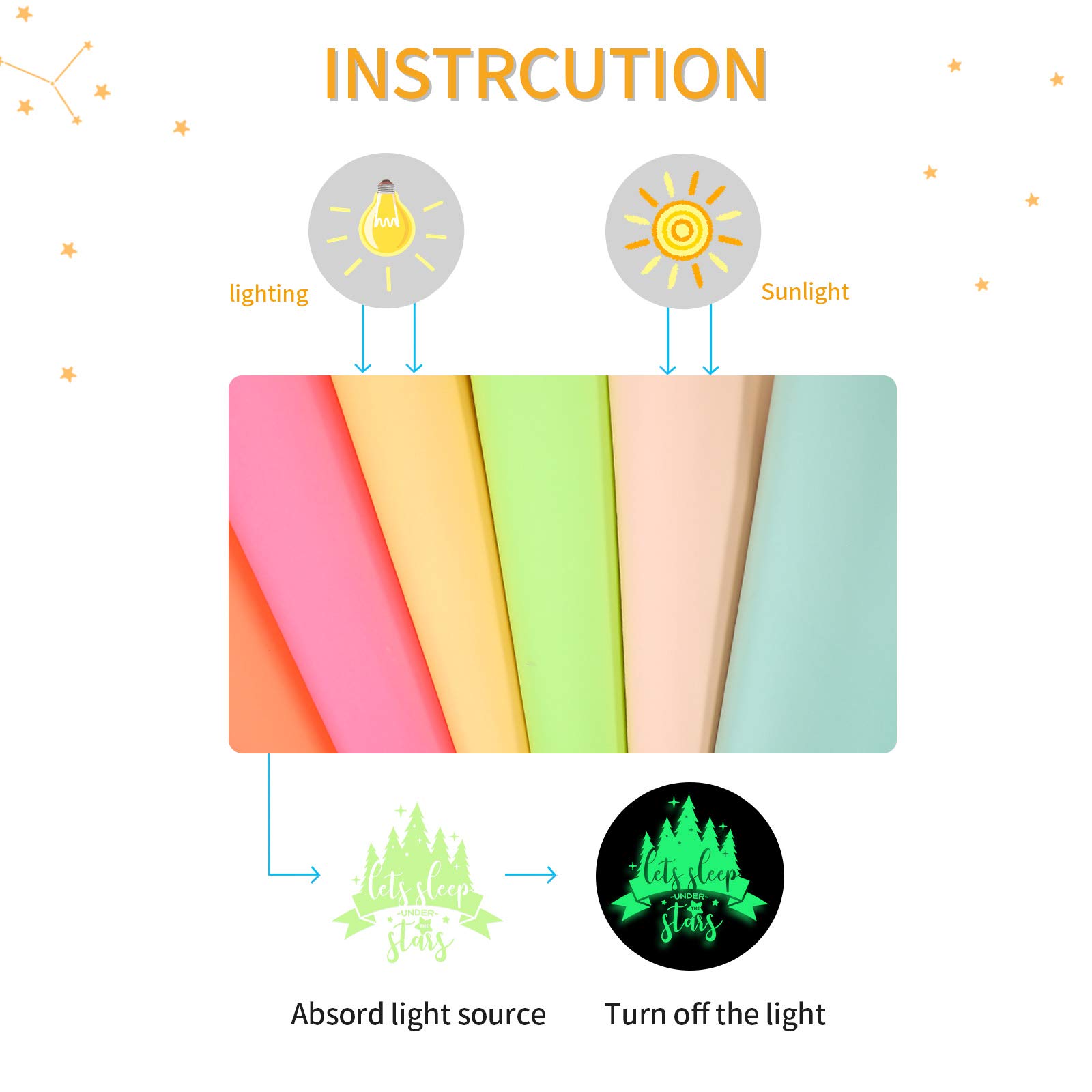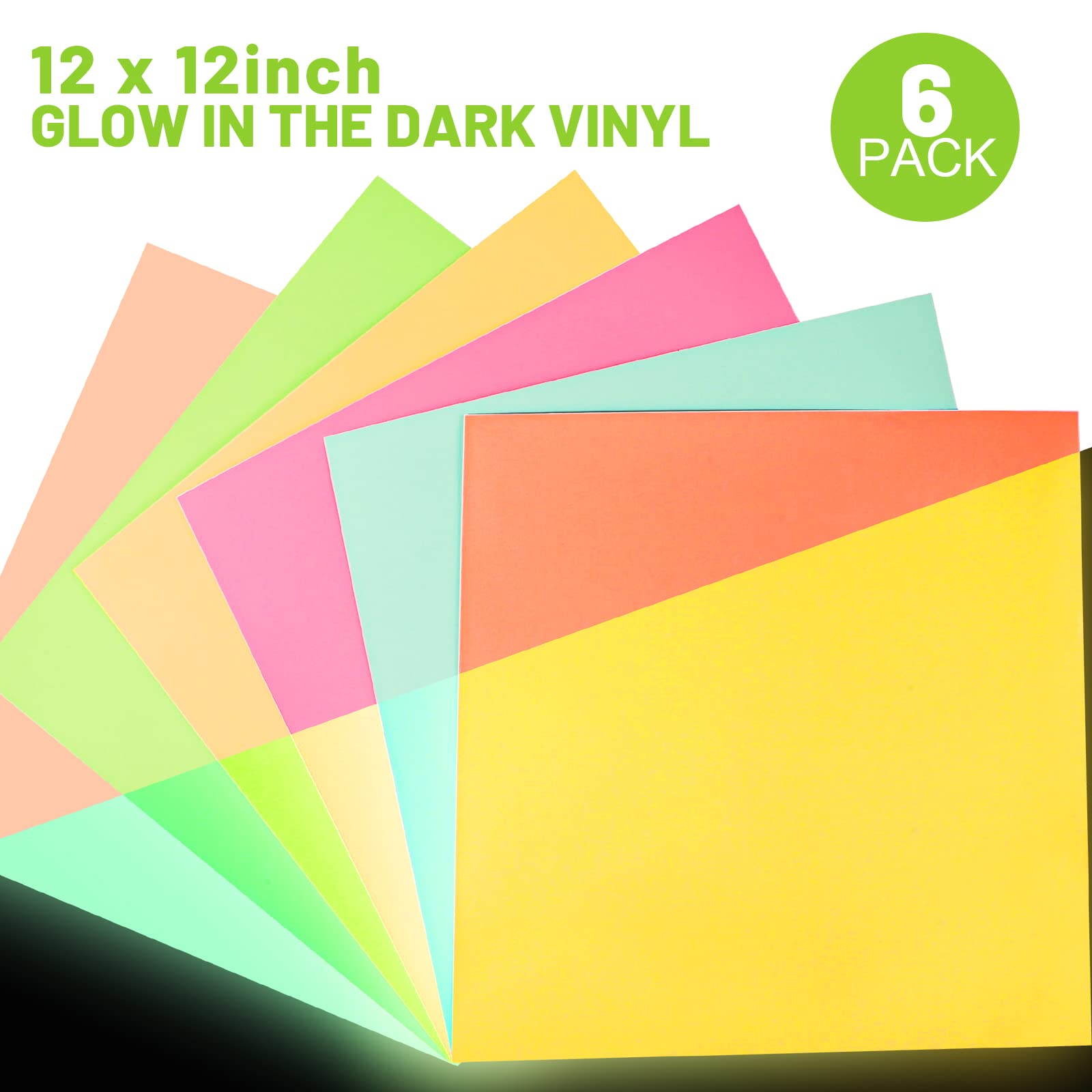 GLOW IN THE DARK Permanent Adhesive Vinyl Set with 6 colors, 12inches by 12inches. 6 sheets,Colors include: pink, light fluorescent orange, tender green, bee yellow, mint teal.