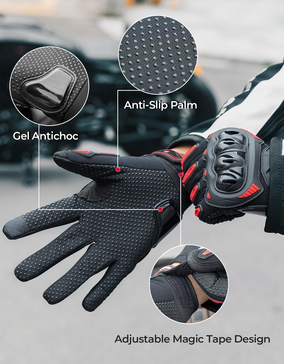 ANTI-SLIP & GEL PAD: The motorcycle riding gloves feature anti-slip palms, anti-friction gel padding, and adjustable magic tape. So our mountain bike gloves can enhance grasp and palm protection