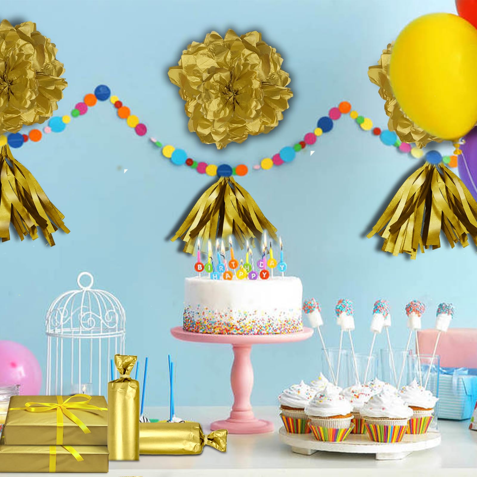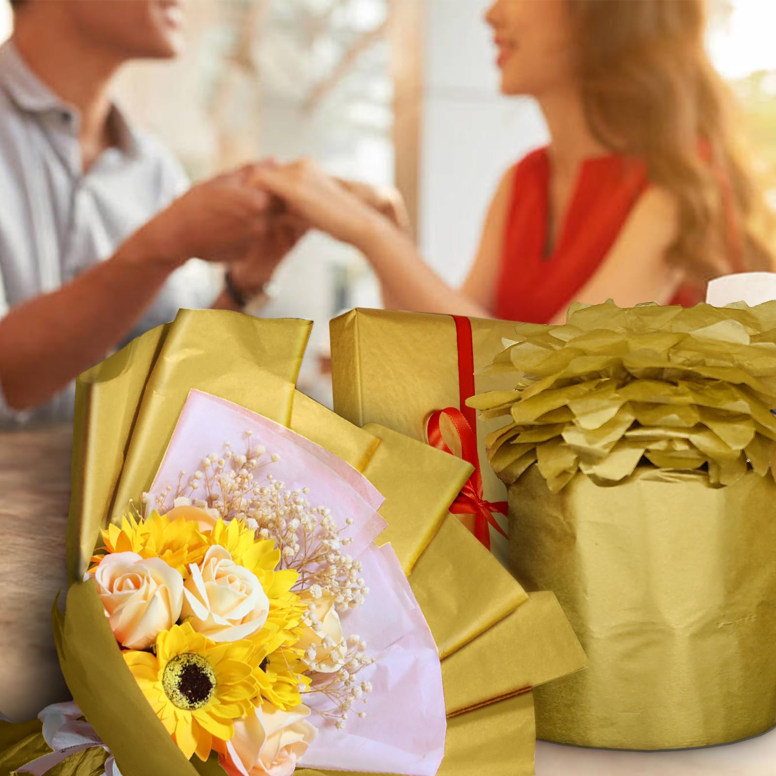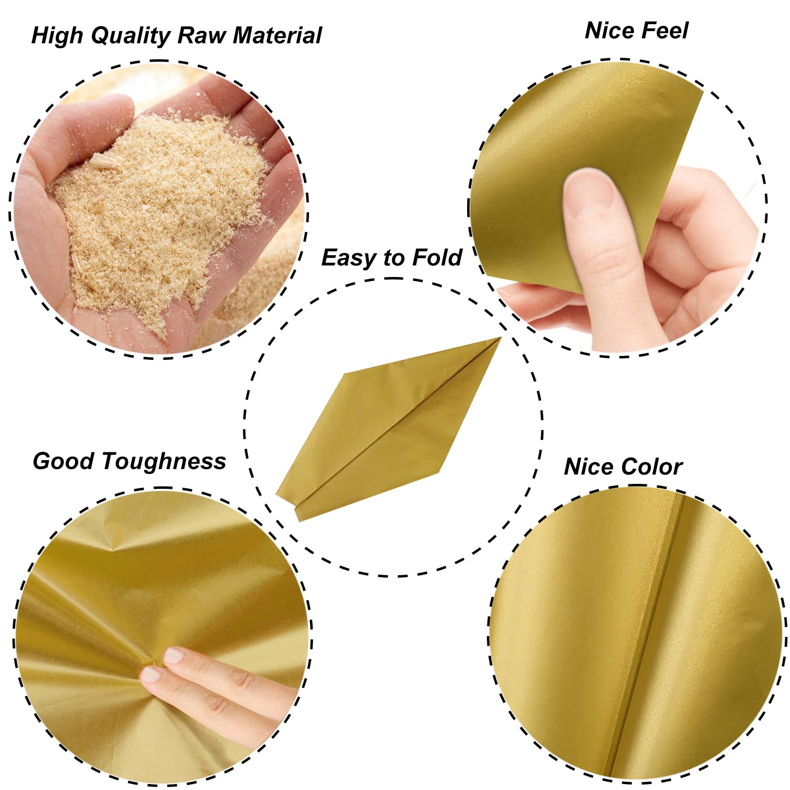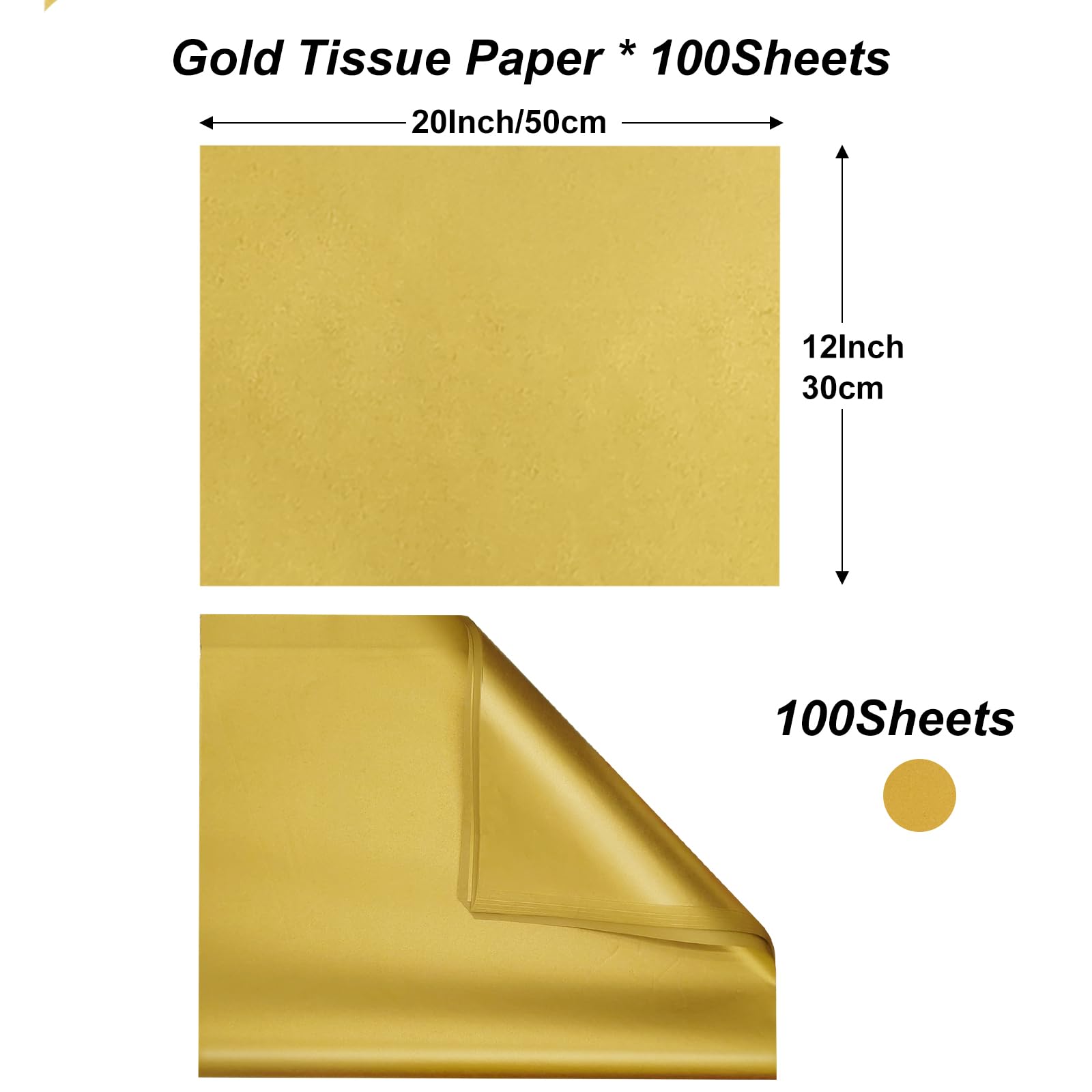 1.We Have More Quantity: 100 sheets of gold tissue paper 2. We Have Many Scenarios: packaging, art paper garland, paper pompons, bouquet packaging, making baskets, crafts items, scrapbooks, packaging fillers Party decoration: wedding decoration, baby shower decoration, party decoration 3. We Have Premium Quality The gold tissue paper bulk is made of tissue paper materials, does not fade