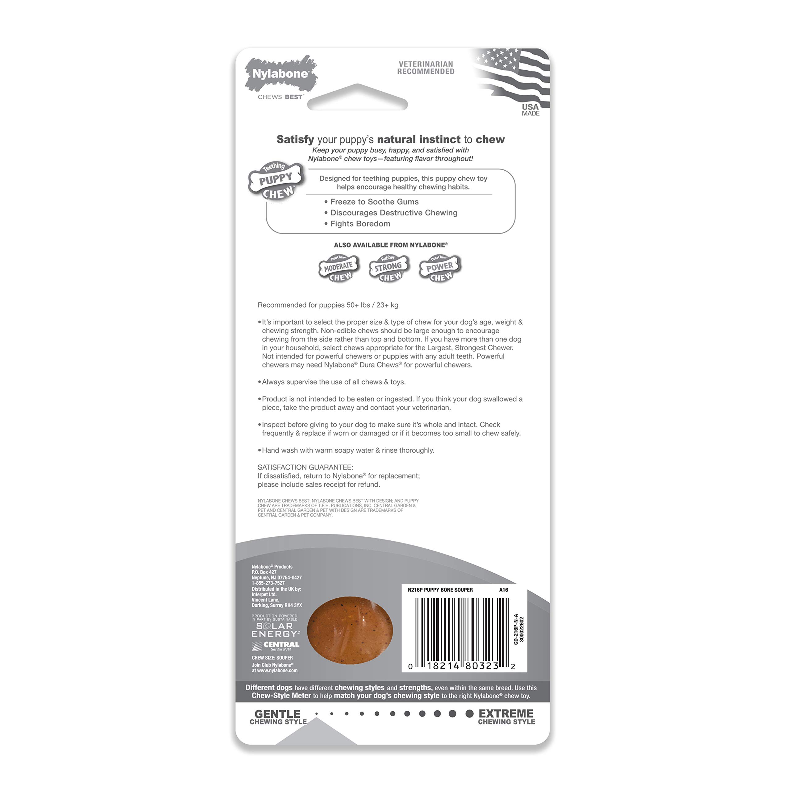 ABOUT PUPPY CHEW TOYS Puppies use their mouths to explore their world and especially relieve teething pain! That's why Nylabone Puppy Chew toys come in all different shapes, flavors, and textures to keep your new best friend comforted and entertained. With positive reinforcement, your pup will learn that chewing on our puppy toys is not only encouraged, but a fun activity as they grow up! THE PERFECT SIZE FOR LARGER PUPS Encourage positive chewing habits that’ll last a lifetime with the Puppy Chew Knuckle Bone! Specially created in a larger size with soft material, this puppy essential is the pawfect option for comforting larger-breed pups in the teething phase. Plus, it has enticing flavor infused throughout and offers a safe way to satisfy your pup’s natural instinct to chew. Made with heart and purpose, this veterinarian-recommended puppy teething toy will start your new best friend off on the right paw! NYLABONE CHEWS BEST What your dog chews matters! With destructive behavior among the leading reasons dogs are returned to shelters, we know healthy habits can make a life-changing difference. For 70 years, our family-founded brand continues to safely satisfy dogs’ chewing instincts and help them stay in loving forever homes! GUARANTEED YOUR DOG WILL LOVE IT Before we introduce new dog products to furry friends and pet parents everywhere, we make sure our very own dogs love them first! If you’re not happy with your Nylabone chew toy for any reason, simply return it to us with the sales receipt for your money back. Or, reach out to our Consumer Care team so we can help make it right (and talk about how much we also love our dogs).