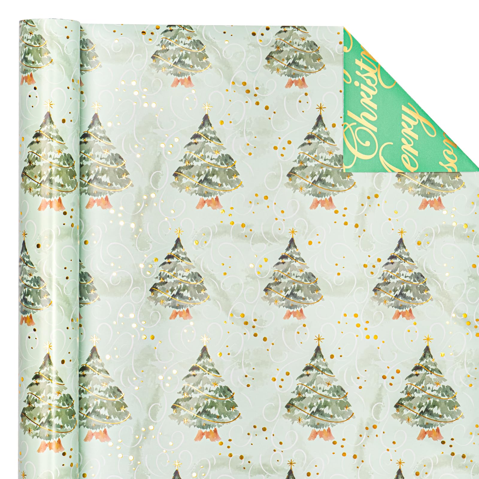 Reversible Design: Christmas tree with metallic foil shine printed on one side, "Meery Christmas", "Season's Greeting" lettering printed on the reverse. Two different designs make unique and varied gift presentations easy.
