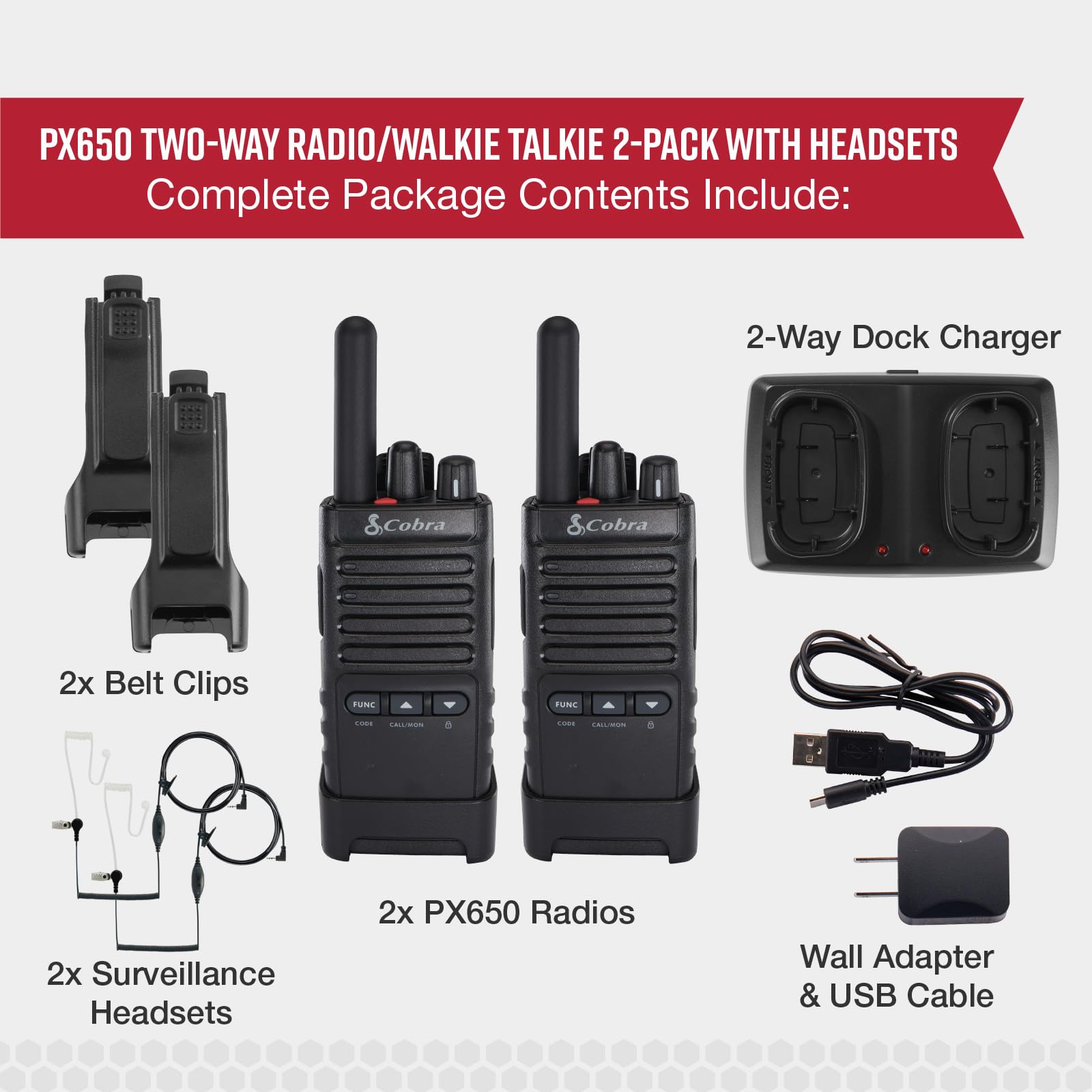 The Cobra PX652 has a professional, discreet design. This waterproof two-way radio/walkie talkie designed for recreational or business use. With up to 300,000 sq ft./25 floor range, Water Proof Rating (IP54) Rating, dust protected and splashproof from any direction. Cannot withstand water immersion. NOAA Weather Alerts, Voice-Activated Transmission (VOX), Channel Scan and more, the PX652 is great for clear communication at longer distances.