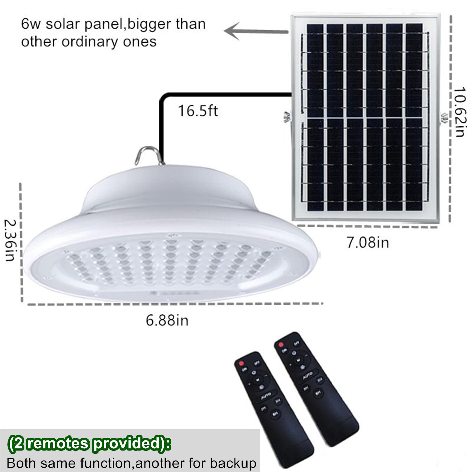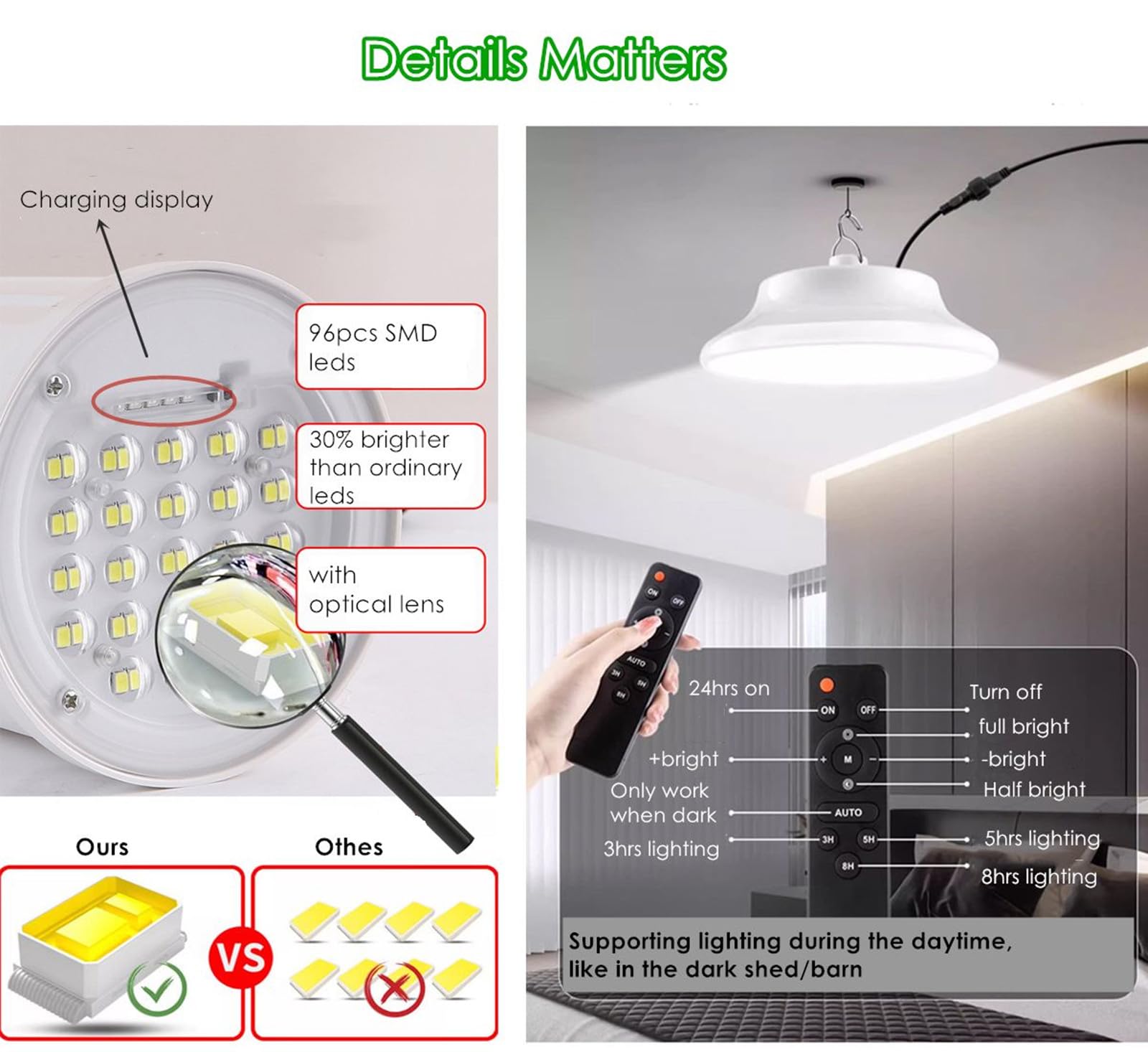 (Upgraded version): 1) 96 SMD leds with optical lens,30% brighter than ordinary ones,2) 6W solar panel bigger than oridinary ones,3) Working 24hrs or at night optional,perfect for some dark sheds/barns which need lights during daytime, the default mode is 24 hrs,Press "AUTO" to change it working at night only
