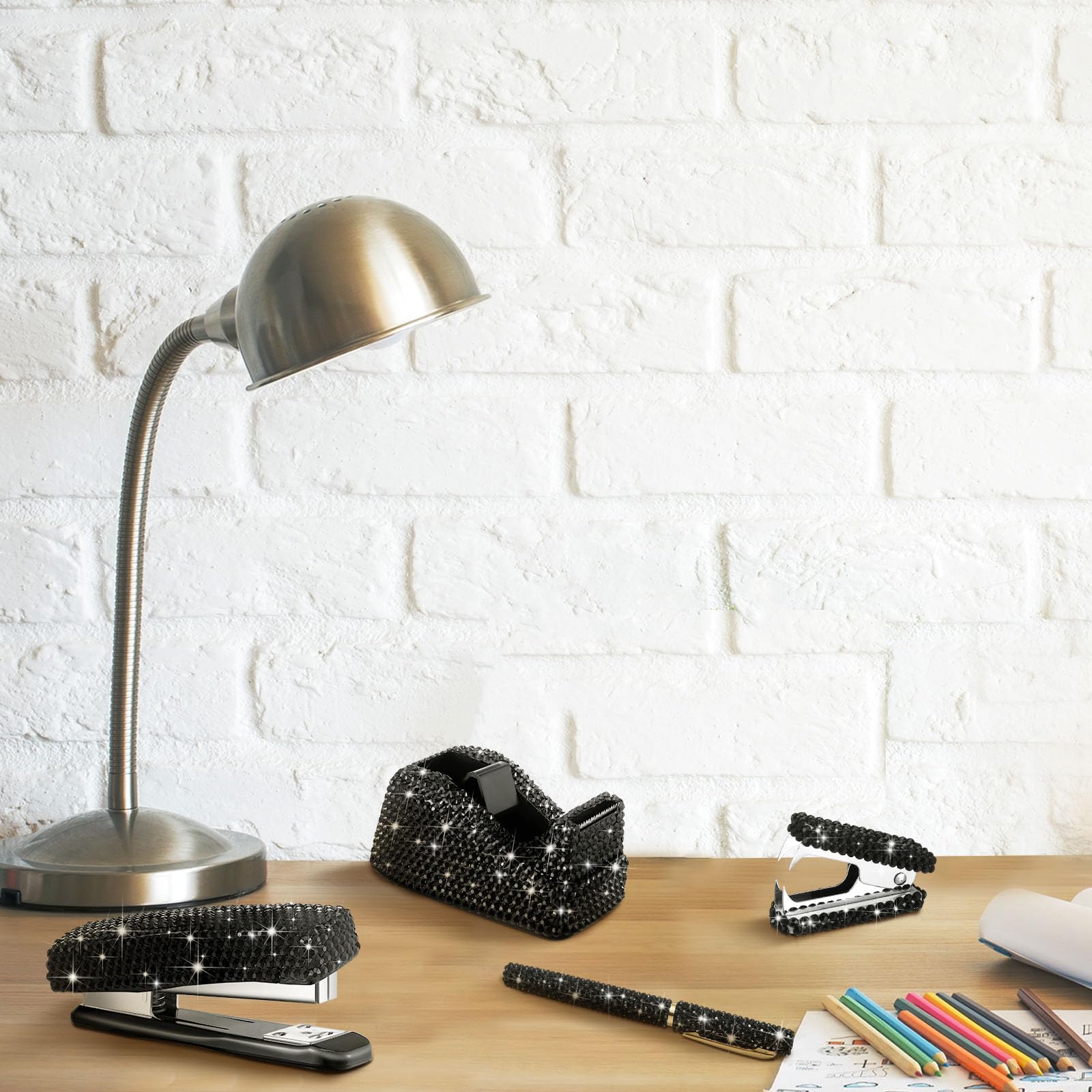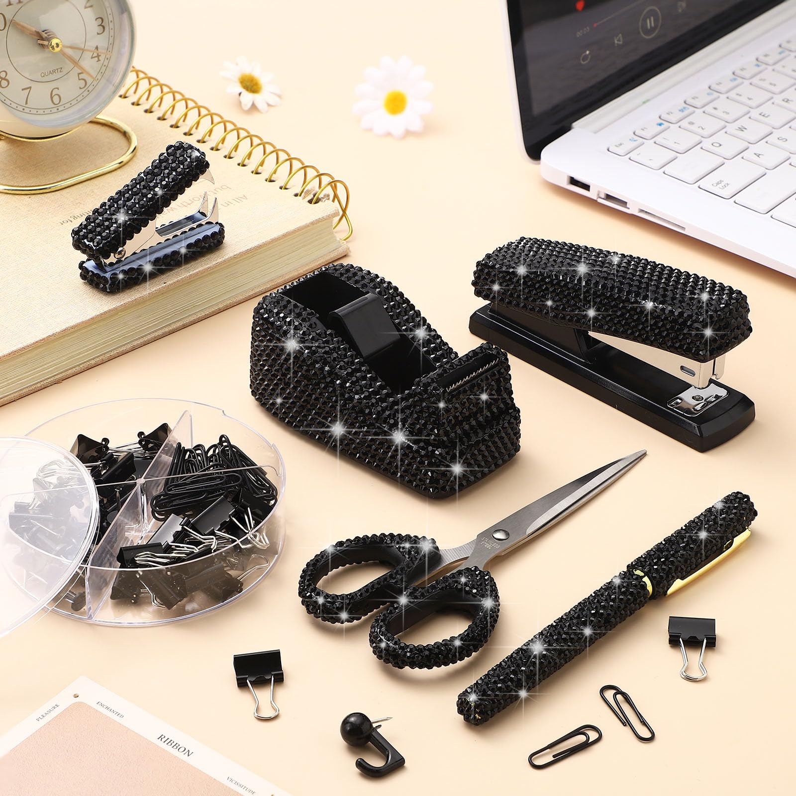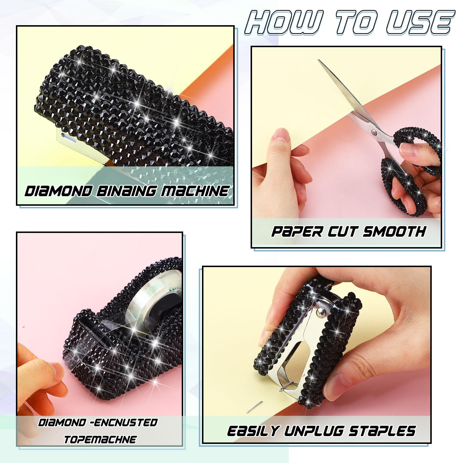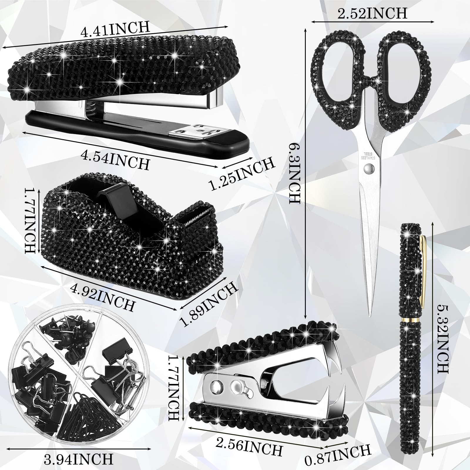 Practical to Apply: our diamond pen, scissor, bling stapler are suitable for your study or home use, tape dispenser can help you cut tape according to your needs, practical and convenient