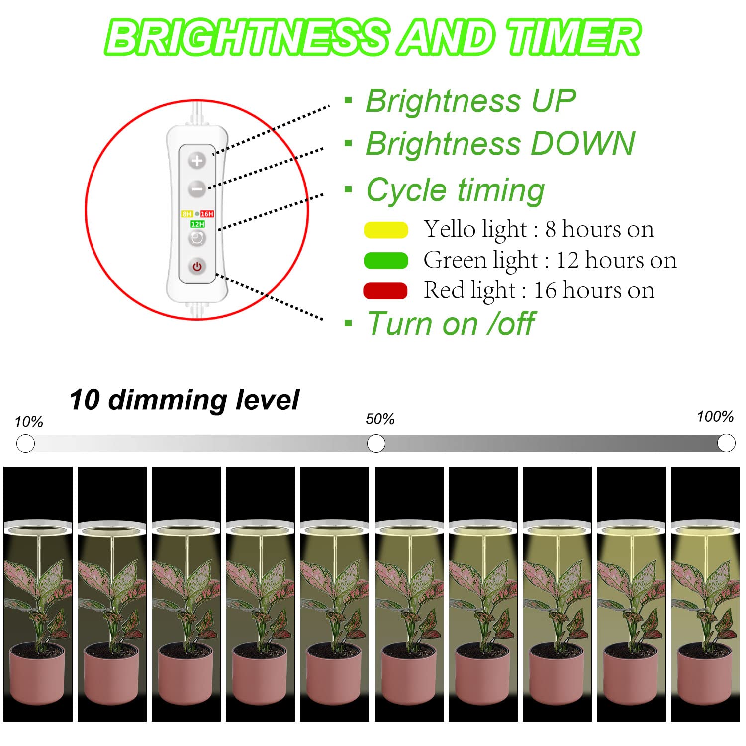 10-level Dimmable - The brightness can be adjusted, 10 brightness settings ranging from 10% to 100%, you can choose the most suitable brightness for your plants growth.