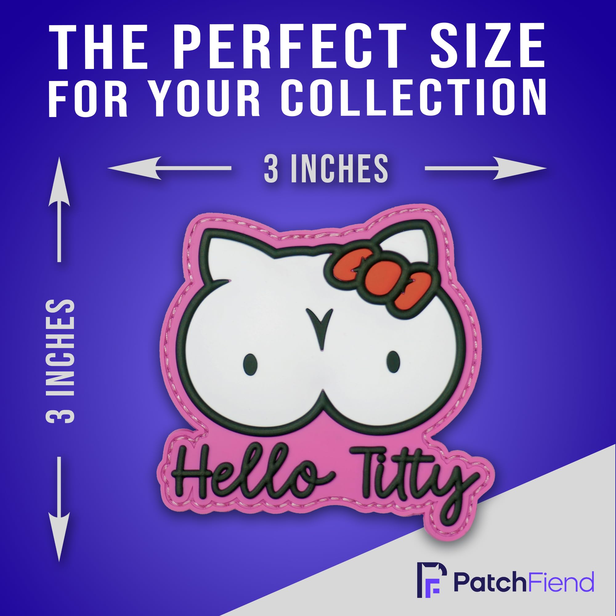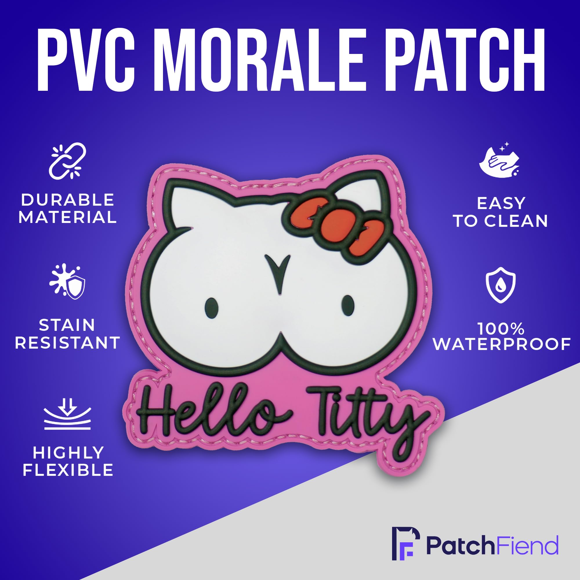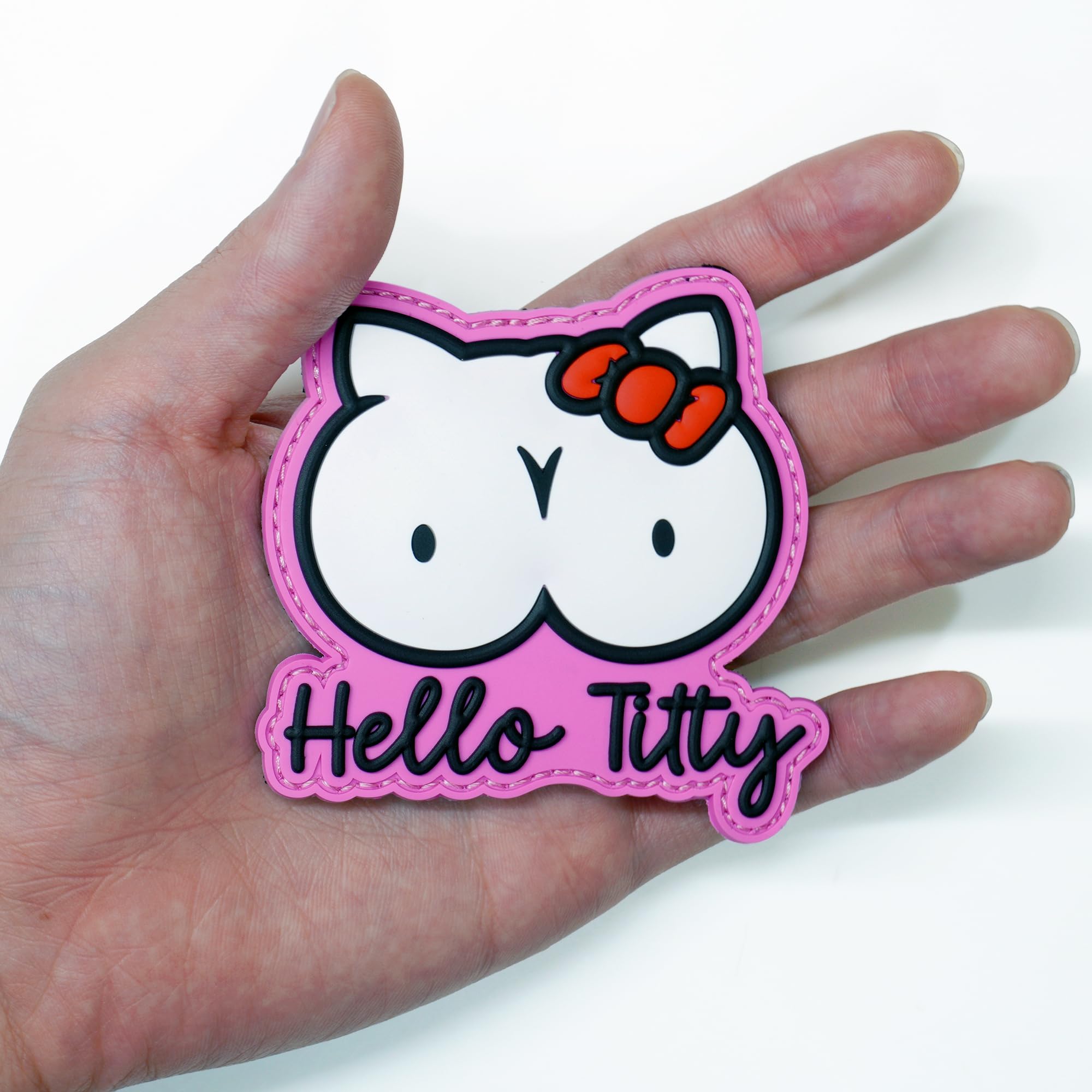 Uniquely Amusing Design: Stand out with this hilarious "Hello Titty" PVC morale patch, a witty parody that reimagines a classic character with a playful, adult twist. Perfect for those who appreciate a good laugh and want to add a touch of edgy humor to their gear.