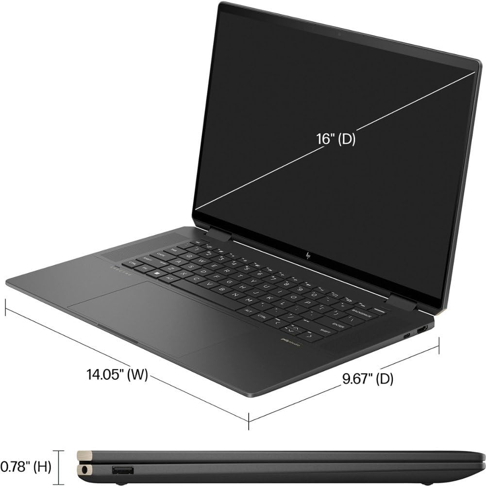 Disclaimer: We specialize in computers with customized configurations. The factory box may be opened to install the upgrades to achieve the specifications as advertised. The modified product is professionally tested and resealed. PC Series: HP Spectre x360 2-in-1 Laptop Display: 16" 120Hz WQXGA (2560 x 1600) IPS Touchscreen Anti-Glare 400 nits, edge-toedge glass, micro-edge, Corning Gorilla Glass NBT, Low Blue Light, 100% sRGB Thin Bezel LCD Processor: Intel Evo Ultra 7 155H 16-Core (Base Clock 2.4GHz, Up to 4.8GHz with Intel Turbo Boost Technology, 24 MB Intel Smart cache, 16 cores, 22 threads) Graphics: Intel Arc Graphics Memory: Upgraded to 16GB LPDDR5 4800 MHz SDRAM Storage: Upgraded to 1TB NVMe M.2 SSD Keyboard: Backlit Keyboard Fingerprint Reader. Communications: Intel Wi-Fi 6E AX211 (2x2) and Bluetooth 5.3 Camera: HP 9MP IR camera with E Shutter Audio: Poly Studio with quad speakers Operating system: Windows 11 Pro Ports & Slots: 2x USB Thunderbolt 4 / USB4 40Gbps Type-C support Power Delivery / DisplayPort / Power-off Charging through USB Type-C, 1x USB 3.2 Gen 2 Type-A support Power-off Charging / 10Gbps, 1x HDMI 2.1, 1x Headphone/Microphone Combo Jack, 1x USB-C Power Jack Battery: 6 Cell 83Wh, (Up to 12hours non-gaming battery life). Size and Weight: 14.05 x 9.67 x 0.78 inches, 4.3 lbs Color: Nightfall Black 100W AC Adapter, ONT 32GB USB Drive included