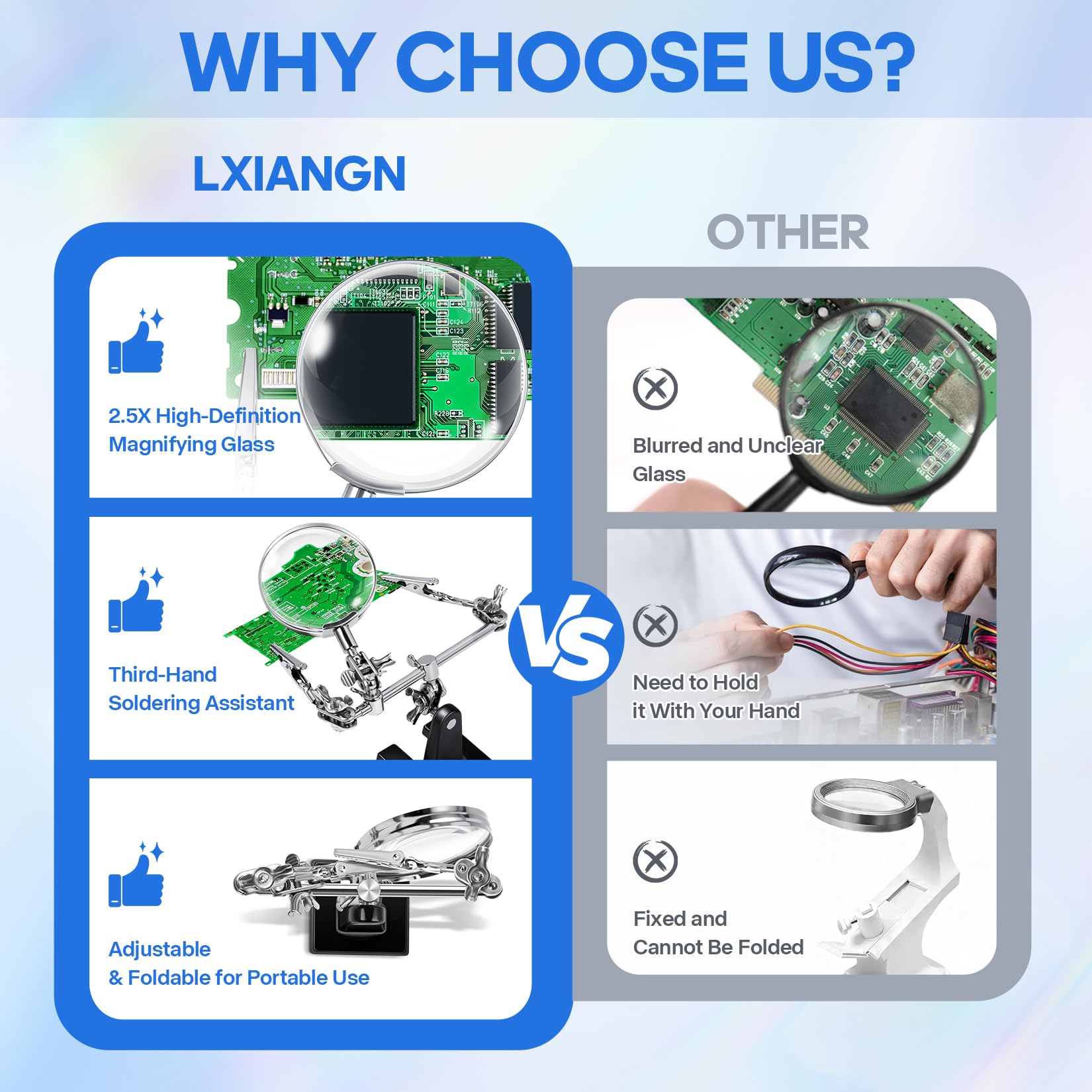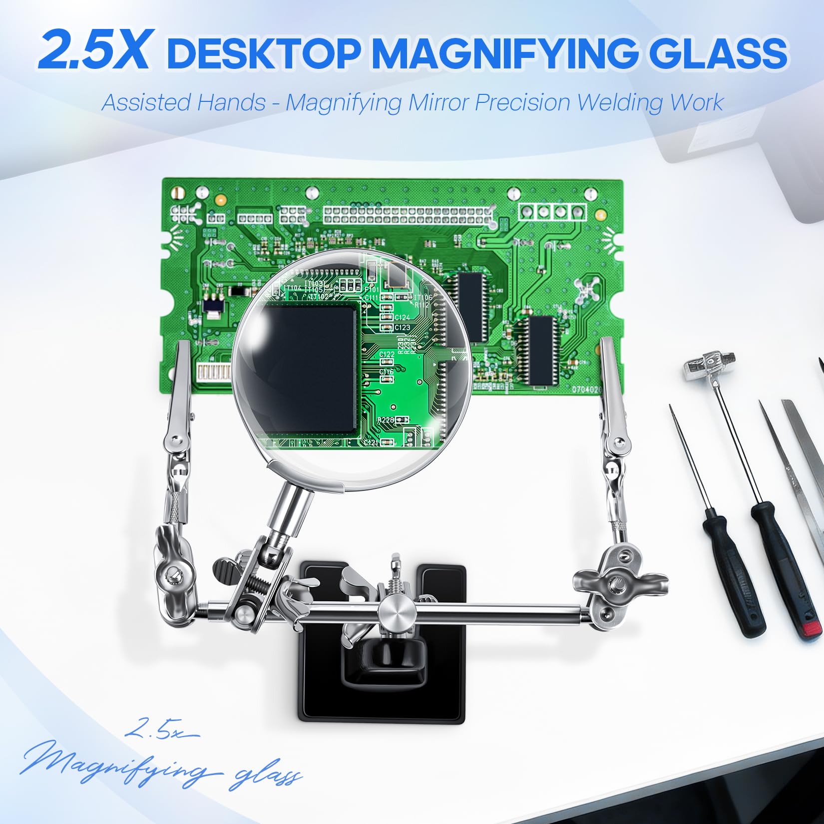 2.5X Magnifying Glass for Precision Work – The 63mm diameter lens provides 2.5X magnification, offering a clear, wide-angle view for detailed soldering, circuit board repairs, jewelry making, and miniature crafts.