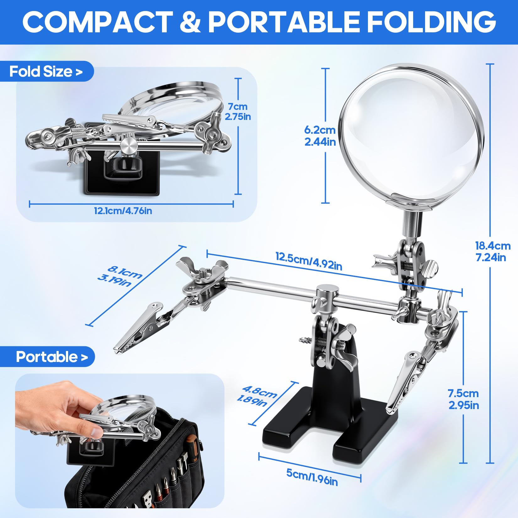 360° Adjustable Arms & Alligator Clips – Flexible swivel joints allow full rotation of the magnifier and dual alligator clips, letting you position them at any angle for optimal control over small components.