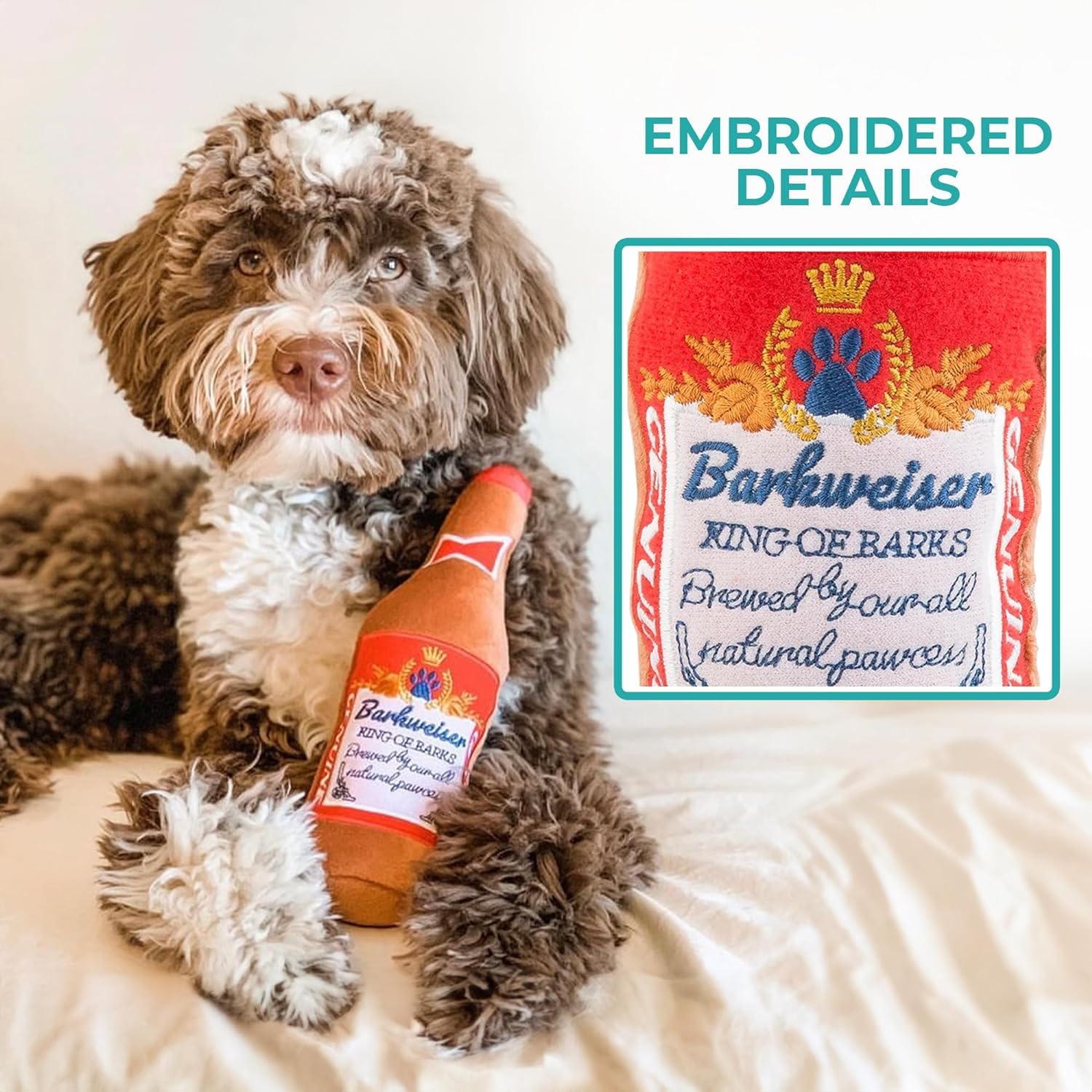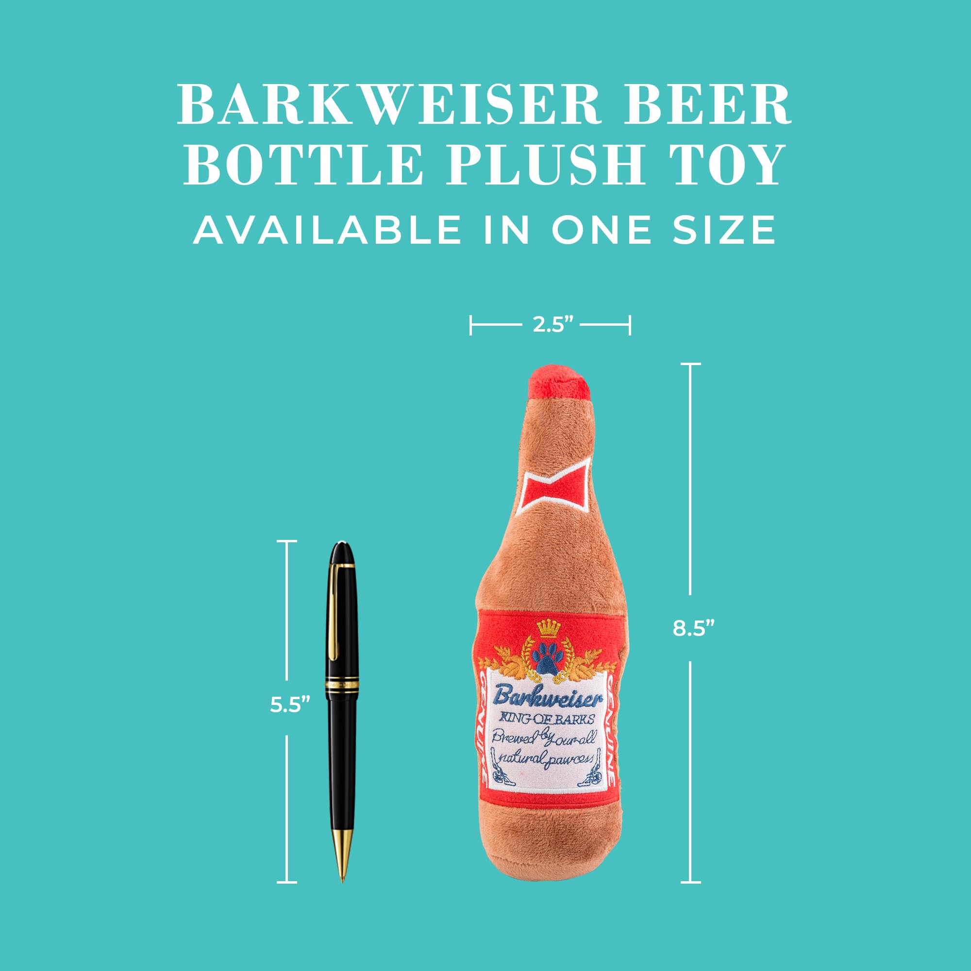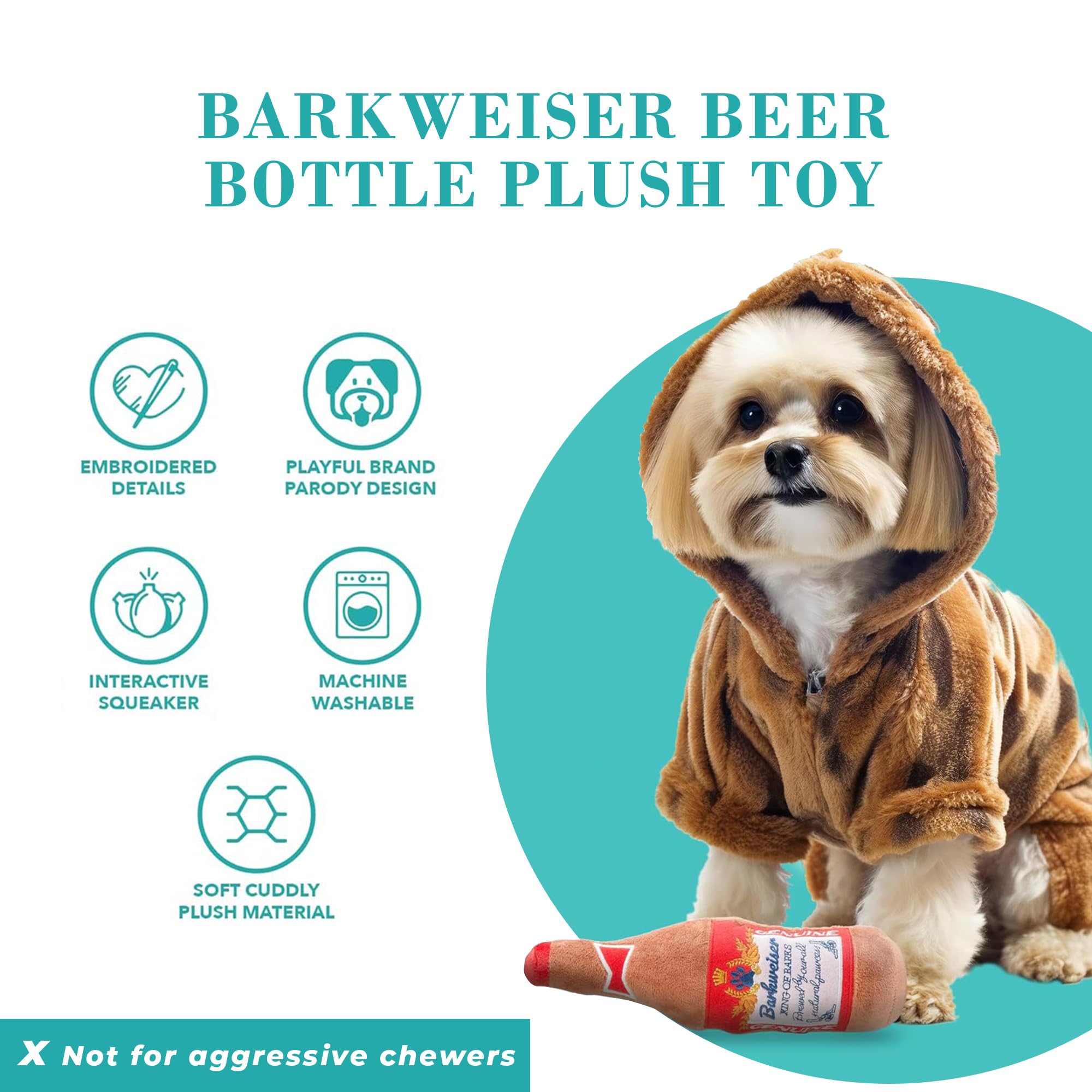 Funny Parody Plush Dog Toy: Time to treat your good boy to a cold boy with our Barkweiser Beer Bottle dog toy. This dog toy features a brown plush exterior with a built-in squeaker hidden inside. Embroidered accents read “Play Responsibly”. It’s a fun, cute interactive dog toy that turns every playtime into happy hour! One Size 8.5"x4"x2.5".
