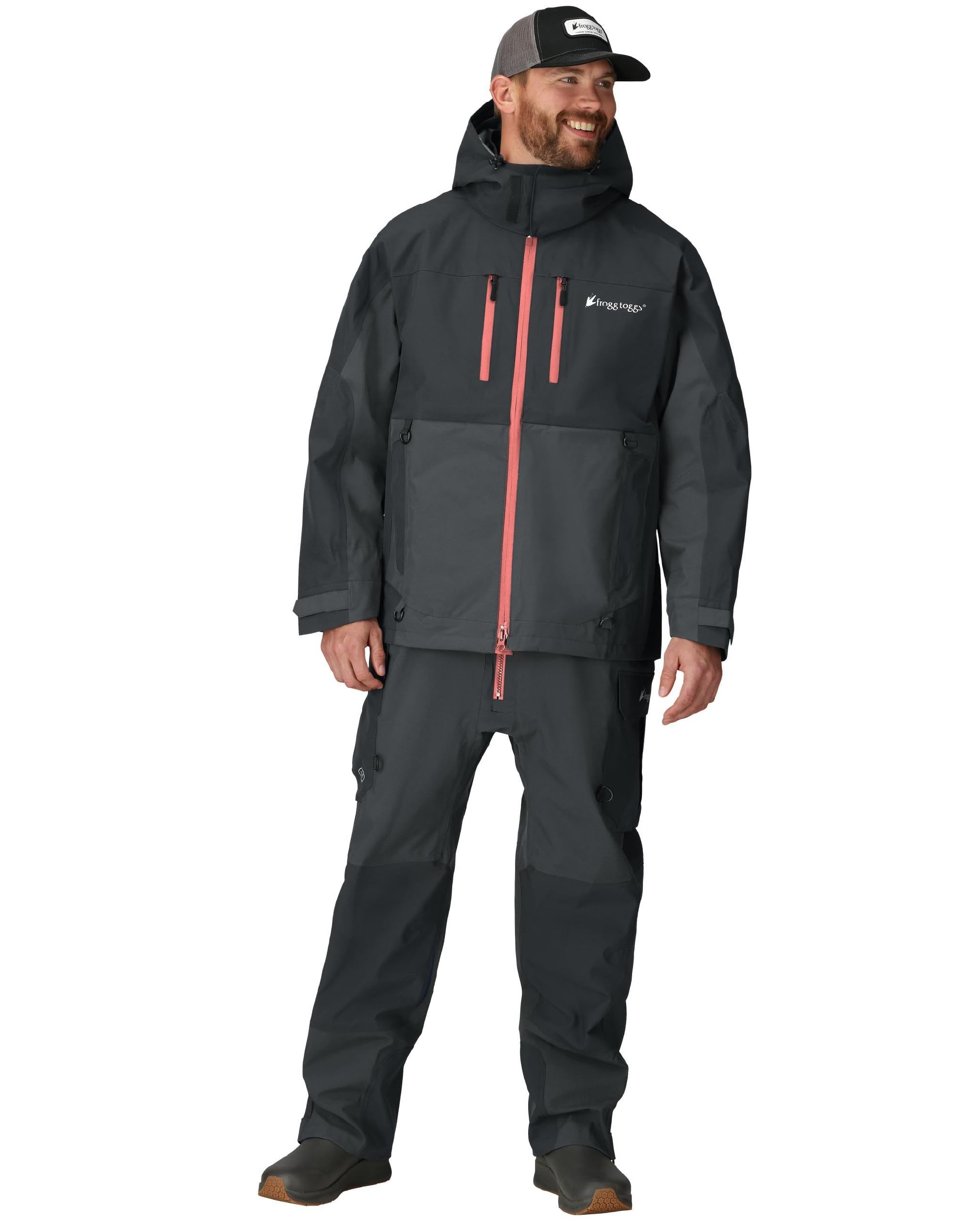 Zip-to-knee side zips and the adjustable hook-and-loop leg openings allow pants to slide on and off easily over rain boots or shoes