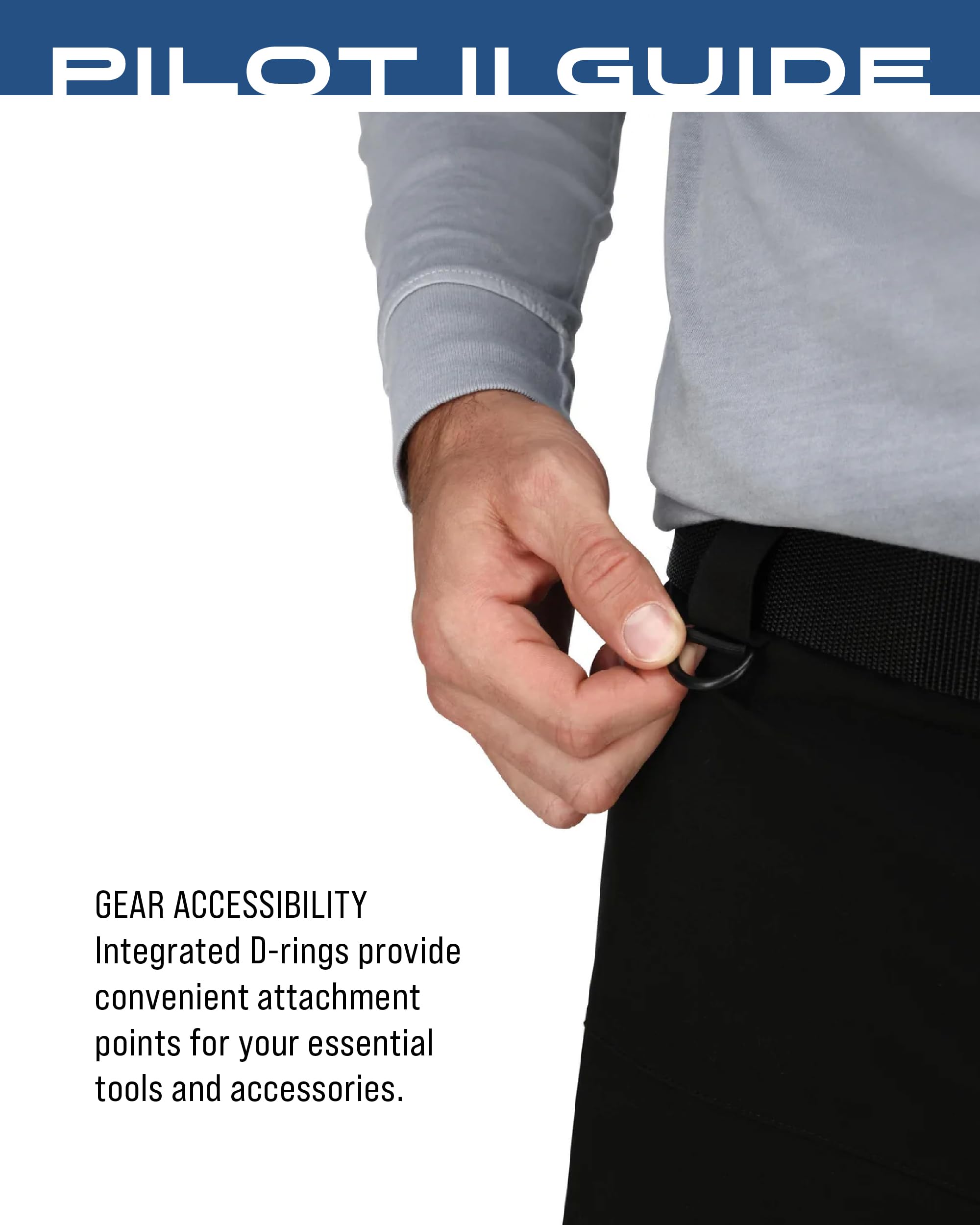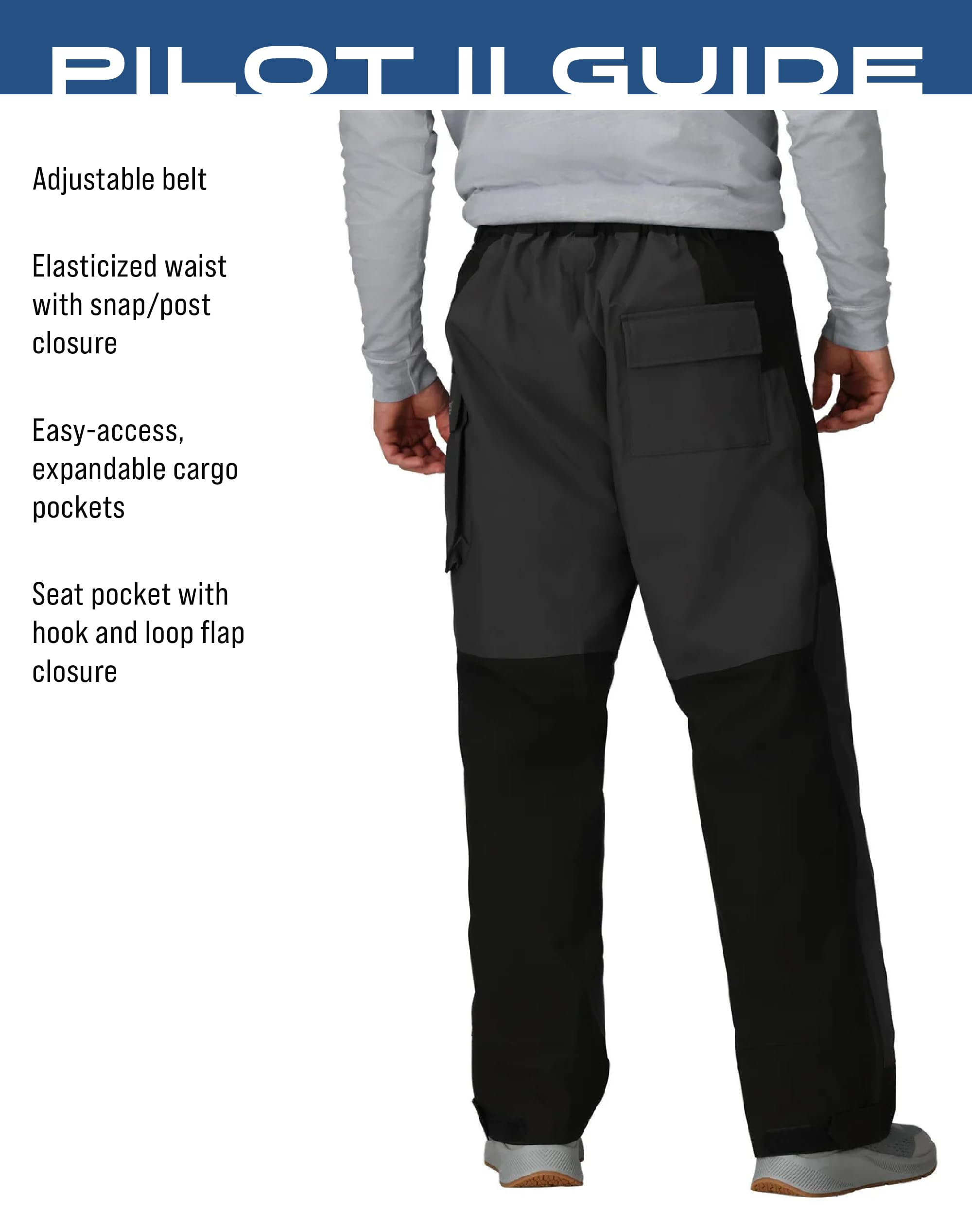 Description The Frogg Toggs Pilot II Guide Pant is water-resistant wade wear perfect for fishing and hunting. The pants feature a locking web belt ensures a comfortable and secure fit. The quick-drain, expandable cargo pockets provide ample storage four outdoor essentials. Zip-to-knee side zips for easy on/off allow the wearer to easily slip the guide pant over their everyday apparel. Adjustable leg openings allow the pants to slide easily over rain boots or shoes.