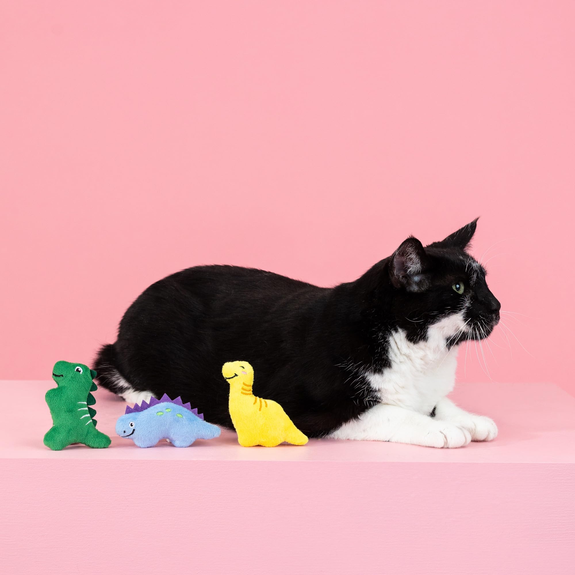 Perfect for cats of all sizes, Each toy is approximately 3” x 3” ( GREEN DINO: 3.5" x 3", YELLOW DINO: 3.5" x 3.5", BLUE DINO: 2" x 4")