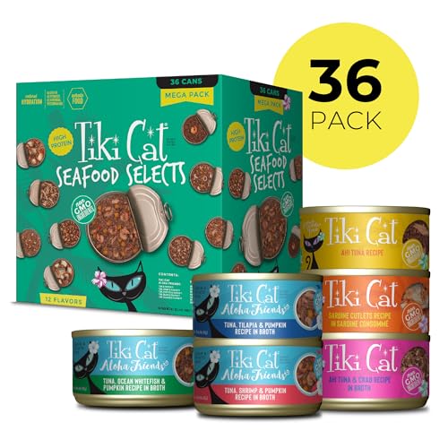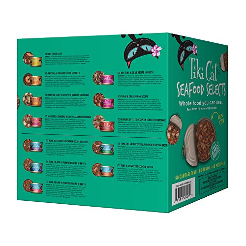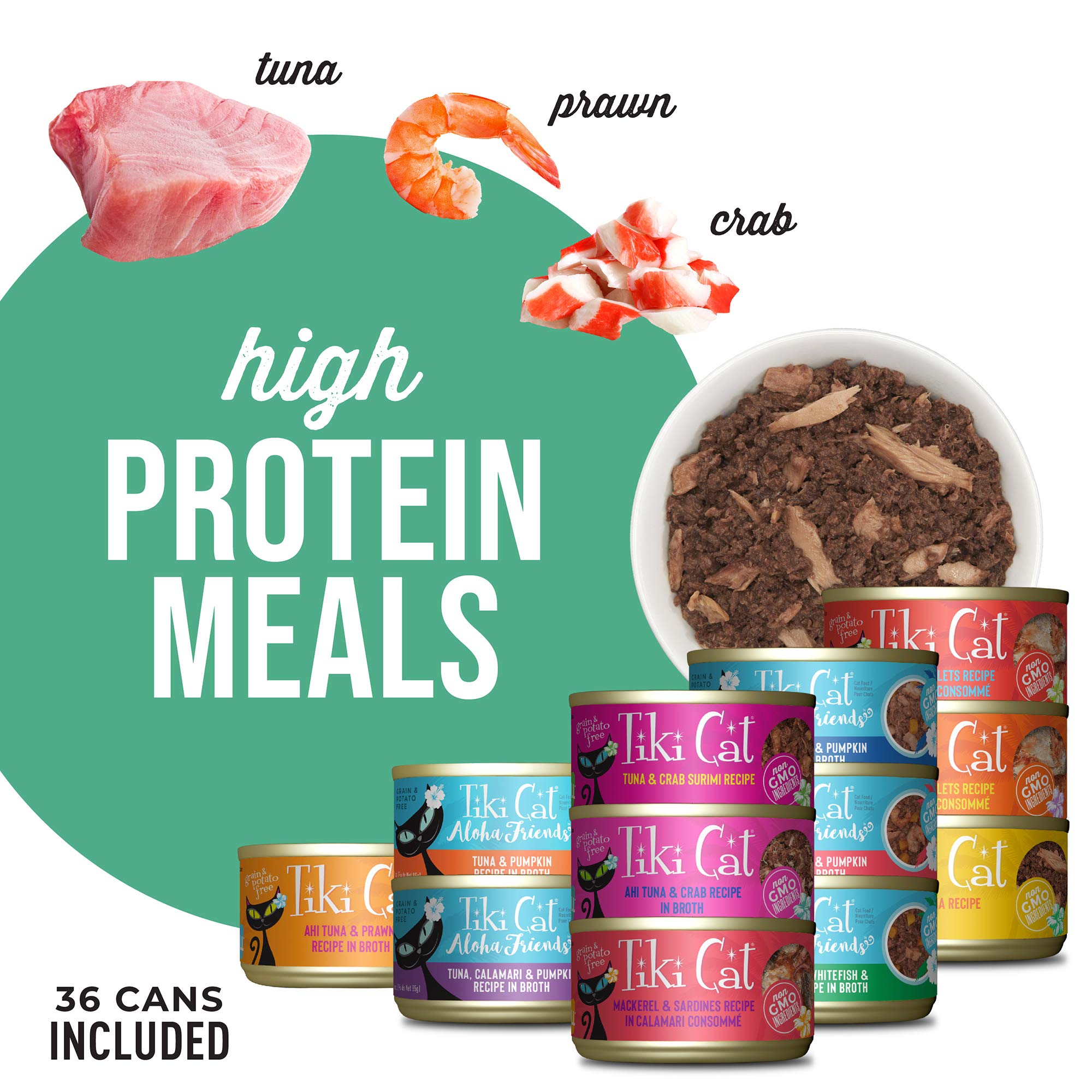The ultimate variety pack for cats! The Tiki Cat Fish Favorites Mega Pack is perfect for multi-cat households or those who simply prefer less shopping trips. Tiki Cat Fish Favorites Mega Pack features 36 servings of the high-protein, high-moisture nutrition cats need as carnivores. Delight your cat with a new fishy flavor at each meal! 18 servings are Tiki Cat Aloha Friends™ Recipes, which feature wild-caught ahi tuna as the first ingredient, plus pumpkin to aid digestion. Included Aloha Friends recipes are: (5) Tuna & Pumpkin Recipe in Broth (5) Tuna, Shrimp & Pumpkin Recipe in Broth (3) Tuna, Tilapia & Pumpkin Recipe in Broth (3) Tuna, Ocean Whitefish & Pumpkin Recipe in Broth (2) Tuna, Calamari & Pumpkin Recipe in Broth 18 servings are Tiki Cat Grill, indulgent seafood and fish recipes, with real flaked tuna, sardines, crab and prawn in a savory broth. Included Grill recipes are: (4) Ahi Tuna Recipe (4) Sardine Cutlets Recipe in Sardine Consomme (2) Ahi Tuna & Prawns Recipe in Broth (2) Mackerel & Sardines Recipe in Calamari Consomme (2) Tuna & Crab Surimi Recipe (2) Ahi Tuna & Crab Recipe in Broth (2) Sardine Cutlets Recipe in Lobster Consomme Tiki Cat is the carnivore diet cats were born to eat. As obligate carnivores, cat need meat, not plants. That’s why Tiki Cat foods offer high protein nutrition from real animal protein sources, low carbohydrates, and no grains. Cats also have a naturally low thirst drive, so Tiki Cat wet foods, treats and toppers are high moisture, offering supplemental hydration. With Tiki Cat, your carnivorous cat gets exactly what their body needs in the exciting flavors and textures they crave!