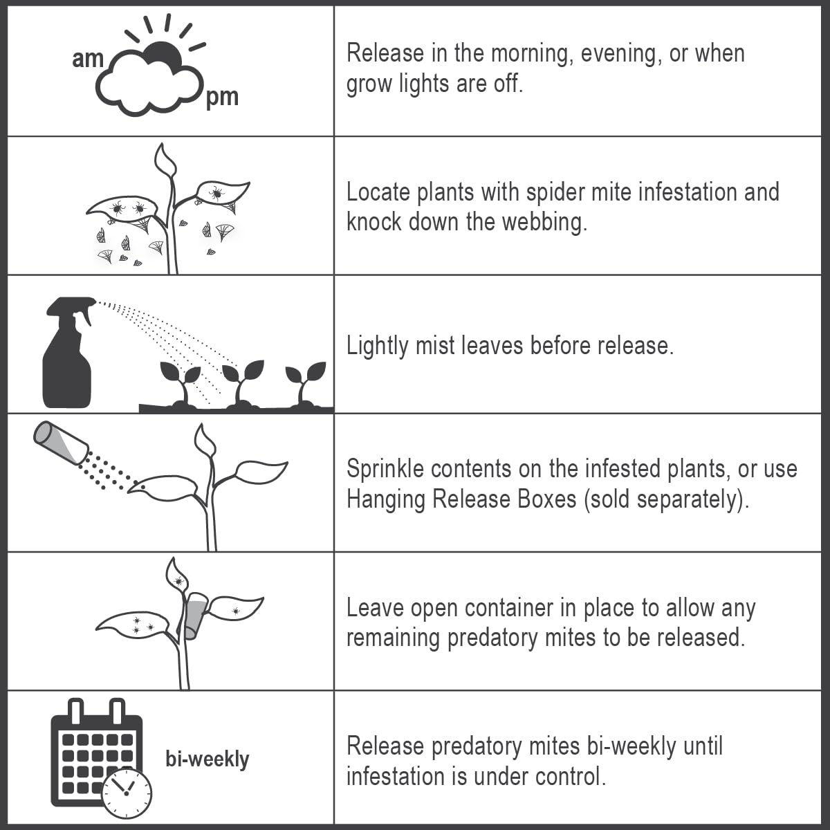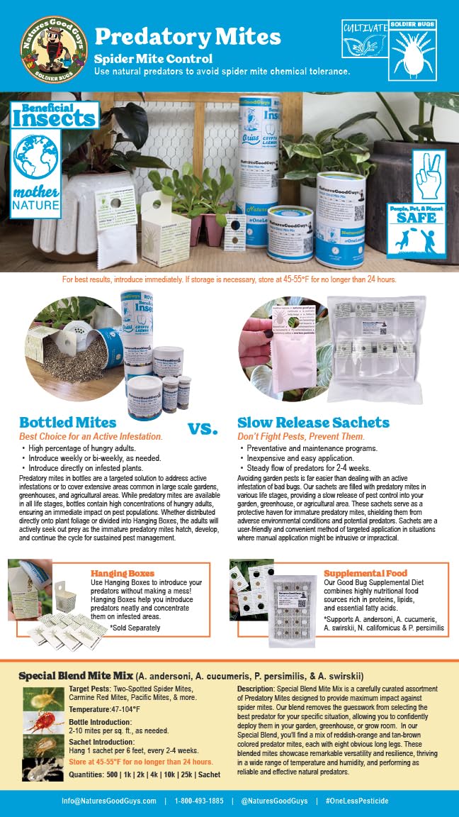 Our Special Blend Mites are natural enemies to: Two Spotted Spider Mites, Broad Mites, Rust Mites, Russet Hemp Mites, Cyclamen Mites and Southern Red Mites and other species of mites. PRODUCT INFORMATION: Special Blend mites and Spider mites are natural enemies. Special Blend Mite, normally consisting of an assortment of the following predatory mites; A.cucumeris, N. californicus, P. persimilis, A. andersoni, and A. swirskii. Special Blend is best used in unknown environments/growing conditions. Our Special Blend takes the guess work out of which mite should be used in your Garden, Green House, or Grow Room. You will see a mixture of bright reddish orange, colored mites with obvious long legs. These mites can tolerate temperatures up to 105°F., but do best in temperatures between 60°F-85°F. They do well in humidities ranging from 40%-90%. To raise the humidity level, you can lightly mist the plants or surrounding walkways. Storage: If storage is necessary, store in a cool, dark place for no more than 18 hours. Safe to use around humans and pets. Release Rates: 4 mites per sq. ft., bi-weekly, 2-3 times. Increase release rates may apply depending on the crop and infestation.
