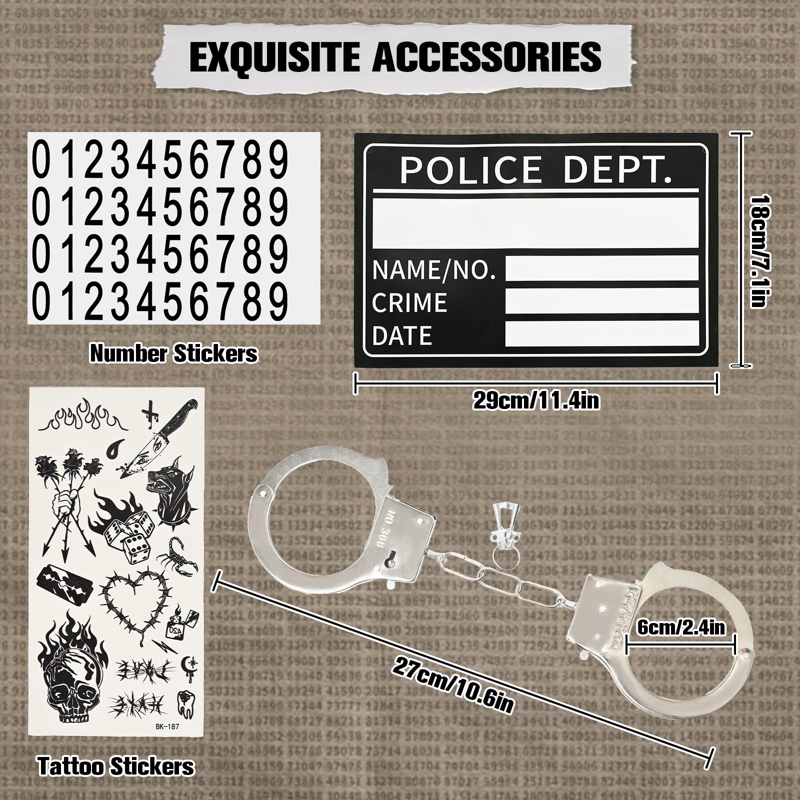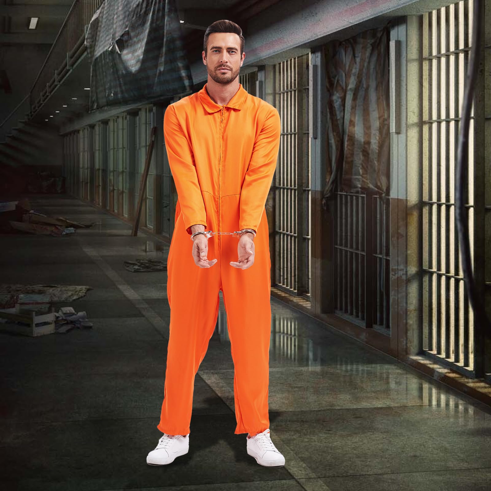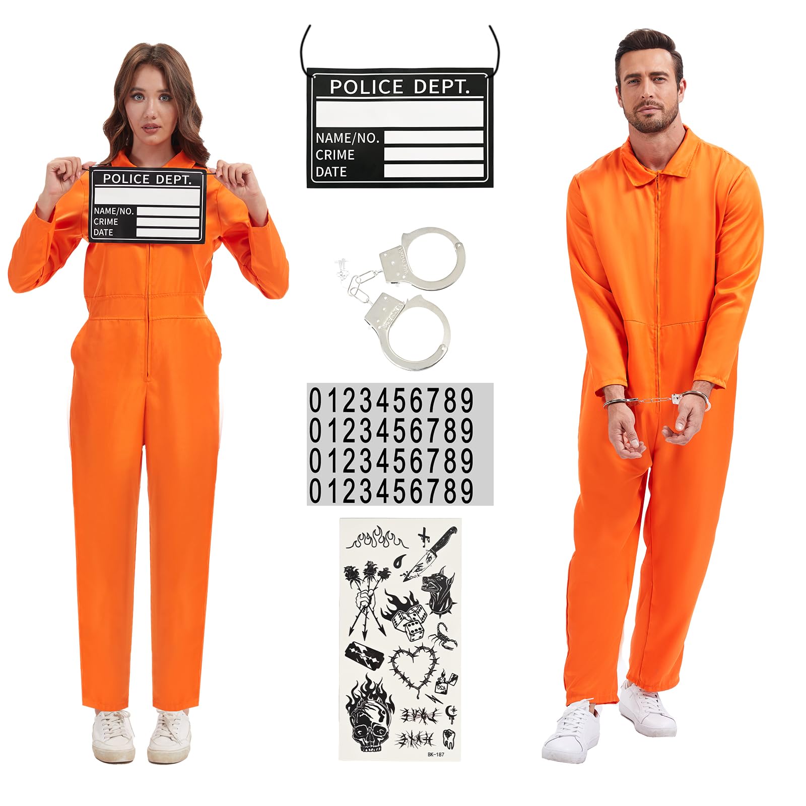 orange prisoner set: Includes 1 Pcs jumpsuit, 1 pair of handcuffs, 2 tattoo stickers, 1 number sticker, 1 name tag.