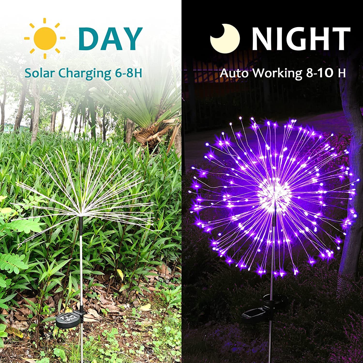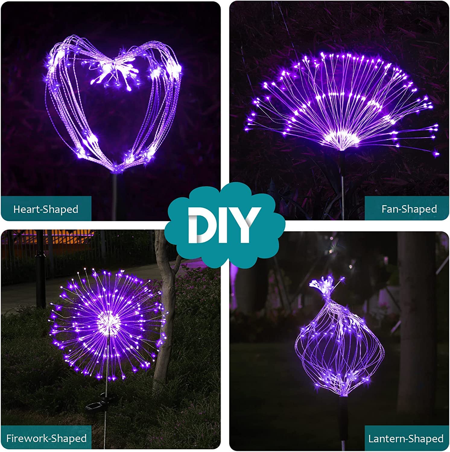 【Creative Solar Garden Lights】2 Pack, Each stake has 150 LEDs distribution in 50 branches copper wire, 2 lighting modes ( twinkling / steady on). Solar firework light is made of flexible copper wire with bright LED beads, and you can bend any shape you want to decorate pathway yards garden patio