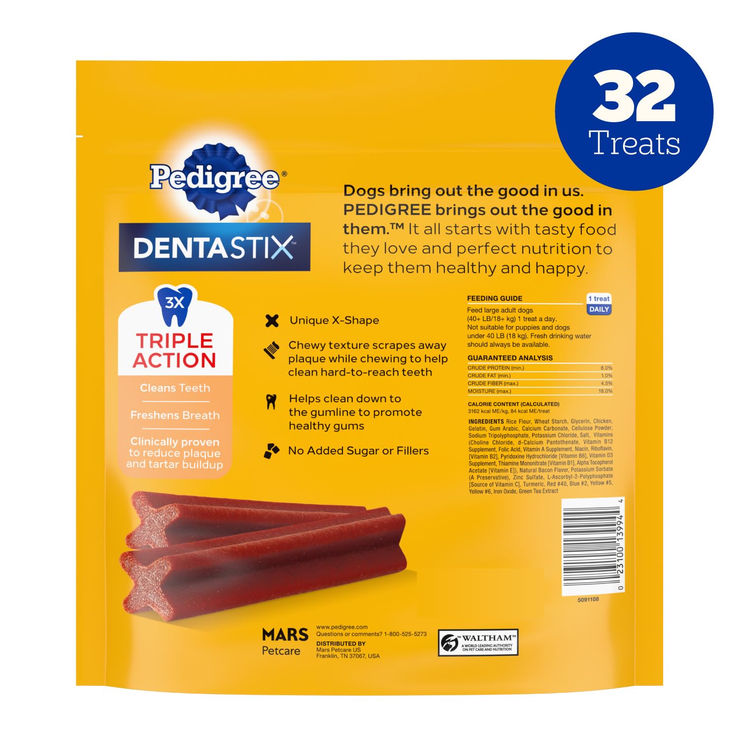 Dogs bring out the good in us. Pedigree brings out the good in them. With Pedigree Dentastix Large Breed Dog Dental Care Treats Bacon Flavor, a dental treat and oral care product, you can provide your dog with a tasty dental care treat as part of pet care and support daily dental health at home. These dental sticks for dogs are formulated with no added sugar or fillers and can be served once a day to large breed dogs that are 40+ lbs., fitting a daily routine for big dog breeds and large dogs. Pedigree Dentastix is a pet dental chew and canine chew designed with a distinctive X-shape and a chewy texture that scrapes away plaque while your dog chews for plaque removal, cleaning hard-to-reach areas around teeth for clean teeth and oral hygiene. With triple action that cleans teeth, provides breath freshening for fresh breath for their dog, and supports tartar control by reducing tartar buildup, this supports dental hygiene for the dog owner, pet parent, dog lover, and dog parents focused on dog health. These dog treats for bad breath can also be used as a reward or training treat to satisfy chewing instinct. This tasty bacon-flavored treat makes dog dental care treats for your large breed dog not only beneficial but also delicious.